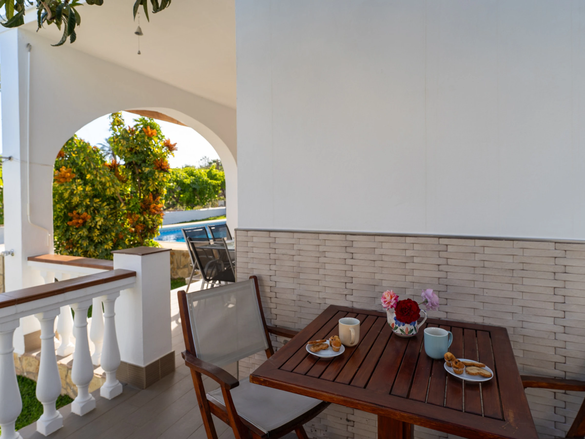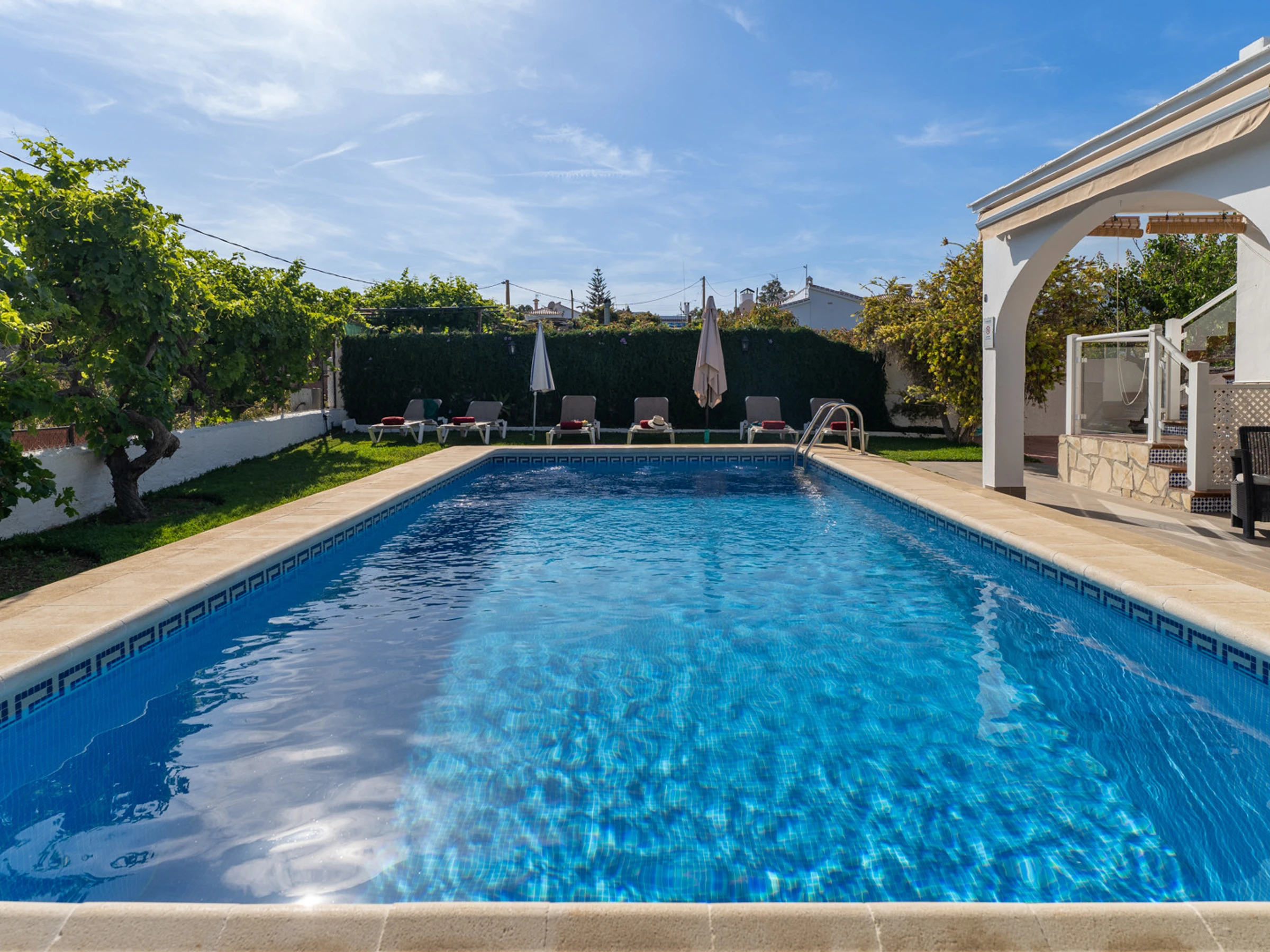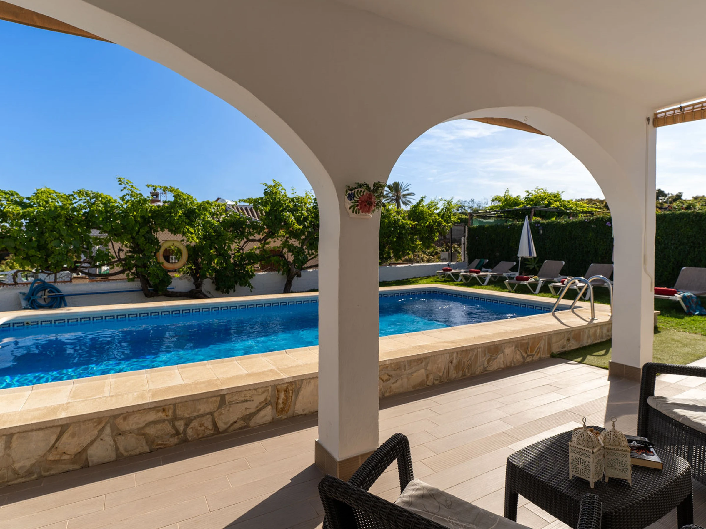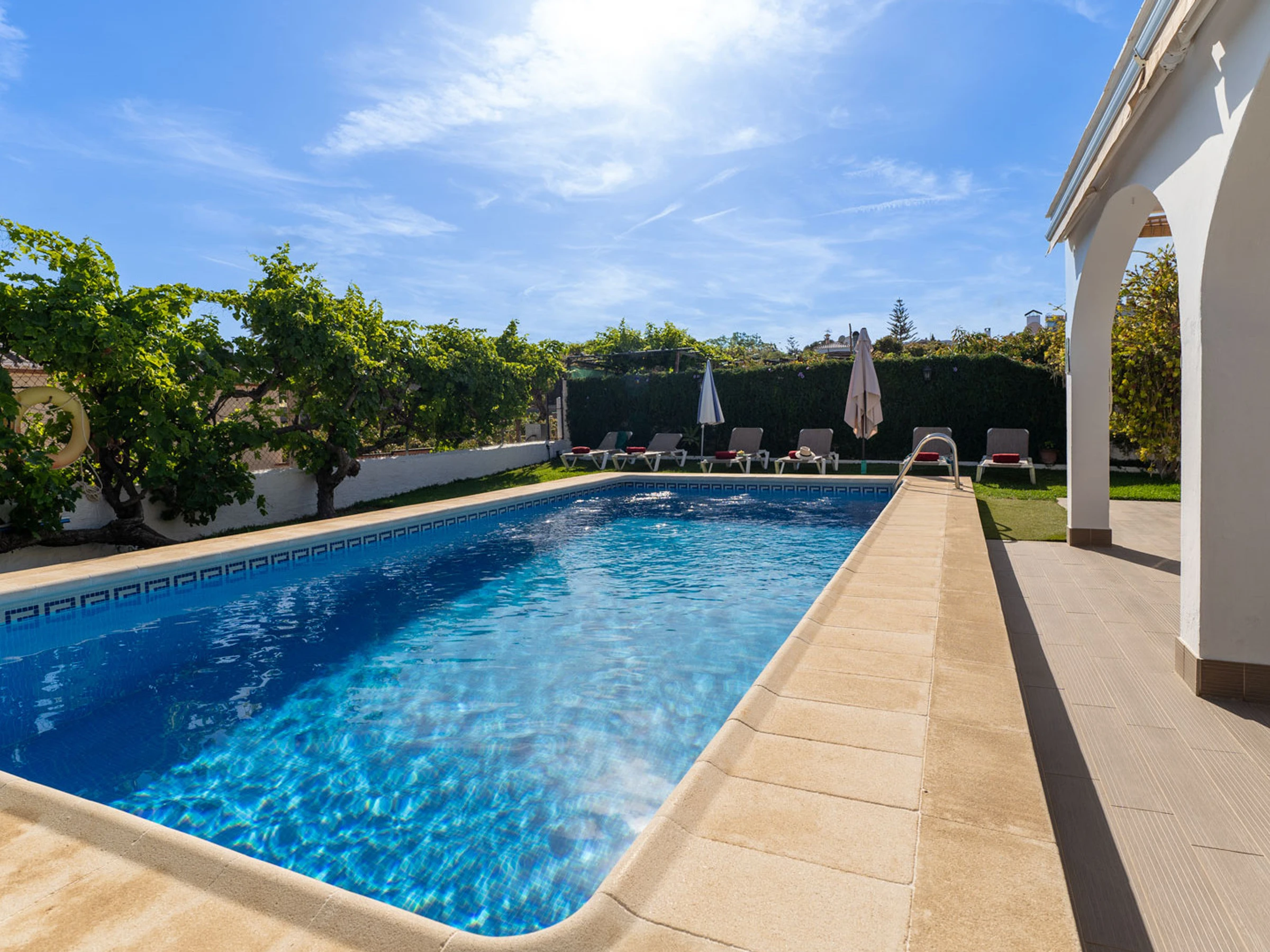 Diese Villa hat ein erfreuliche, fast ländliche Lage 2 km von Nerja entfernt. Sie beschert inspirierende Ausblicke auf die friedvolle Umgebung und verspricht einen sorglosen Urlaub. Gleich in der Nähe befindet sich eine panificadora (Großbäckerei), und der Lidl-Supermarkt ist nur 800 m entfernt. Umgeben von einer weißgetünchten Mauer und grünem Rasen vermittelt es ein Gefühl von absoluter Privatsphäre. Zum Haus gelangt man über eine Parkbucht für zwei Autos und einem von der Frontseite sichtbaren Pfad durch den Garten. Die Einrahmung des Swimmingpools (7x4 m) ist etwas erhöht und von viel Rasen umgeben, der einen idealen Spielplatz für die Kinder bildet. Eine hübsche überdachte Terrasse nimmt die gesamte Front des Hauses ein. Ein gemauerter Grill lädt Sie eventuell dazu ein, sich selbst zu bekochen. Die Dachterrasse mit fabelhaftem Blick auf die Landschaft ist ebenfalls ein idealer Platz für das segensreiche Sonnenbad. Es handelt sich also um eine hochwertige Villa mit einer Lage, in der man sich geruhsam erholen, aber auch die Attraktionen der in der Nähe liegenden Ortschaft Nerja genießen kann.