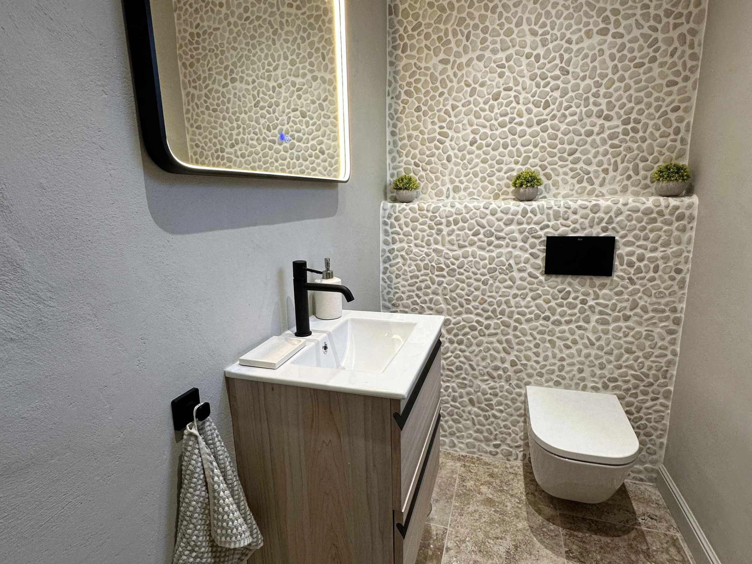 Die Aufteilung des Hauses ist auf den Komfort von vier Personen ausgelegt. Beim Betreten des Hauses steht ein praktisches Gäste-WC für die Gemeinschaftsbereiche zur Verfügung. Auf der linken Seite befindet sich das erste Schlafzimmer, ausgestattet mit einem hochwertigen Doppelbett und einem eigenen Bad. Das in einem zeitgemäßen und gemütlichen Stil eingerichtete Wohnzimmer geht in eine voll ausgestattete, halboffene Küche über. Auf der anderen Seite des Raums verfügt das zweite Schlafzimmer ebenfalls über ein eigenes Badezimmer und ein Doppelbett. Diese „Doppel-Suite“-Konfiguration gewährleistet, dass jedes Paar oder jeder Gast seinen eigenen privaten Bereich hat, ohne das Badezimmer teilen zu müssen.