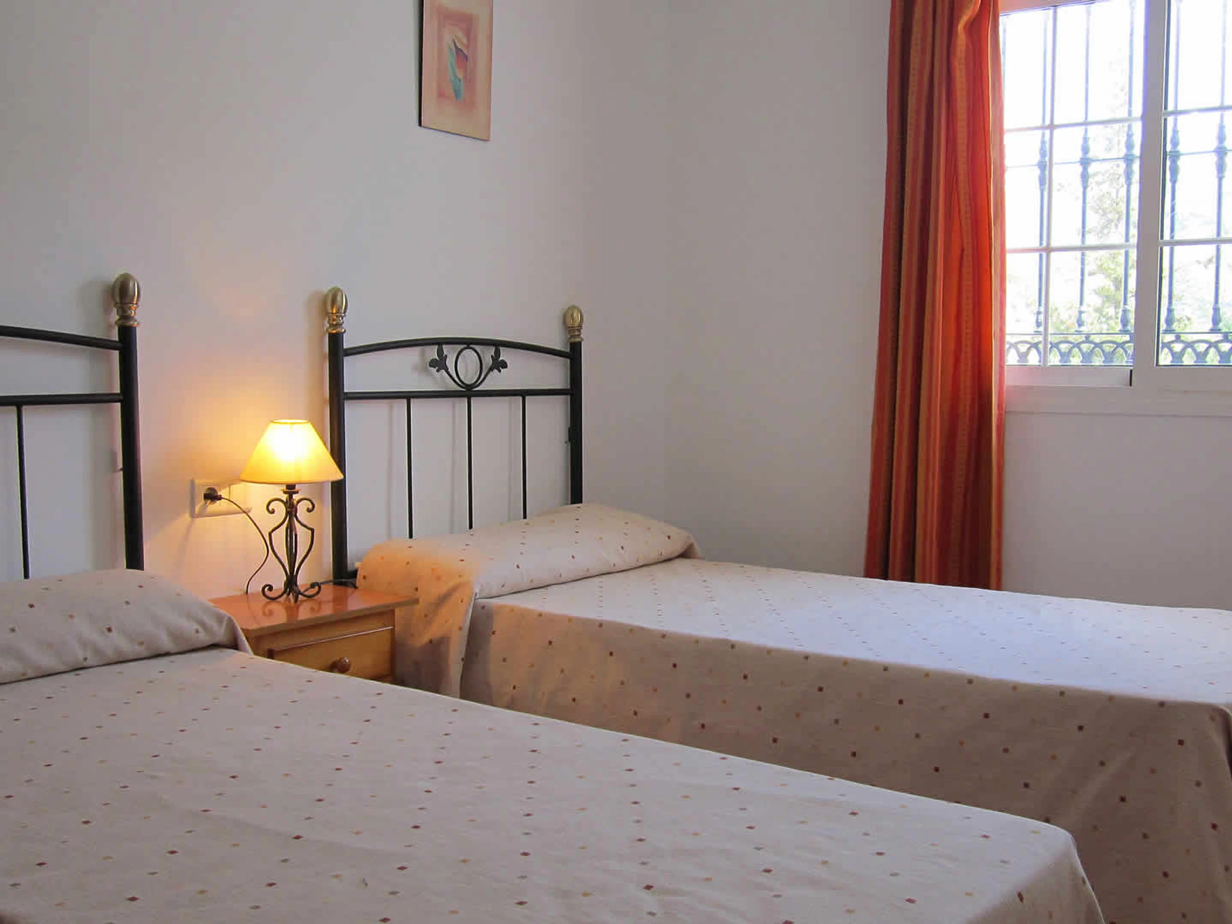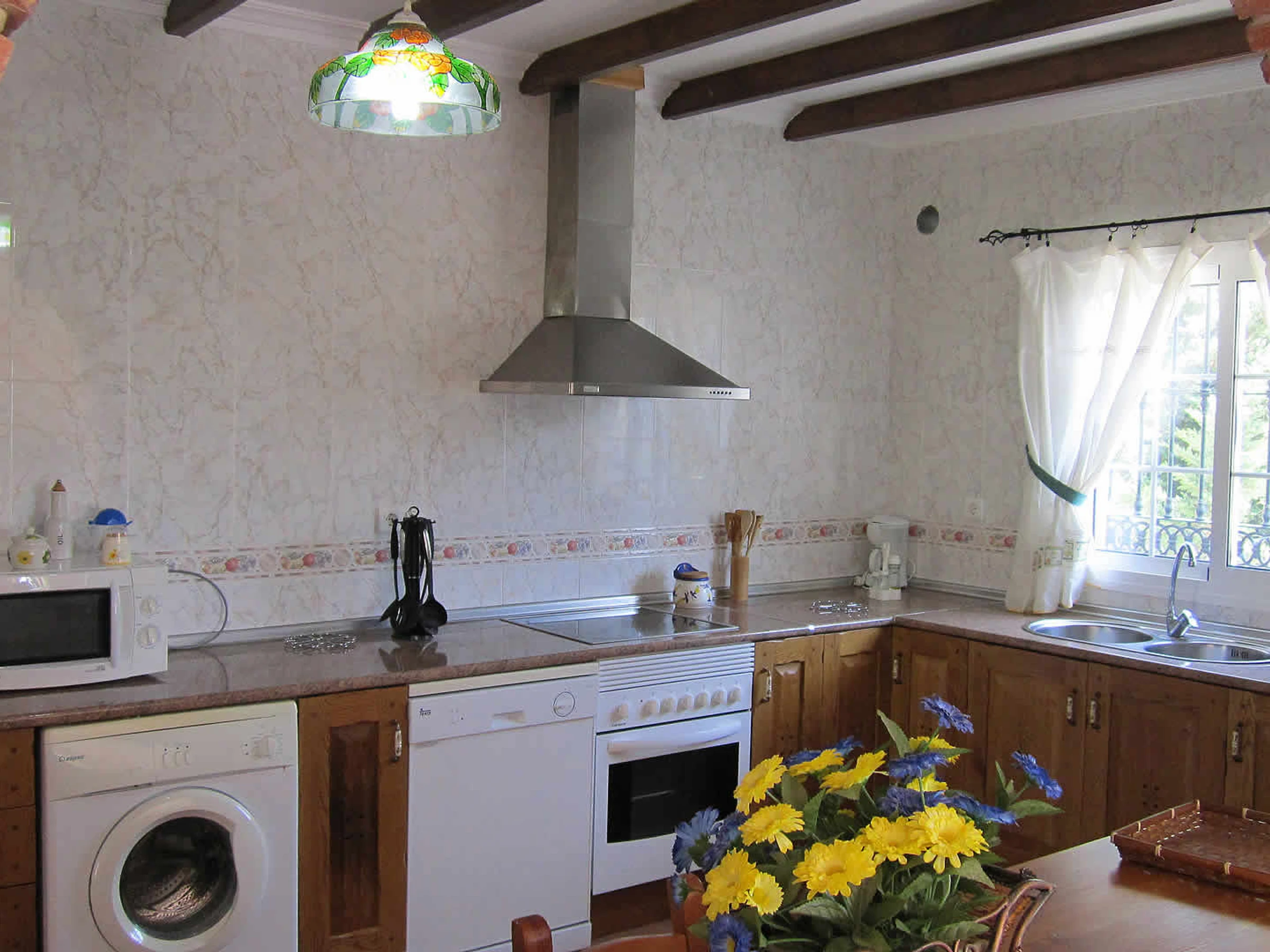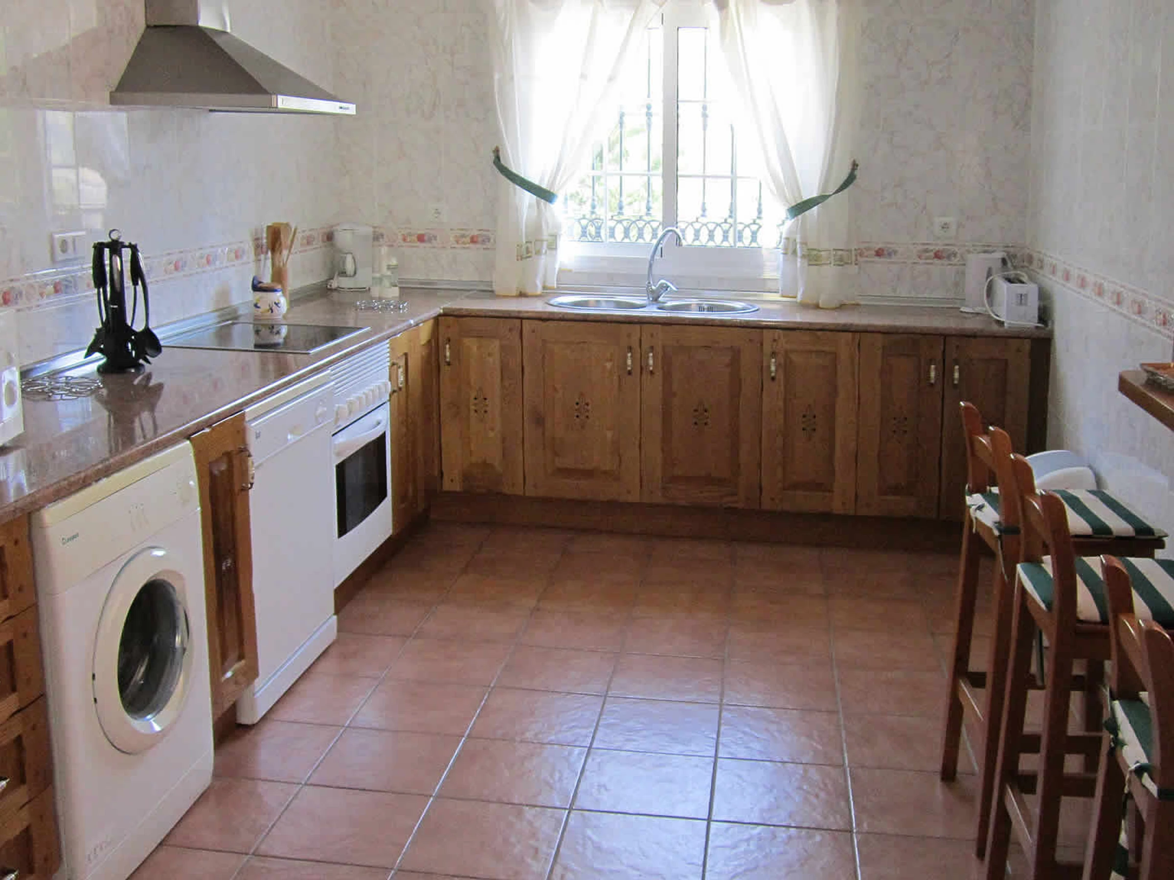 Das Haus ist geräumig, ebenerdig und im klassischen spanischen Stil eingerichtet. Sie hat ein gemütliches Wohn- und Esszimmer mit 2 Sofas, offenem Kamin und Satelliten-Fernseher. Eine Frückstücksbar trennt die gut ausgestattete Küche vom Wohnzimmer. Diese besitzt ein Ceran-Kochfeld, einen elektrischen Backofen, Mikrowelle, Kühlschrank mit Tiefkühlfach, Waschmaschine und Geschirrspüler. Das Hauptschlafzimmer hat ein Doppelbett, ein Badezimmer mit Badewanne/Dusche, Waschbecken und WC. Das zweite Doppelschlafzimmer besitzt ein Badezimmer mit Dusche, Waschbecken und WC. Das 3. und das 4. Schlafzimmer haben jeweils zwei Einzelbetten. Ein drittes Badezimmer mit Badewanne/Dusche, Waschbecken und WC ist für die gemeinsame Nutzung gedacht.