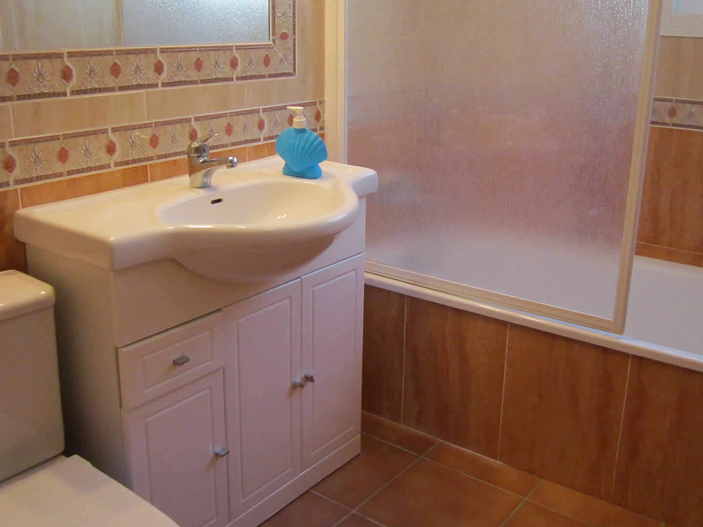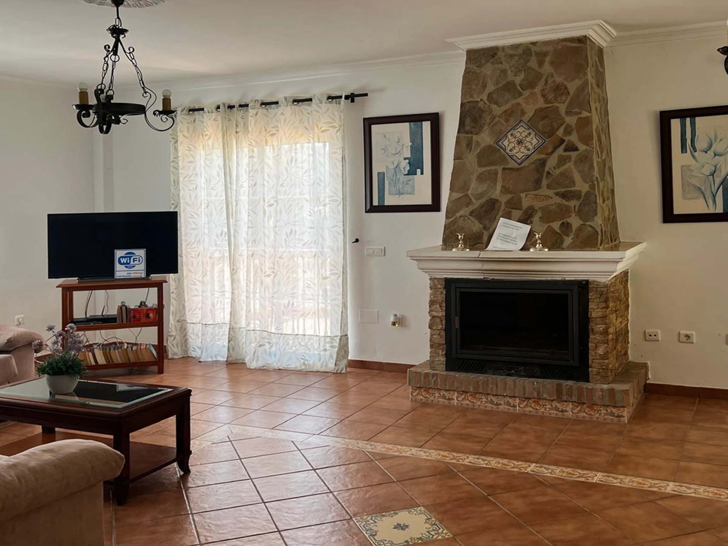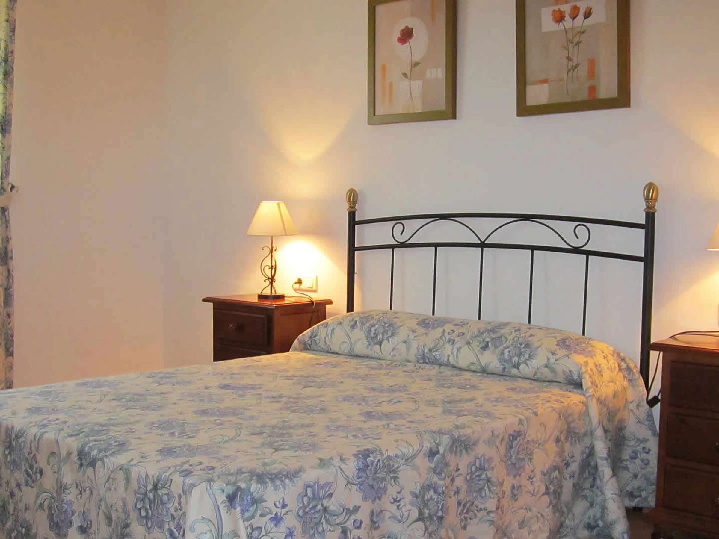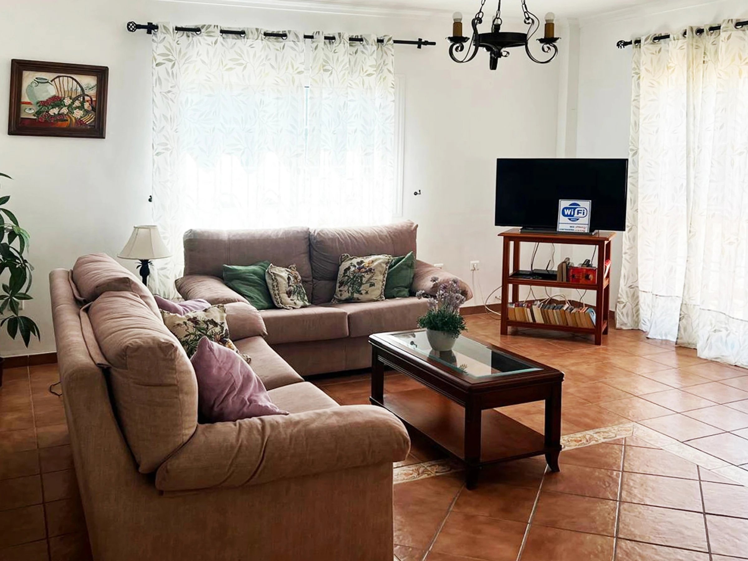 Das Haus ist geräumig, ebenerdig und im klassischen spanischen Stil eingerichtet. Sie hat ein gemütliches Wohn- und Esszimmer mit 2 Sofas, offenem Kamin und Satelliten-Fernseher. Eine Frückstücksbar trennt die gut ausgestattete Küche vom Wohnzimmer. Diese besitzt ein Ceran-Kochfeld, einen elektrischen Backofen, Mikrowelle, Kühlschrank mit Tiefkühlfach, Waschmaschine und Geschirrspüler. Das Hauptschlafzimmer hat ein Doppelbett, ein Badezimmer mit Badewanne/Dusche, Waschbecken und WC. Das zweite Doppelschlafzimmer besitzt ein Badezimmer mit Dusche, Waschbecken und WC. Das 3. und das 4. Schlafzimmer haben jeweils zwei Einzelbetten. Ein drittes Badezimmer mit Badewanne/Dusche, Waschbecken und WC ist für die gemeinsame Nutzung gedacht.