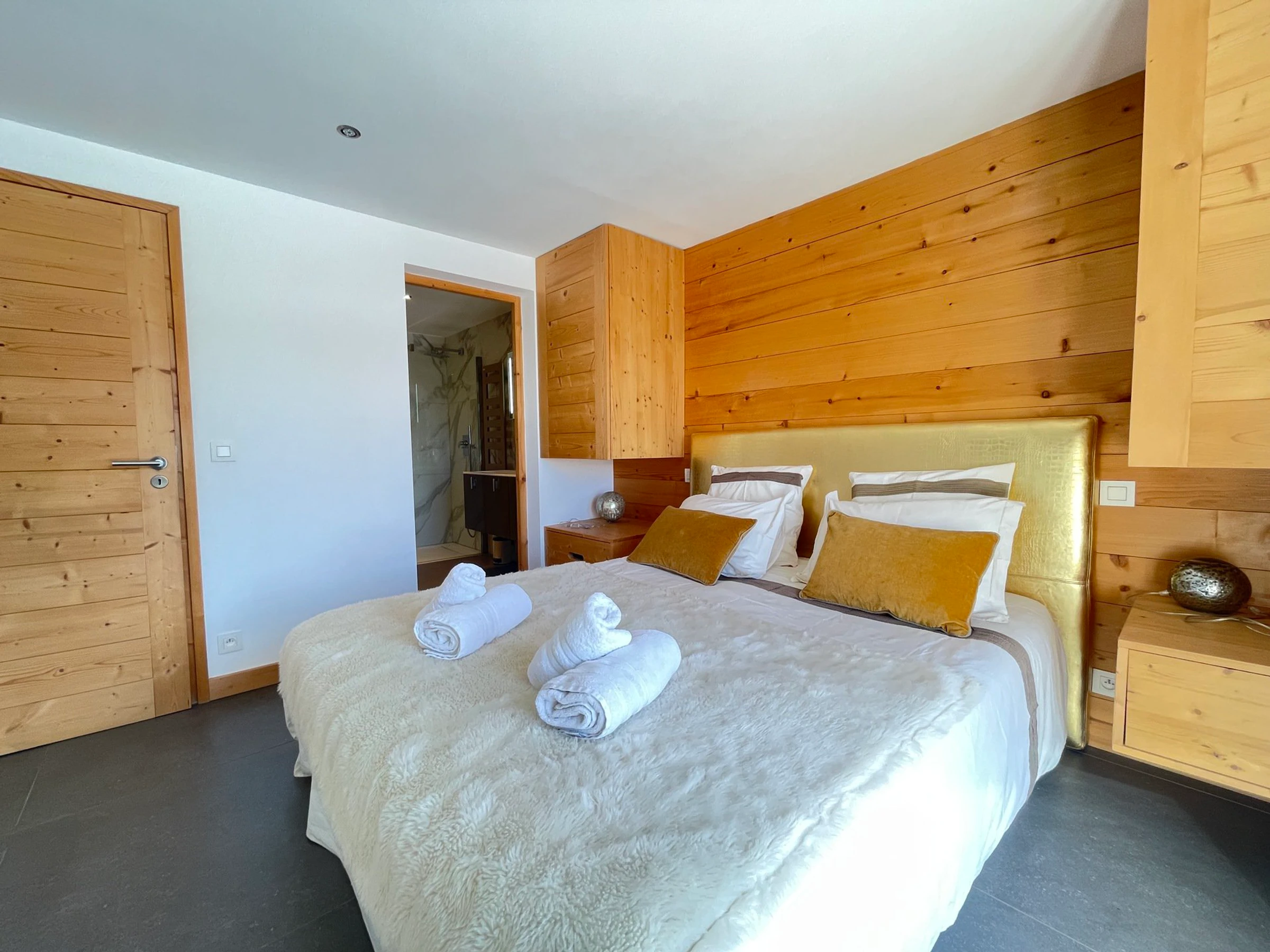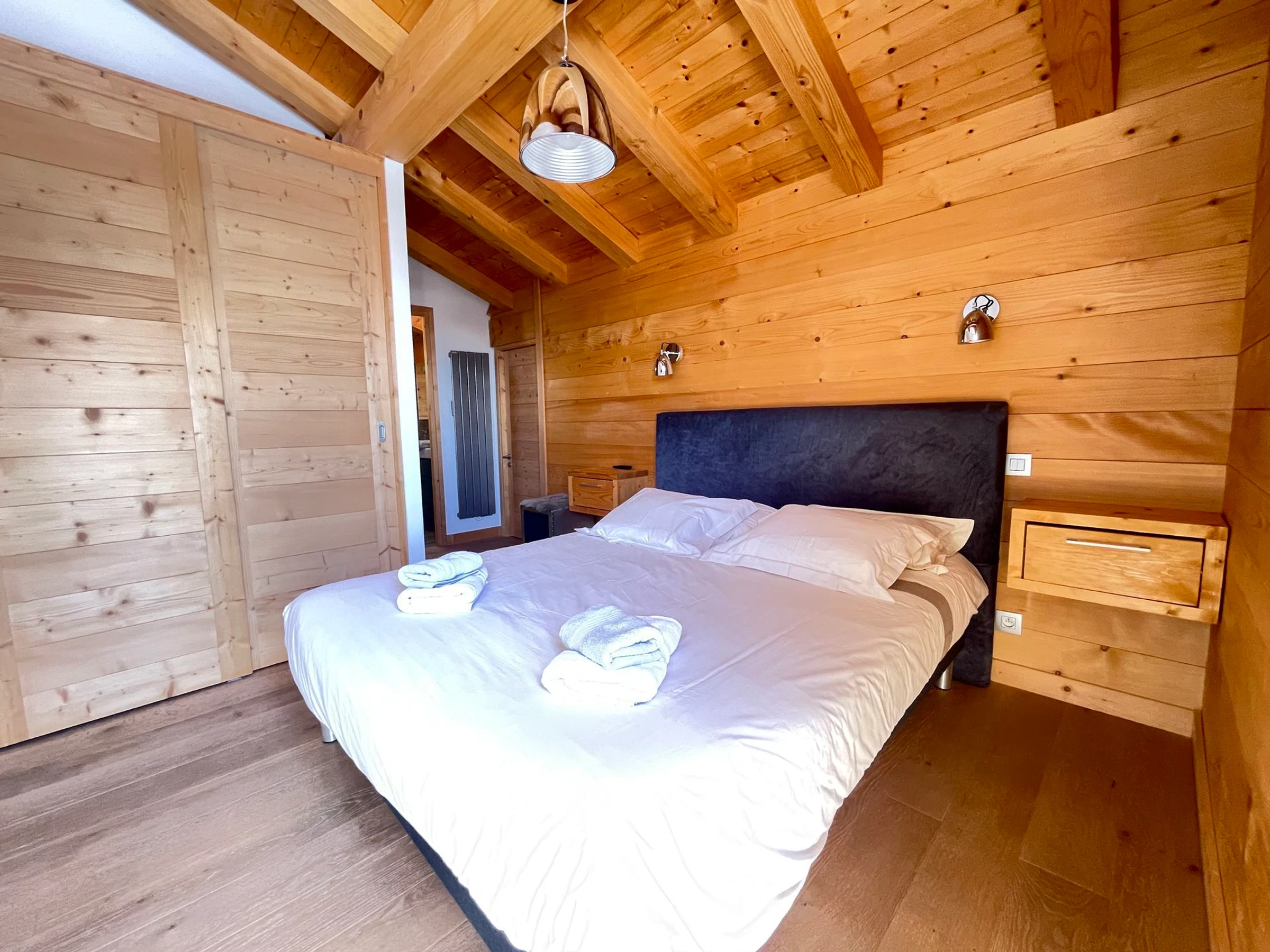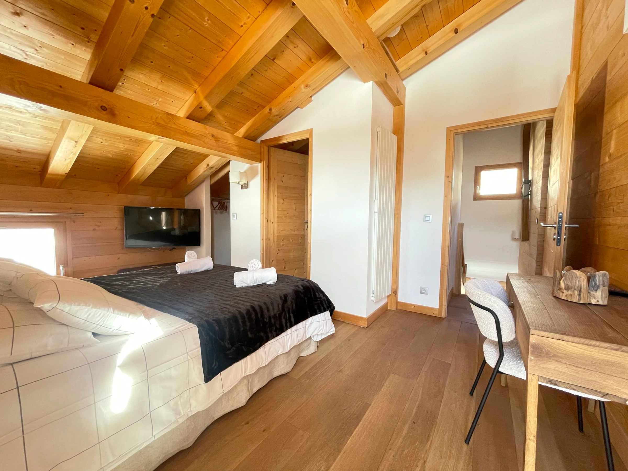 - Ein Doppelzimmer (1x160) mit eigenem Bad, Dusche, WC, Ankleidezimmer mit Safe, Fernseher und Balkonzugang.