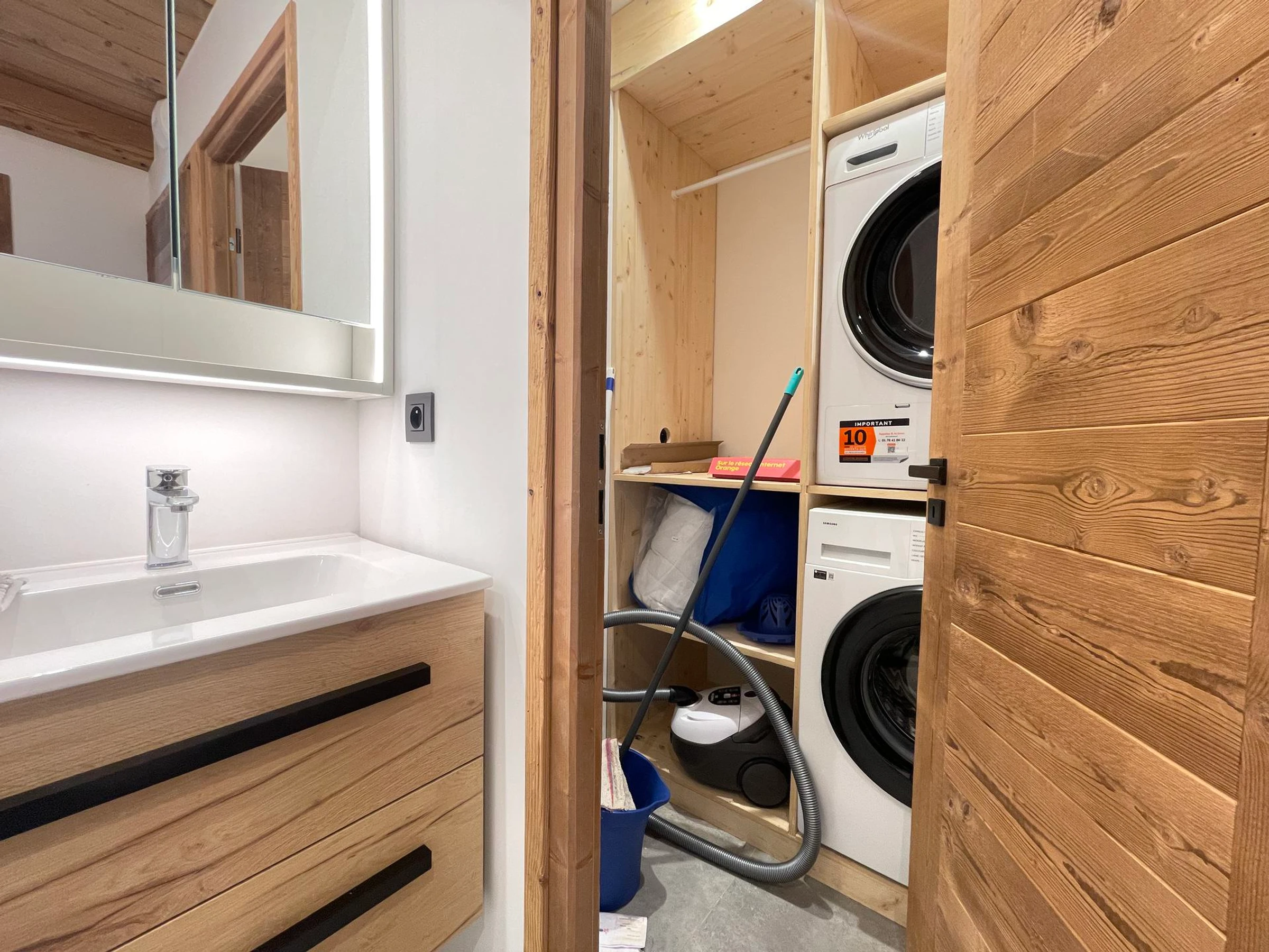 - Badezimmer mit Badewanne, Dusche, Doppelwaschbecken und Zugang zu einem separaten WC sowie Waschküche mit Waschmaschine und Trockner.