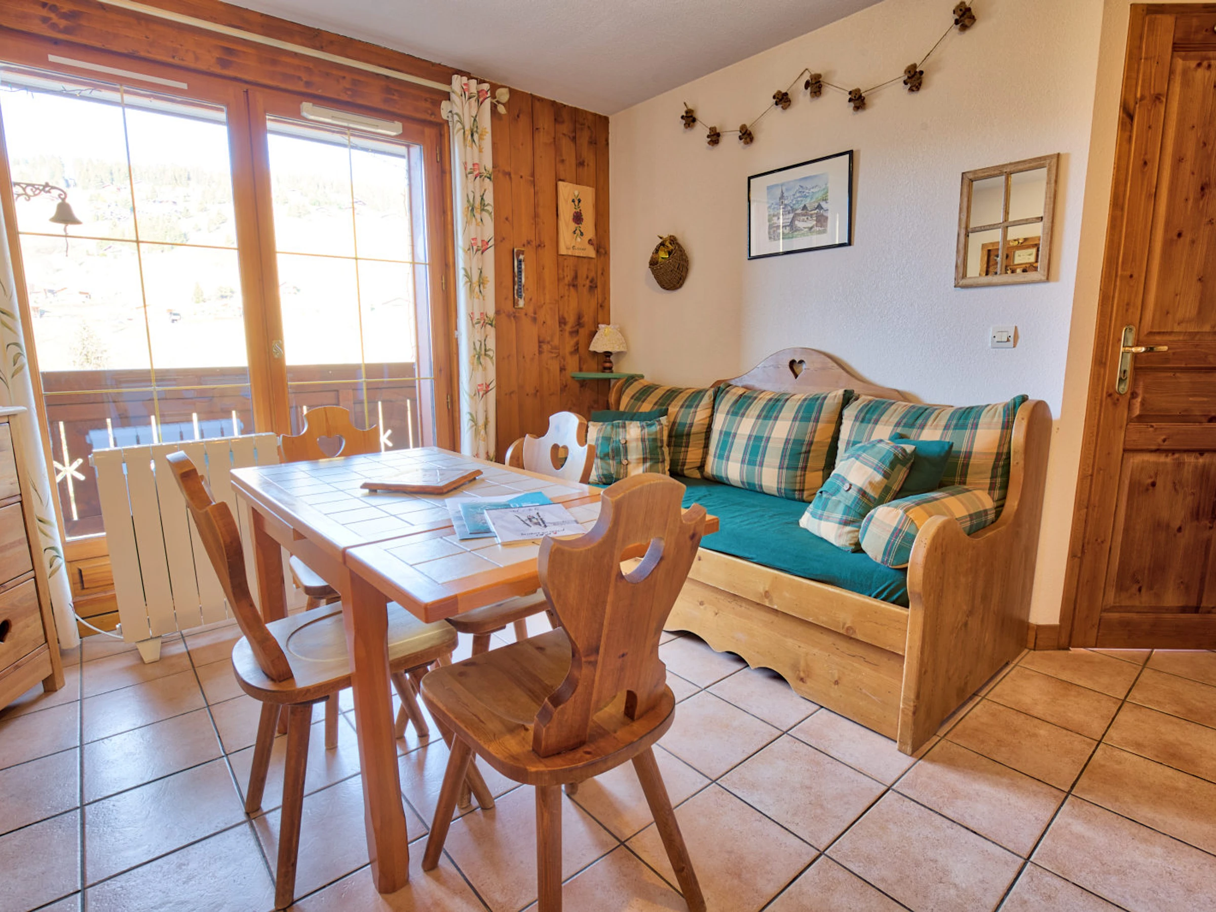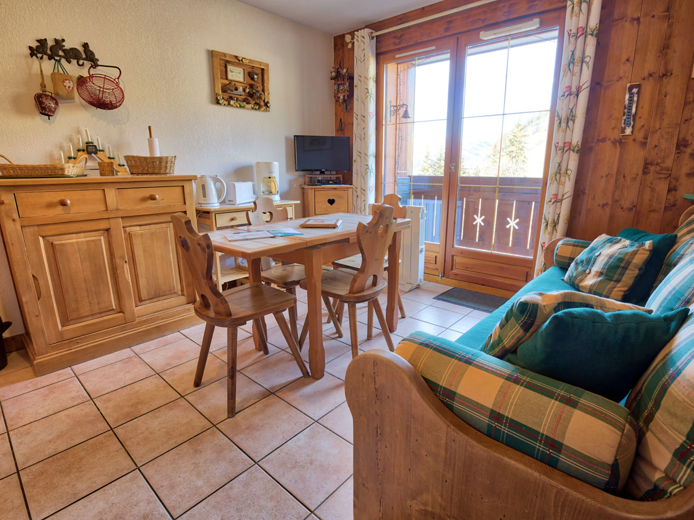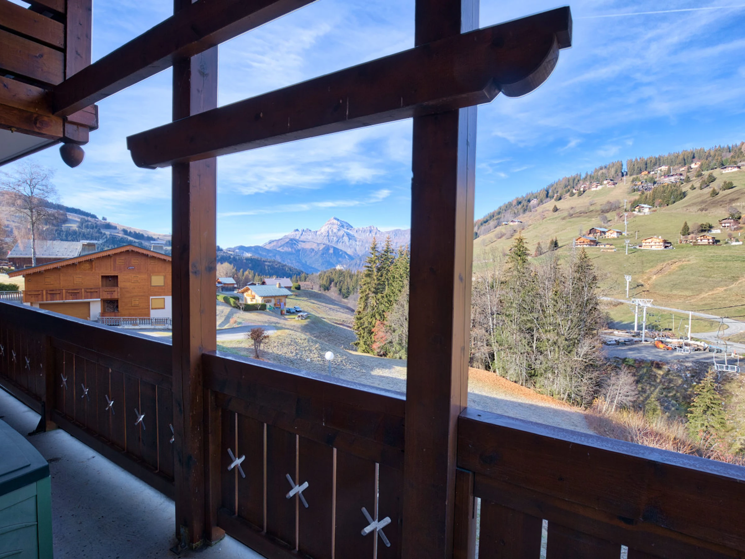 Am Fuße der Mont-Rond-Hänge, auf 1350 m Höhe, bietet diese 33 m² große Ferienwohnung Platz für fünf Personen. Sie befindet sich im zweiten Stock und bietet einen großen, nordöstlichen Eckbalkon (8 m²) mit Blick auf den Mont Charvin, Lachat und das Tal.