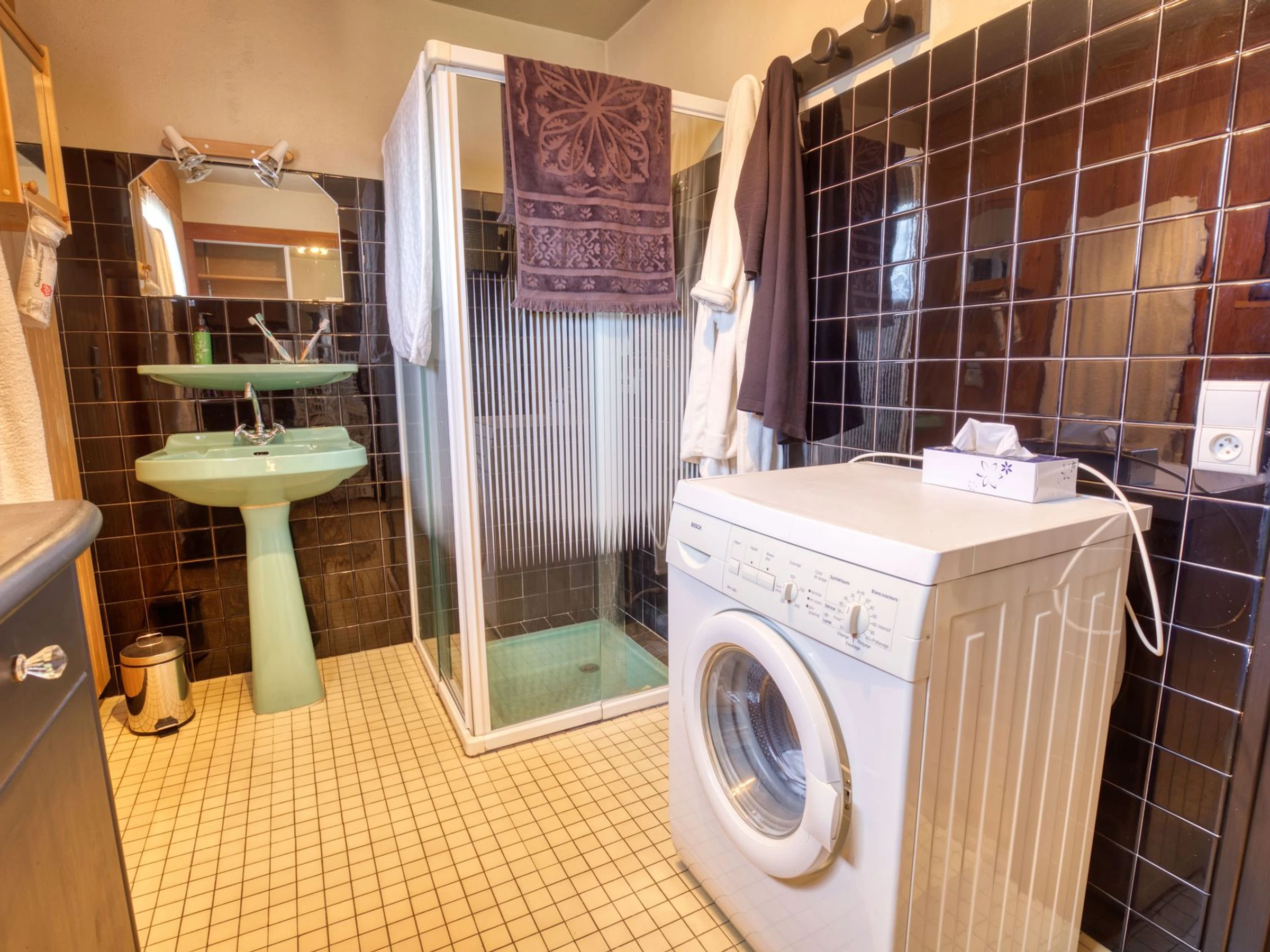 - Ein Badezimmer mit Dusche und Waschmaschine