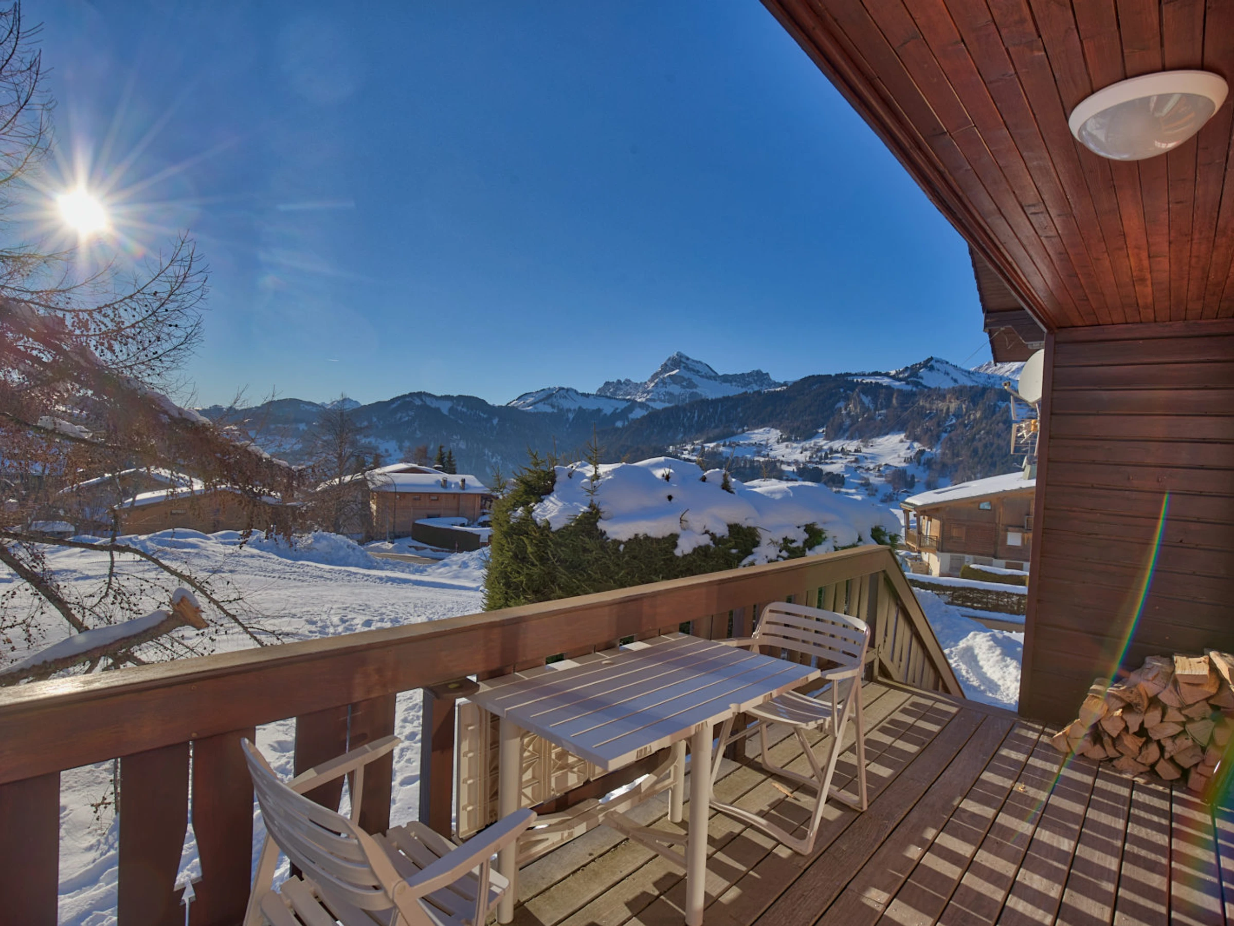 - Eine sonnige Terrasse mit Blick auf Berge und Pisten