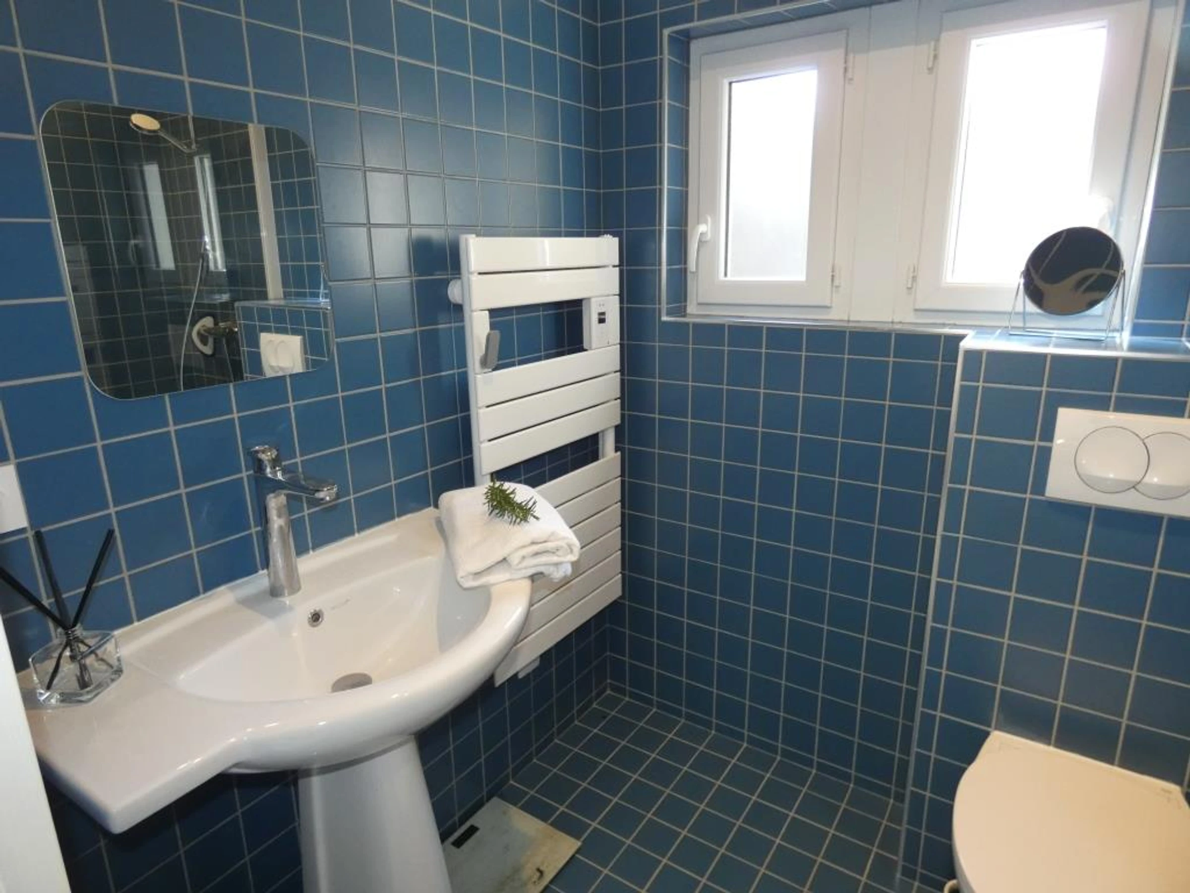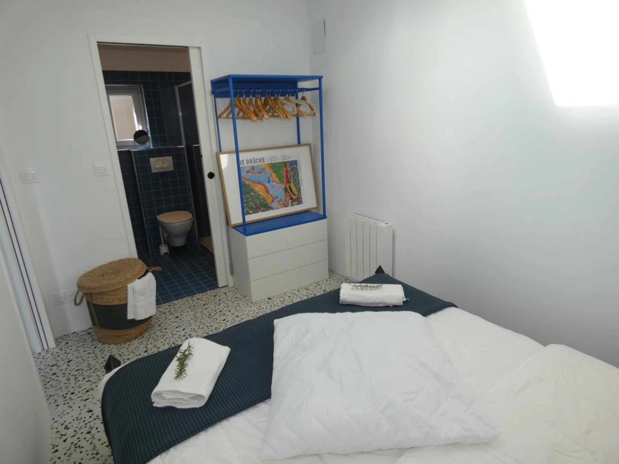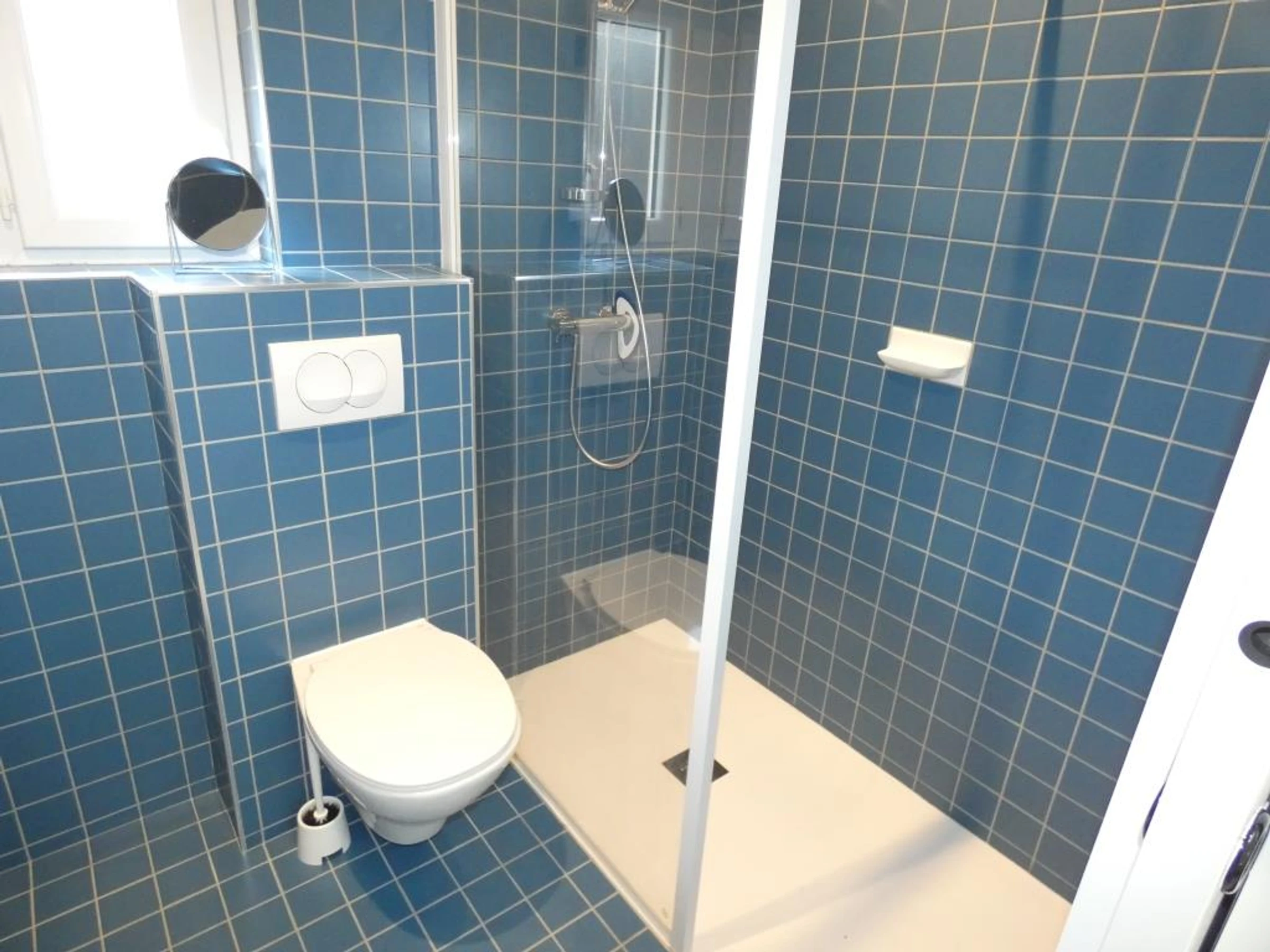 - Ein Schlafzimmer mit Elternsuite mit einem Doppelbett (160 cm), Dusche, Waschbecken und WC.