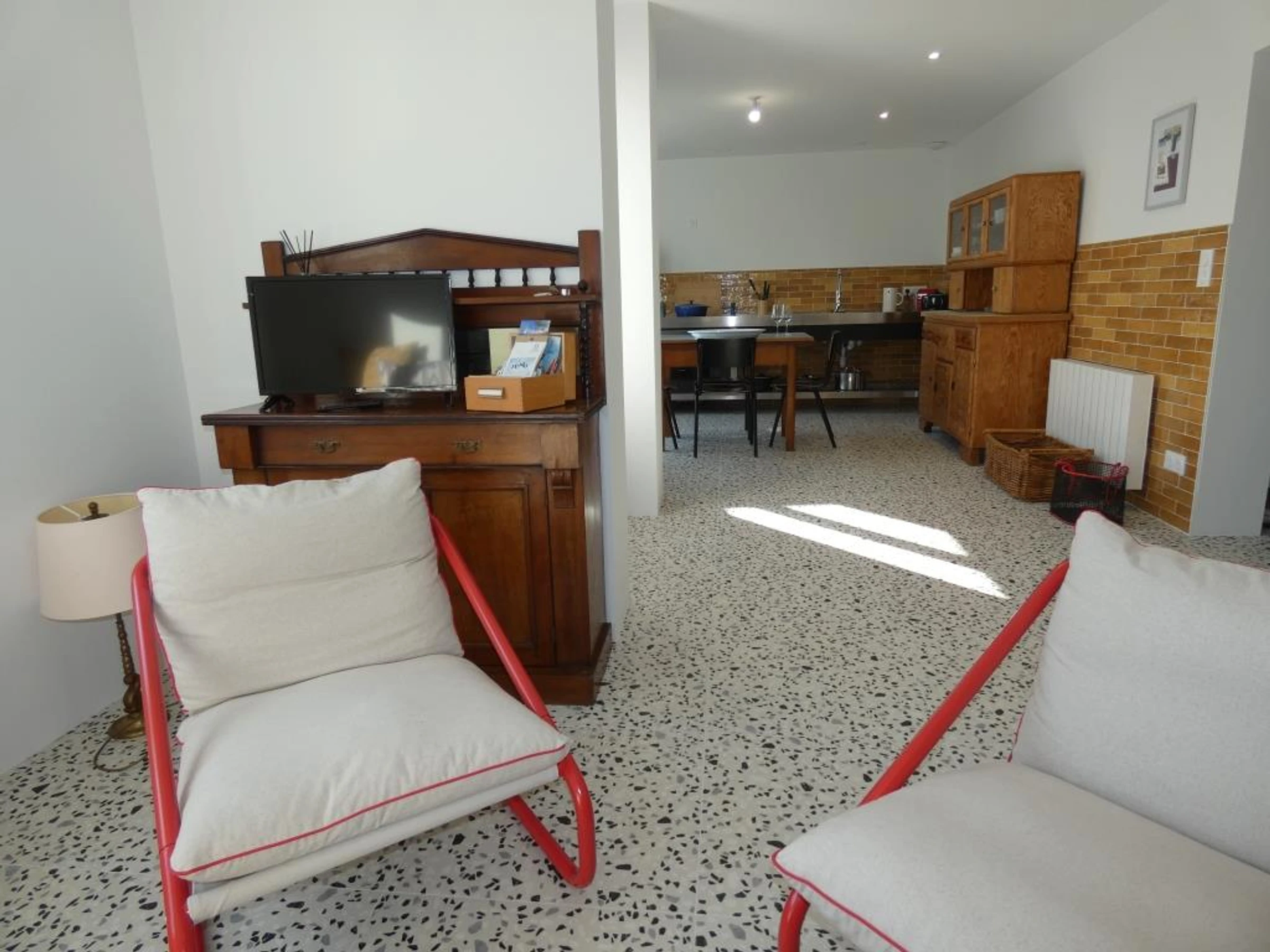 - einem großen Wohnraum; moderne Küche, die mit Vintage-Möbeln ausgestattet ist, Sitzecke mit einer Bank, Fernseher.