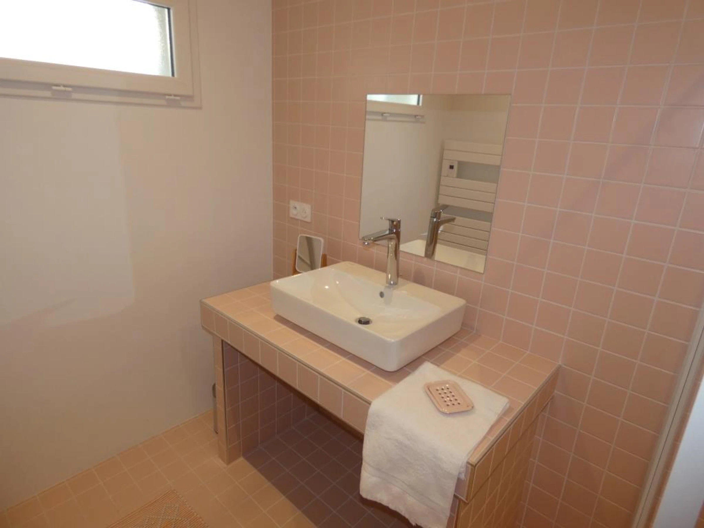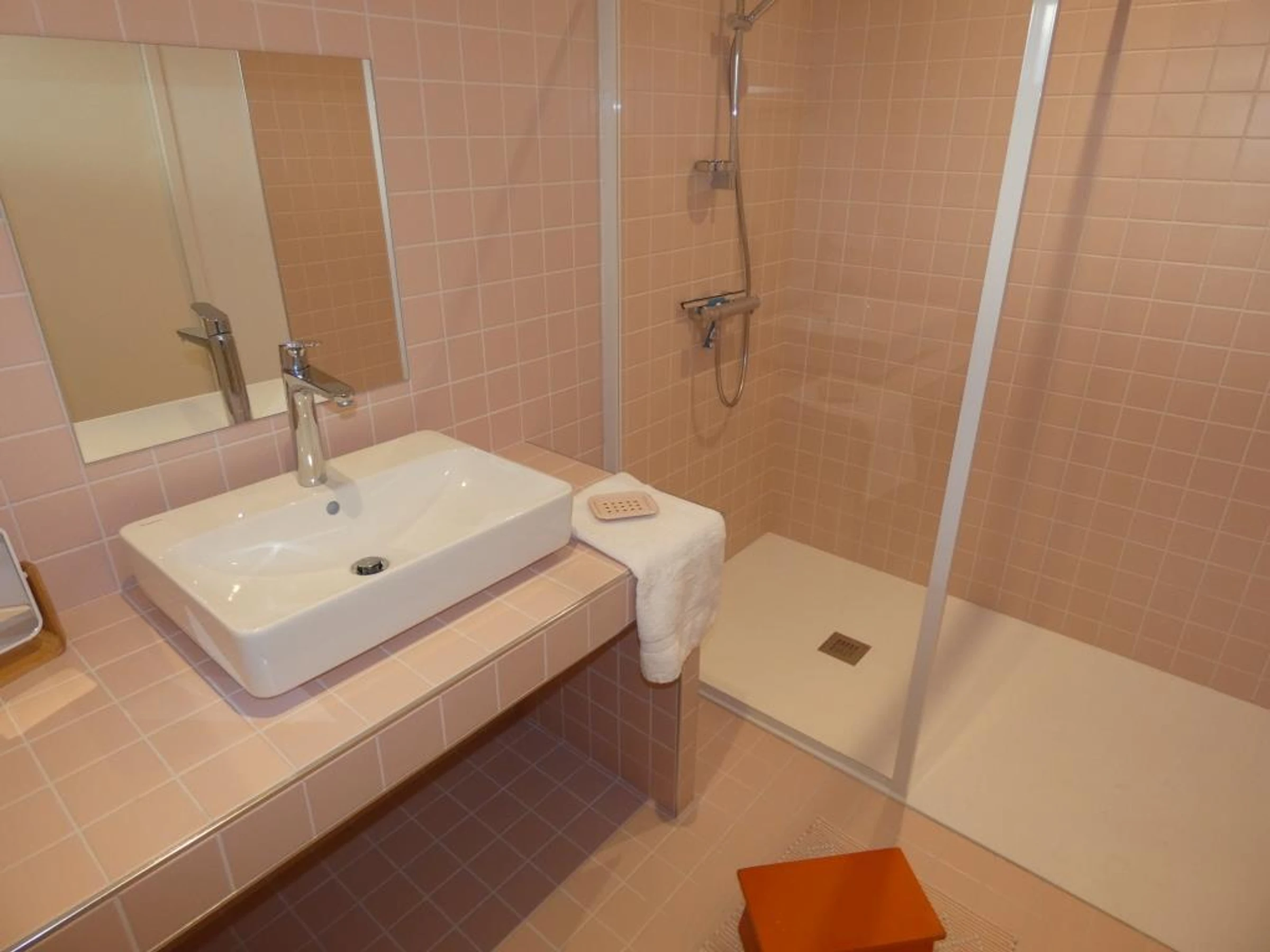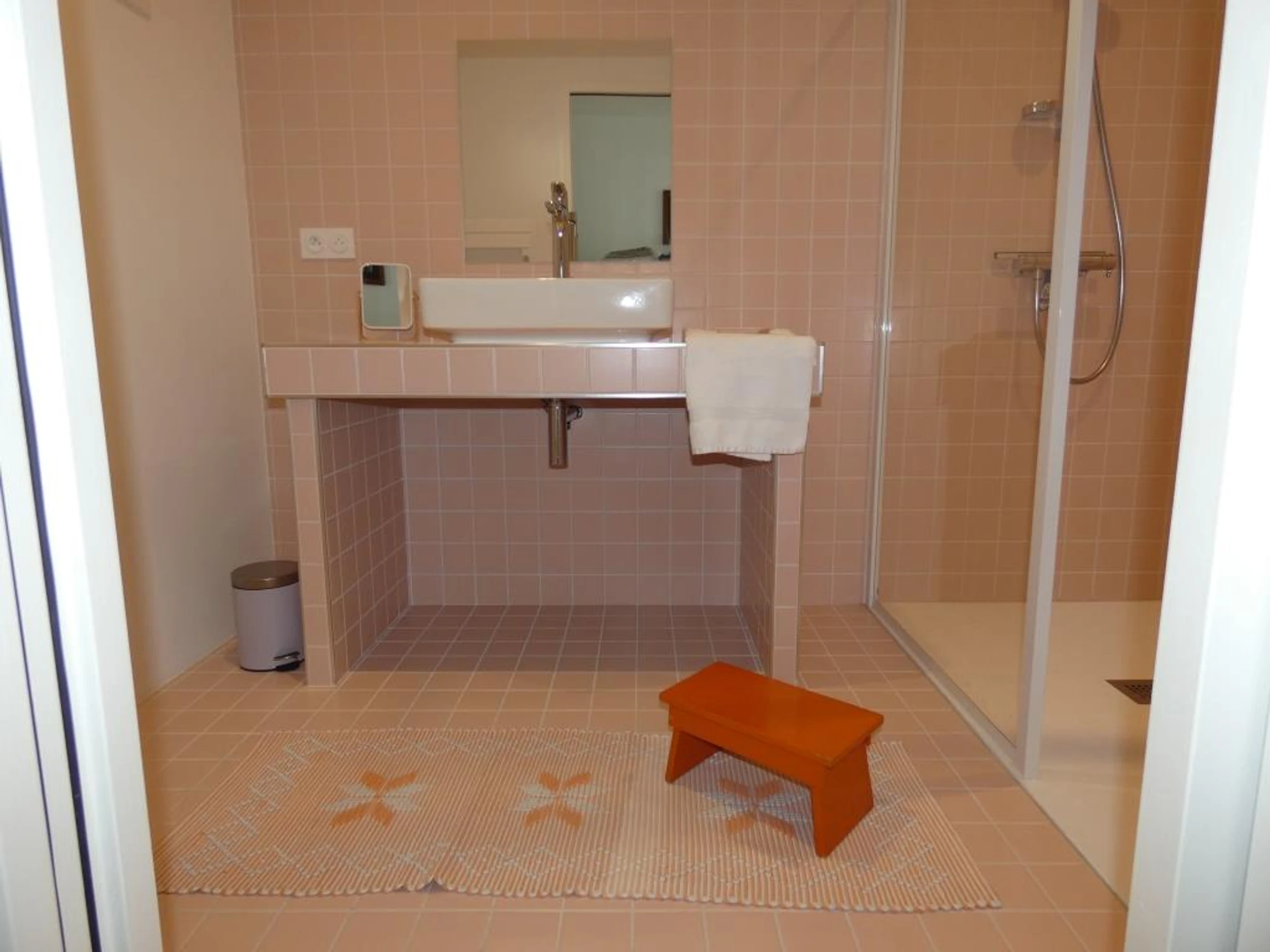 - ein Badezimmer mit einem weißen Waschbecken auf einer rosafarbenen Fayenceplatte, begehbare Dusche.