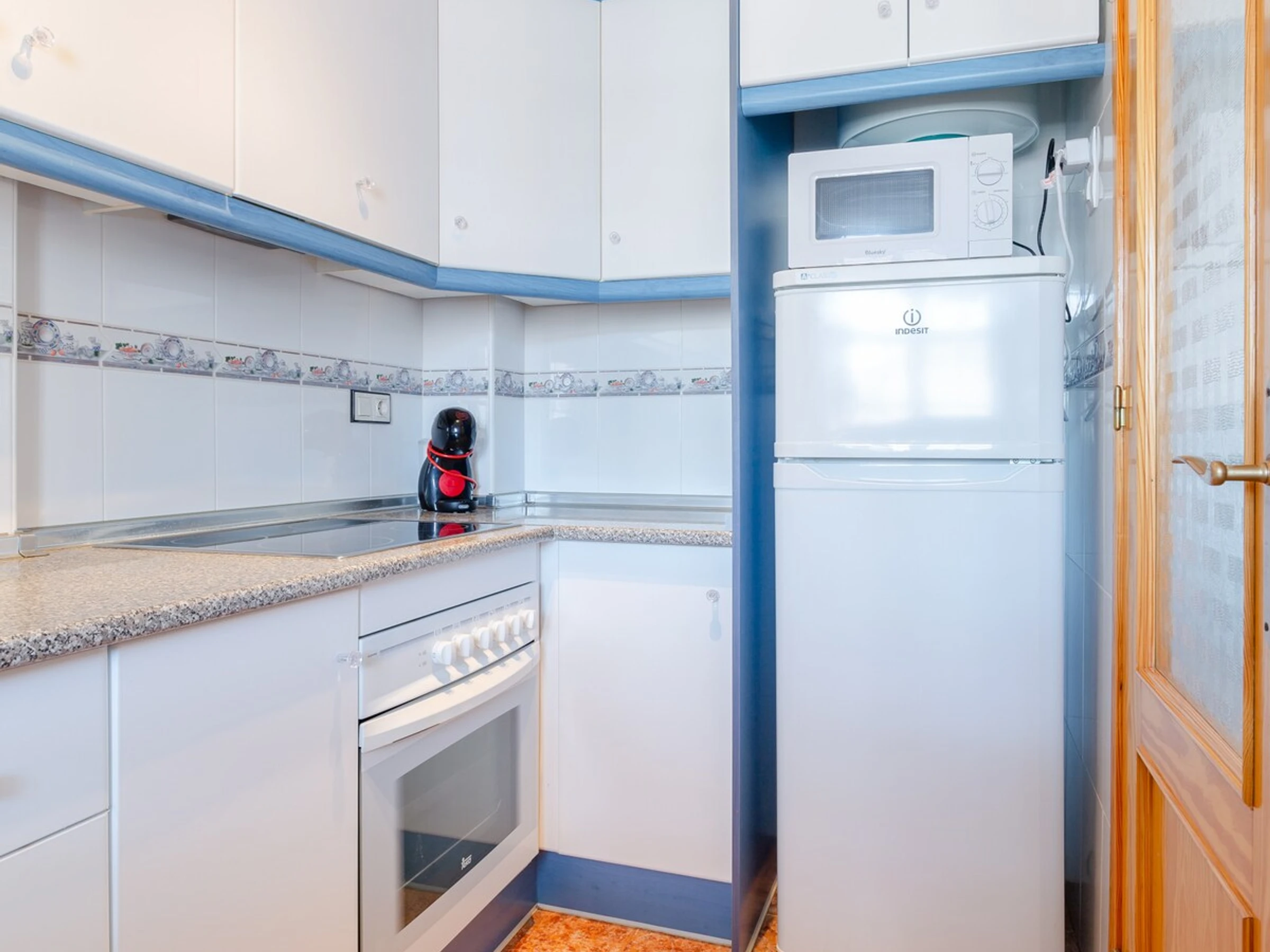 Dieses küche, ist ausgestattet in kühlschrank, mikrowelle, backofen, gefrierschrank, kaffeemaschine und toaster.