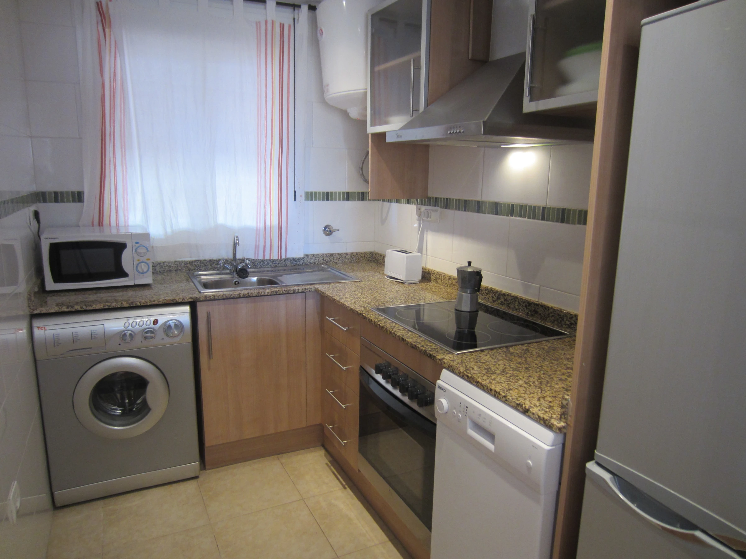 Dieses küche, mit ceranfeld, ist ausgestattet in kühlschrank, mikrowelle, backofen, gefrierschrank, geschirr/besteck, kochutensilien, kaffeemaschine und toaster.