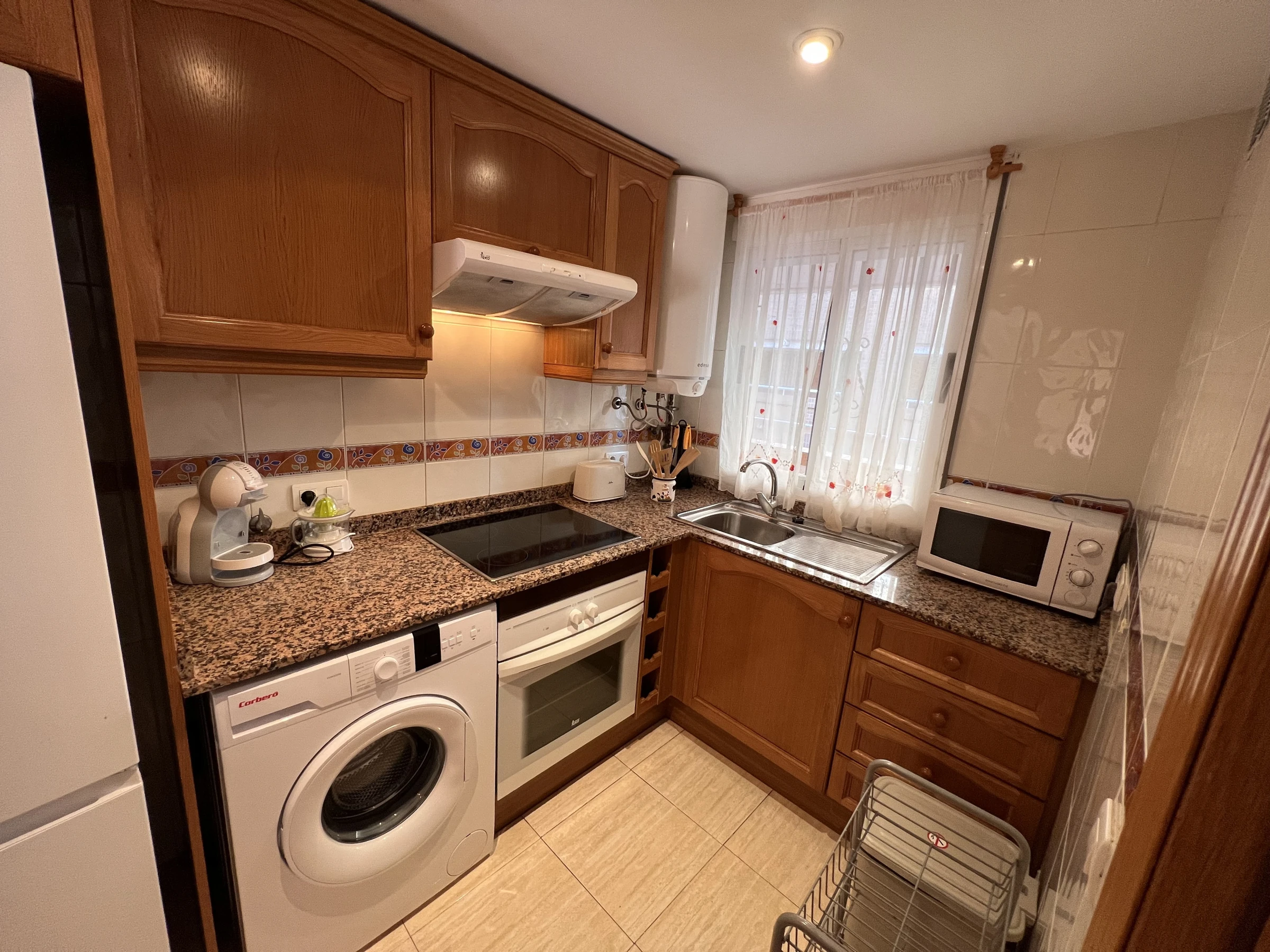 Dieses offene küche, ist ausgestattet in kühlschrank, mikrowelle, backofen, gefrierschrank, geschirr/besteck, kochutensilien, kaffeemaschine und toaster.