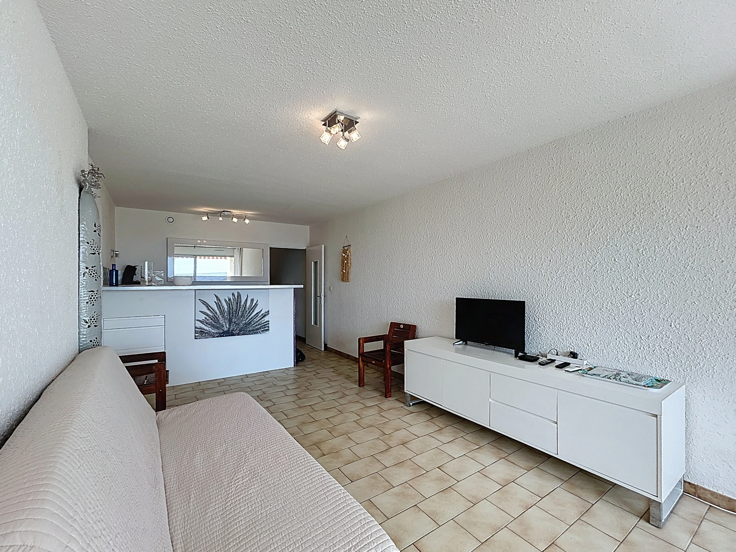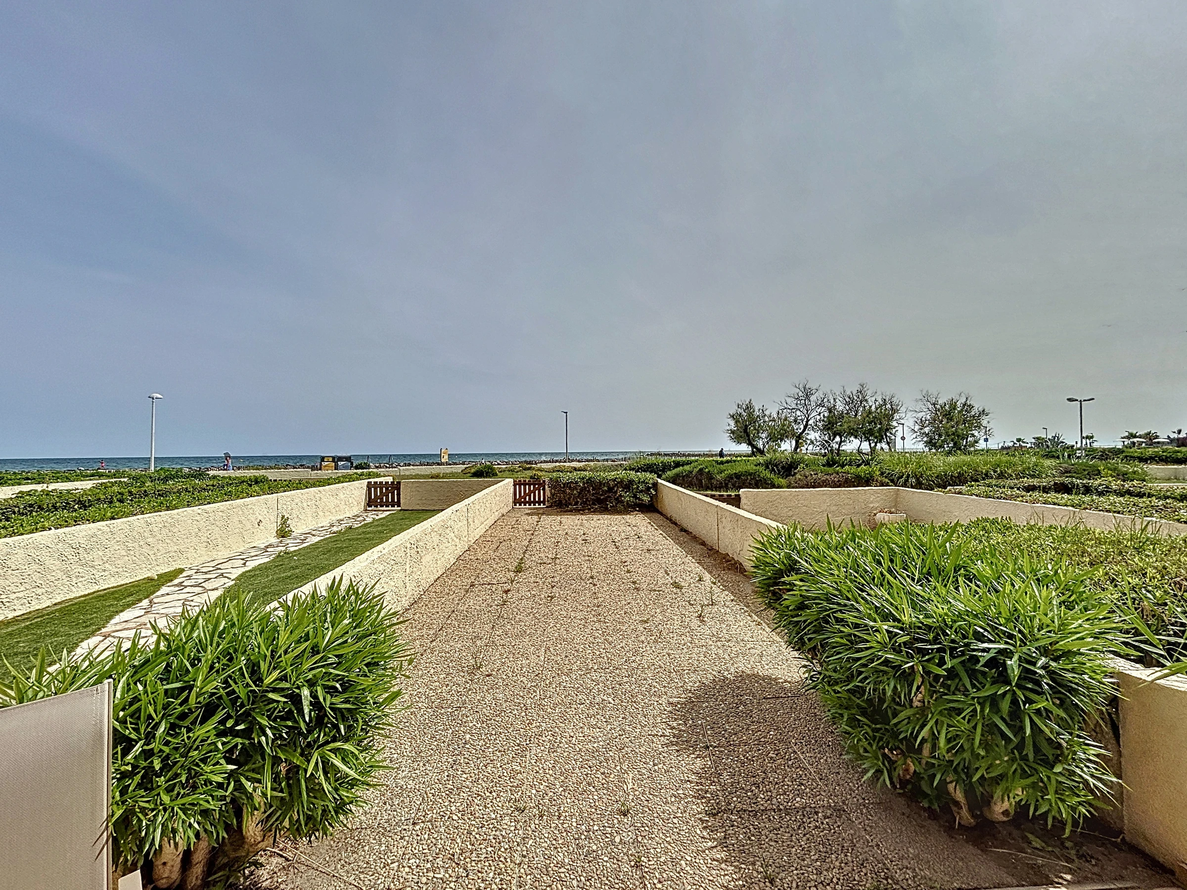 DIREKT AM STRAND. 50 m² großes Apartment mit zwei Südausrichtungen im Erdgeschoss einer Strandresidenz. Es ist für 4 Personen geeignet und verfügt über ein Wohnzimmer mit Zugang zu einer Terrasse mit Meerblick, eine voll ausgestattete Küchenzeile, eine Schlafnische mit zwei Etagenbetten, ein Schlafzimmer mit zwei Einzelbetten, ein Badezimmer, ein separates WC und einen Parkplatz.