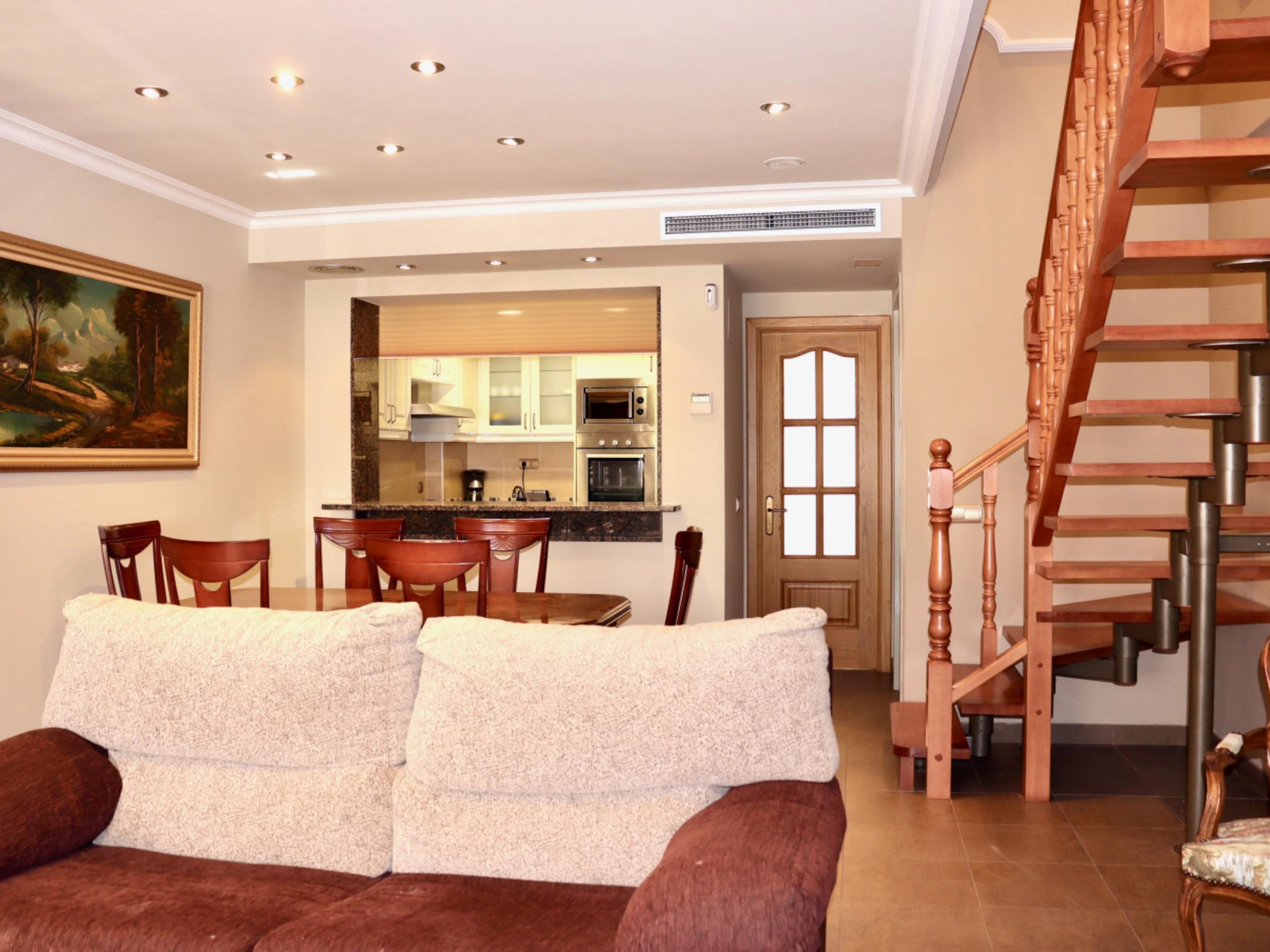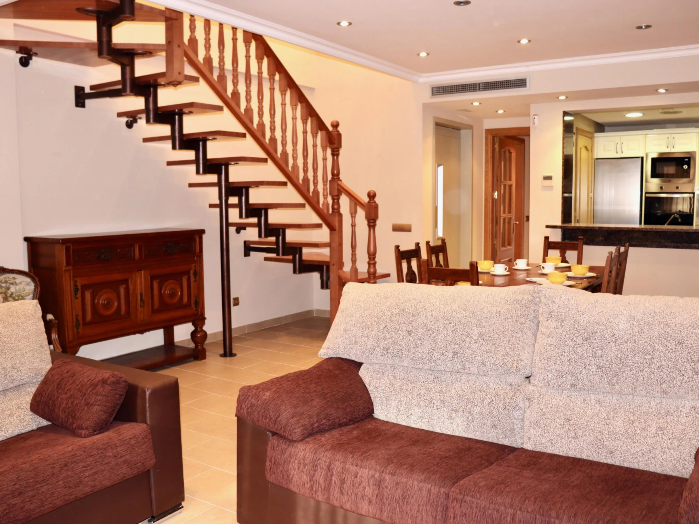Es handelt sich um ein Reihenhaus mit zwei Etagen, das bis zu 6 Personen Platz bietet. Die Aufteilung umfasst 3 Schlafzimmer, einen geräumigen Wohnbereich mit direktem Zugang zur Terrasse, eine voll ausgestattete Küchenzeile und zwei Badezimmer.