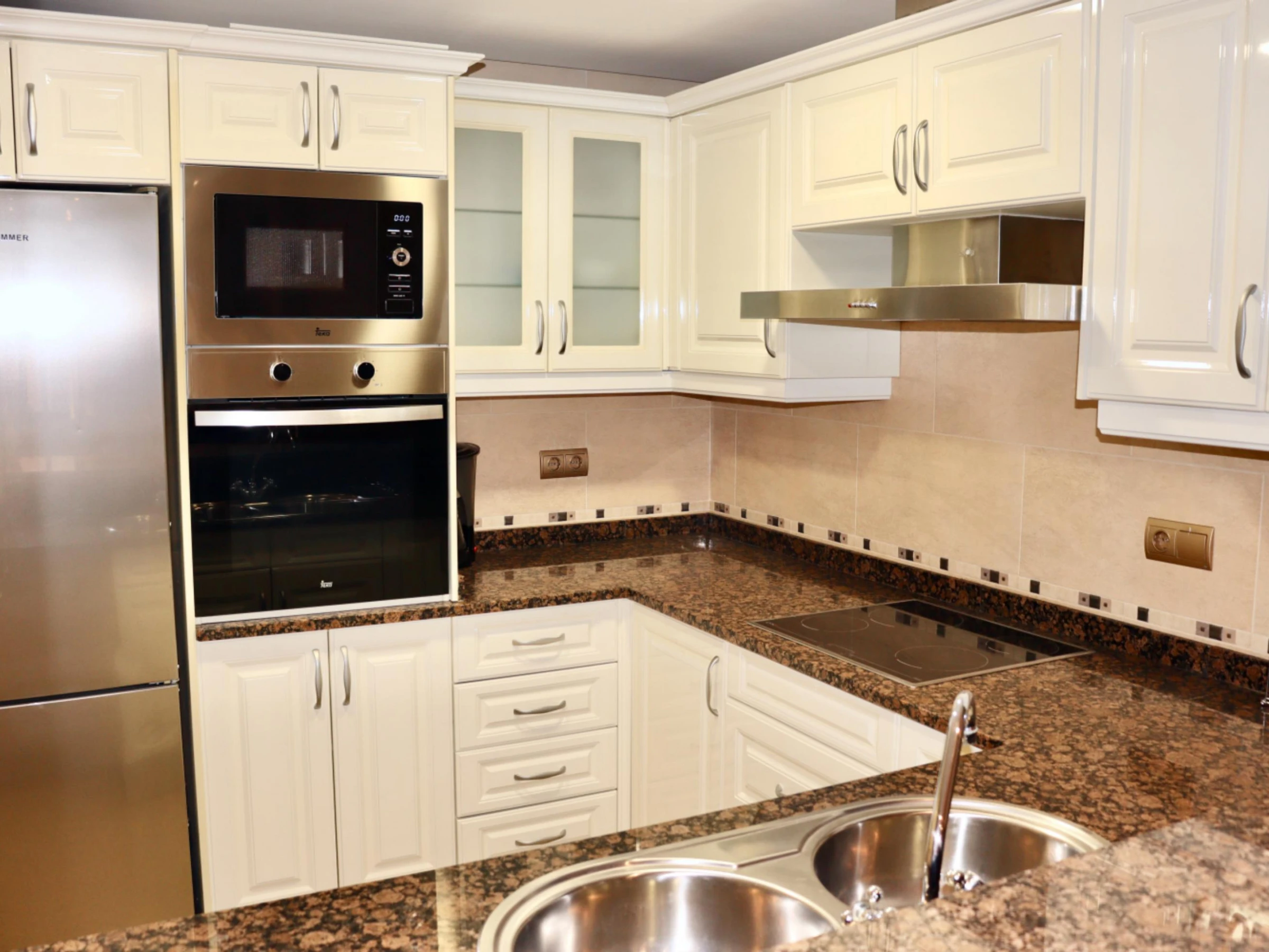 - Die Küchenzeile mit Glaskeramikkochfeld ist komplett ausgestattet mit Kühlschrank, Ofen, Mikrowelle, Geschirrspüler, Filter- und Dolce Gusto-Kaffeemaschinen, Toaster, Wasserkocher, Waschmaschine, Trockner, Geschirr und Küchenutensilien.