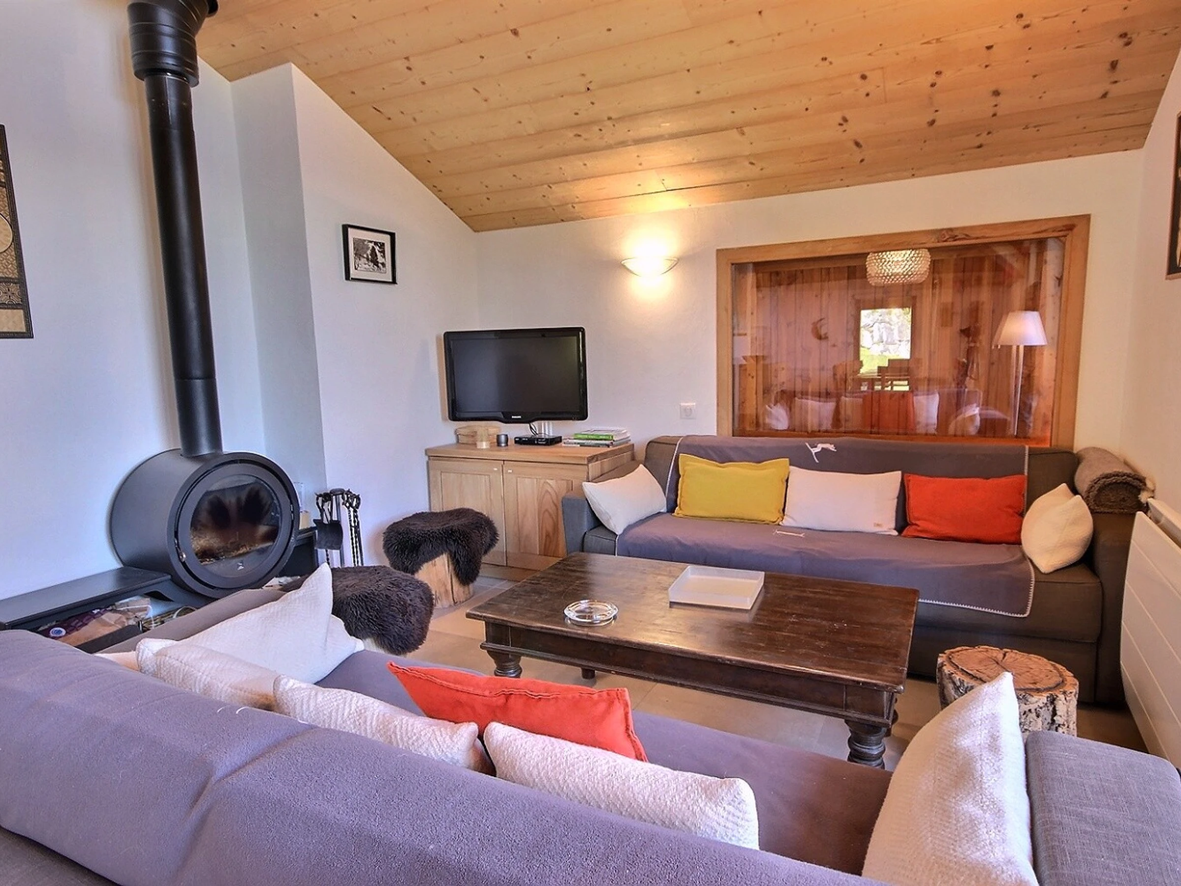 Ein Fernseher, WLAN-Zugang, ein Holzofen (Holz nicht vorhanden) und ein Skischrank.