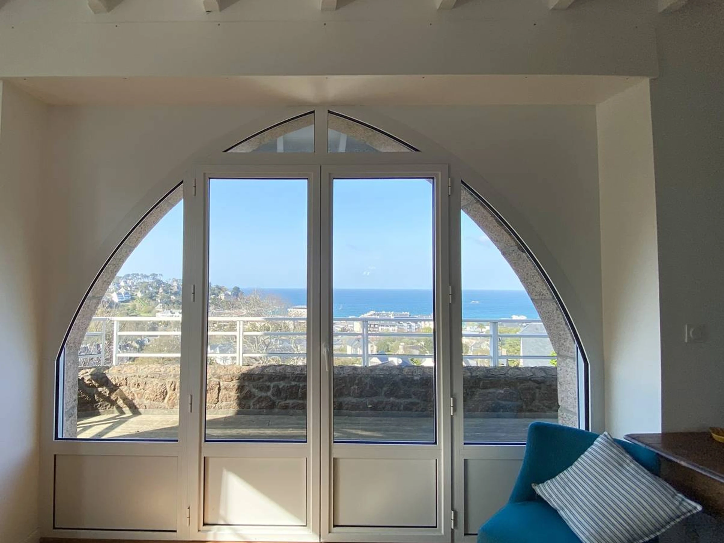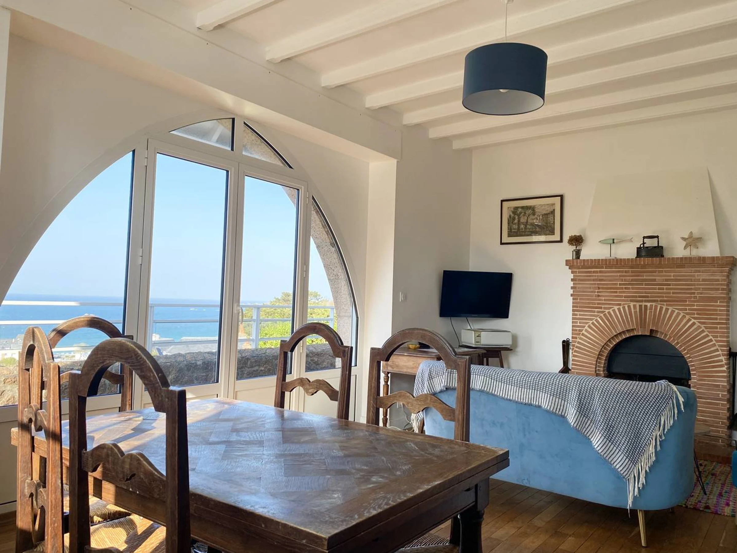 1 Wohn-/Esszimmer mit TV, Sofa, Sesseln, Essbereich, mit großem Erkerfenster, das auf eine Holzterrasse mit Blick auf die Bucht von Trestraou führt. MEERBLICK -