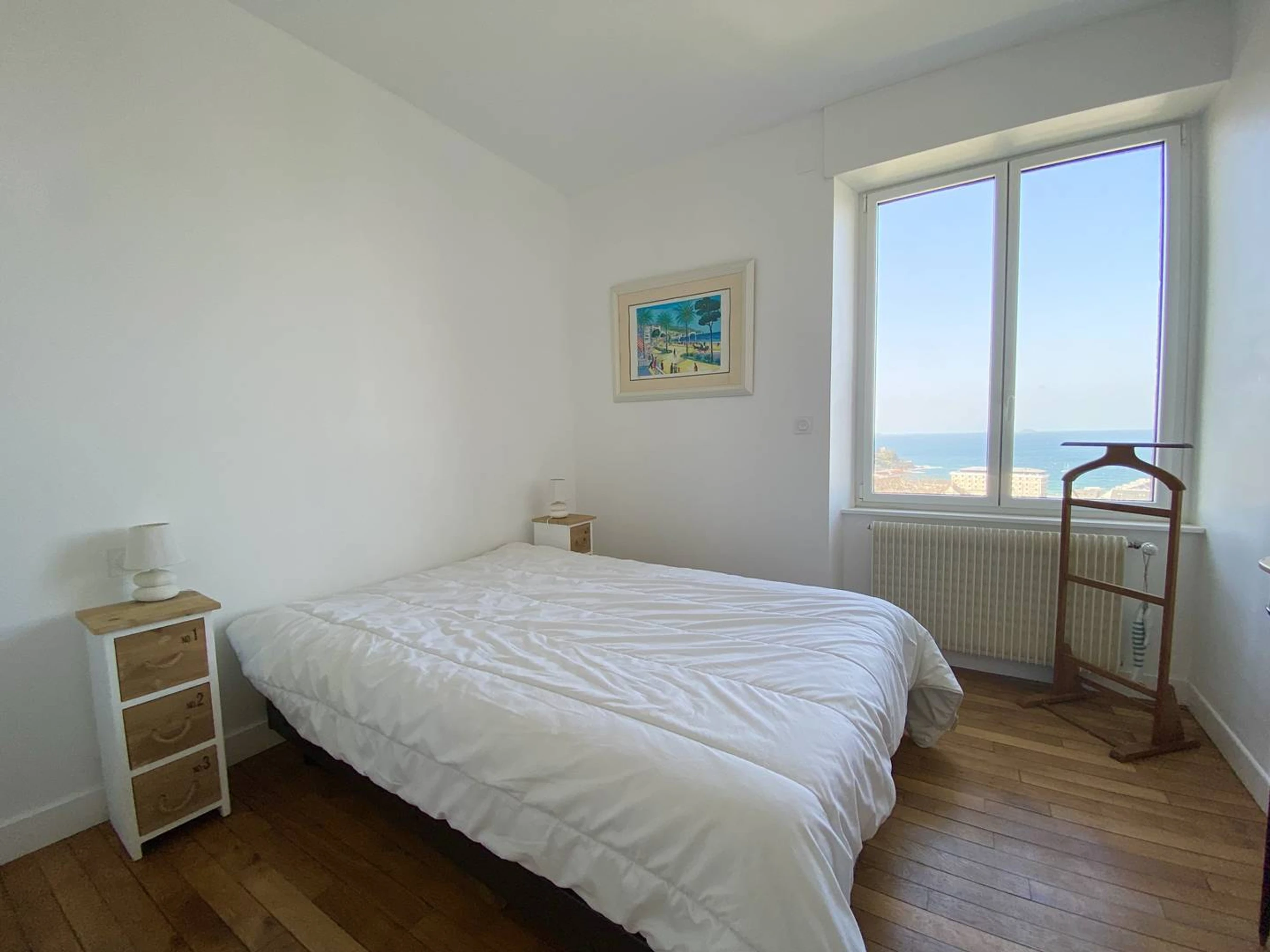 1 Schlafzimmer mit Doppelbett für 2 Personen mit Bettdecke und MEERBLICK -