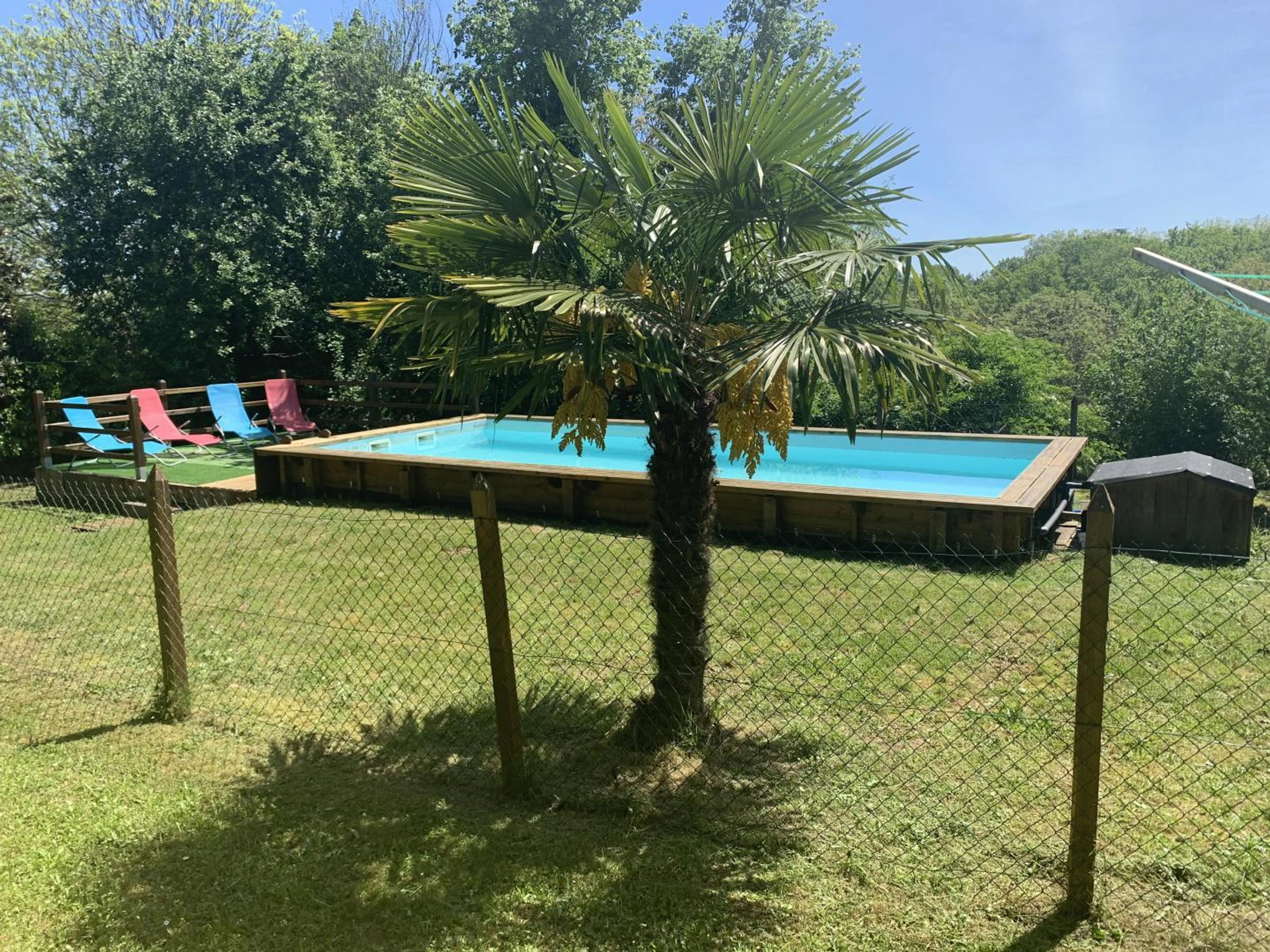 Privater, unbeheizter, 8 x 4 m großer Chlorpool (40 cm unter der Erdoberfläche), umgeben von einer Rasenfläche, 1,30 m tief, über eine Leiter von einer Terrasse mit Liegestühlen erreichbar, gesichert durch einen Zaun und eine Alarmanlage. Geöffnet vom 15. Juni bis 11. September.