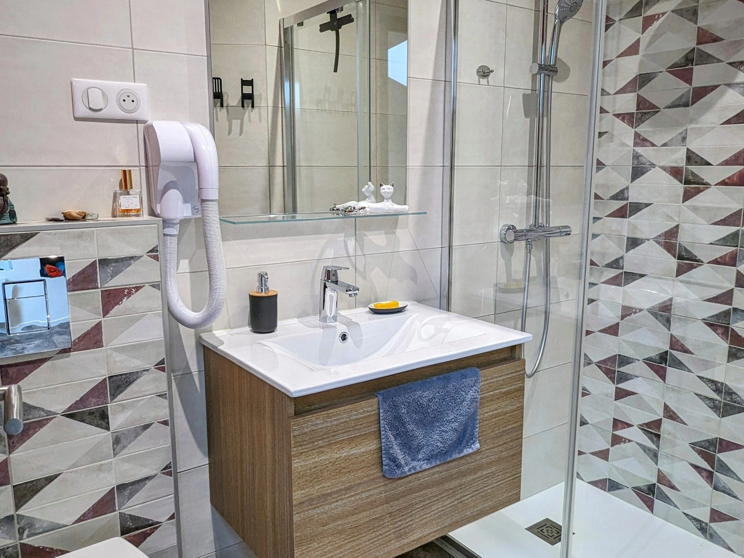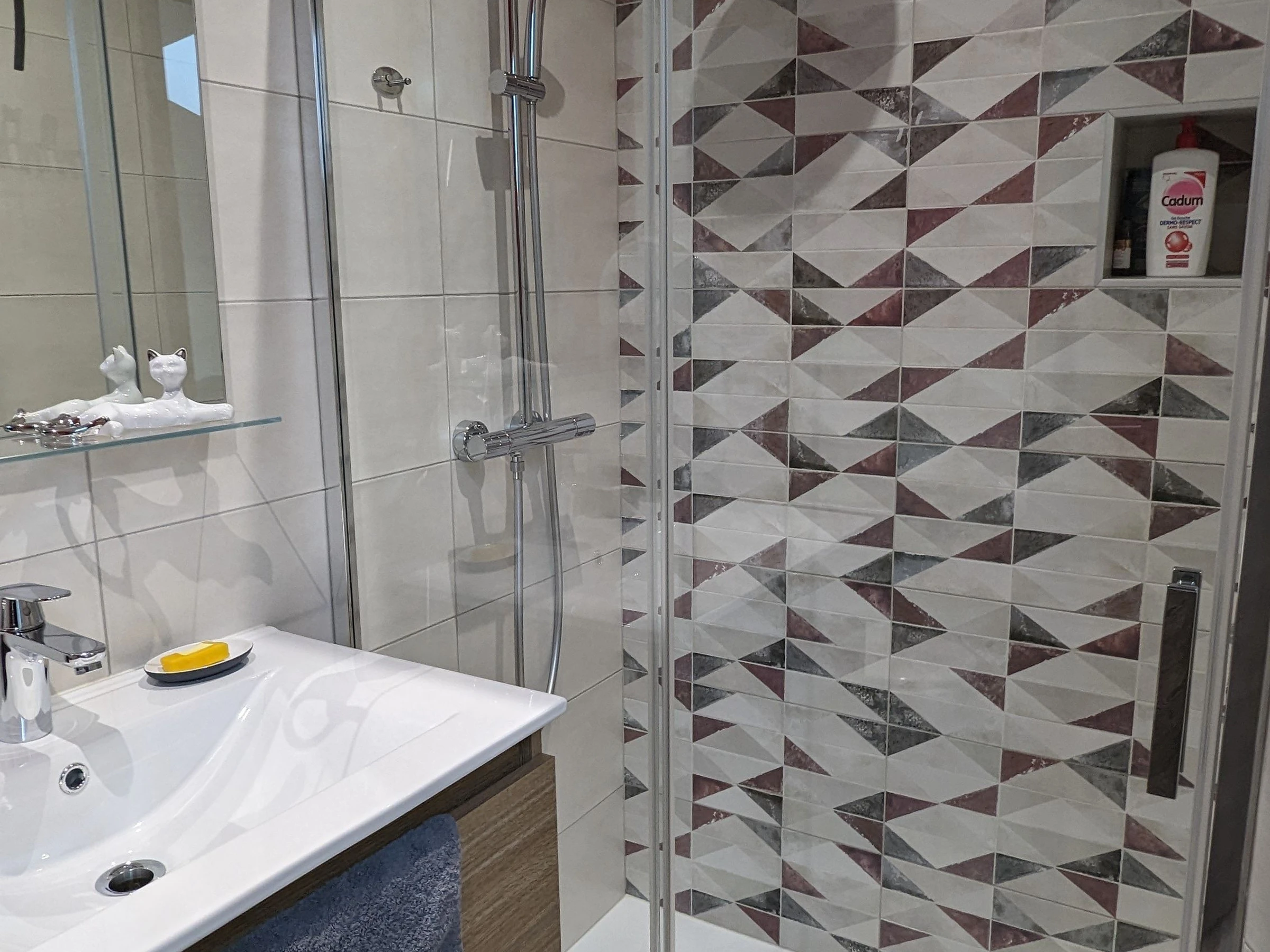 Im Obergeschoss ein Schlafbereich mit 1 140*190-Bett und 1 80*190-Bett sowie ein Badezimmer mit einer schönen ebenerdigen Dusche. Im Badezimmer ist auch eine Toilette vorhanden.