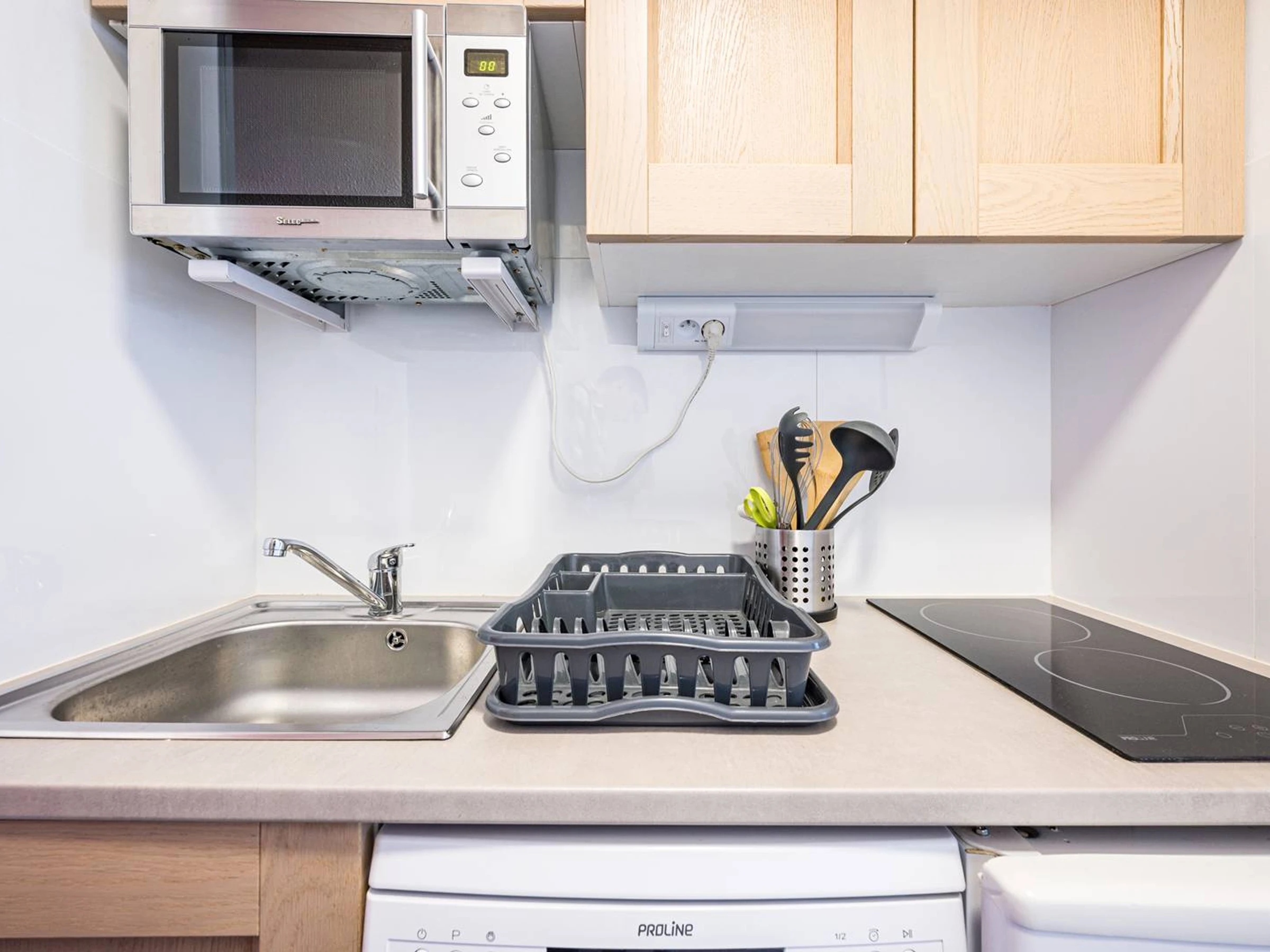 - Die Küche im Eingangsbereich ist komplett ausgestattet mit 2 Kochfeldern, Kühlschrank, Mikrowelle, Kaffeemaschine, Toaster, Wasserkocher, Geschirrspüler etc.