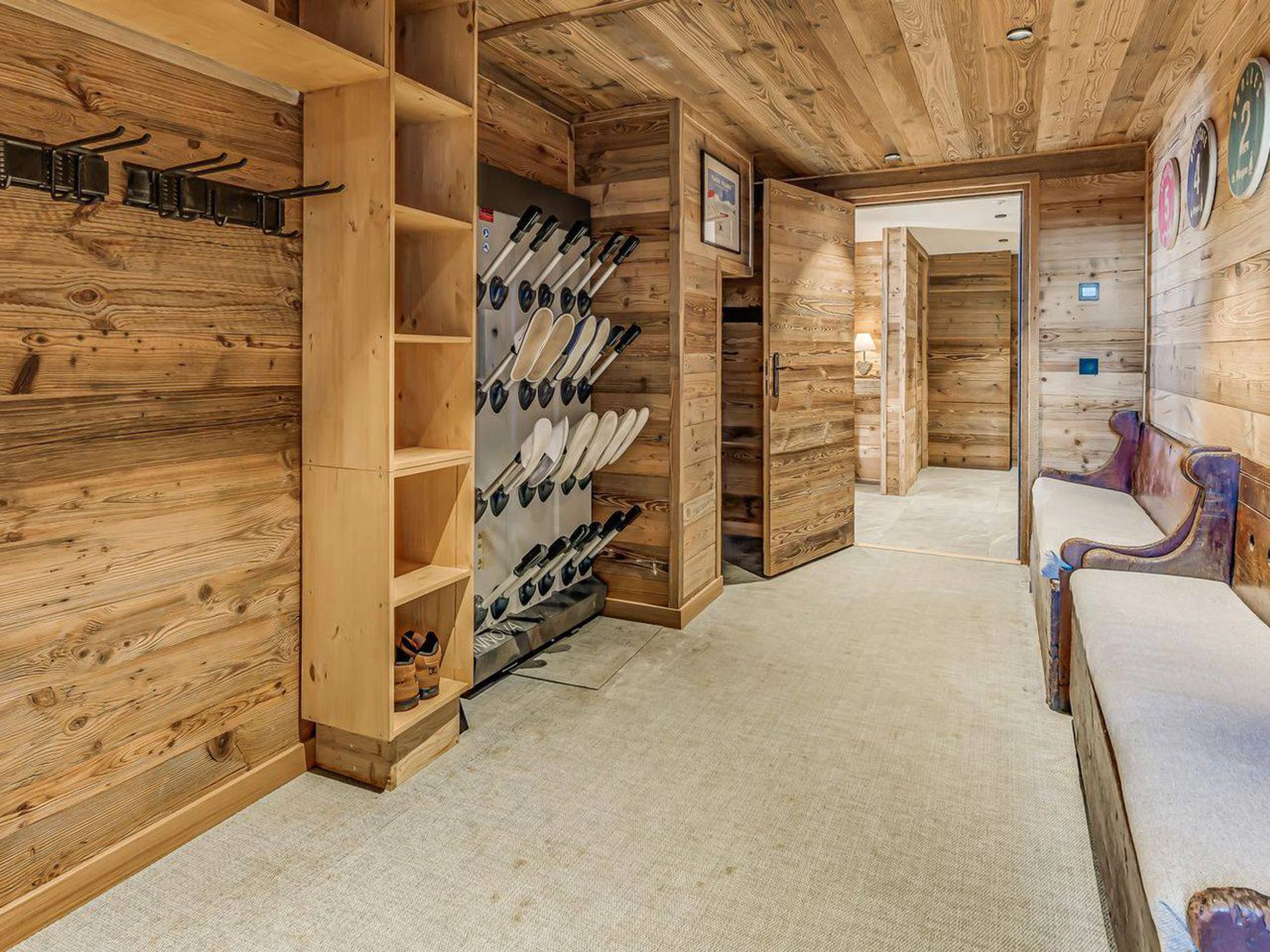 – 1 Eingang mit 1 Skiraum mit Skiständern, Schuhtrocknern, Garderobe, Ablage (Helme, Handschuhe etc.), Bank zum Ausziehen der Schuhe.