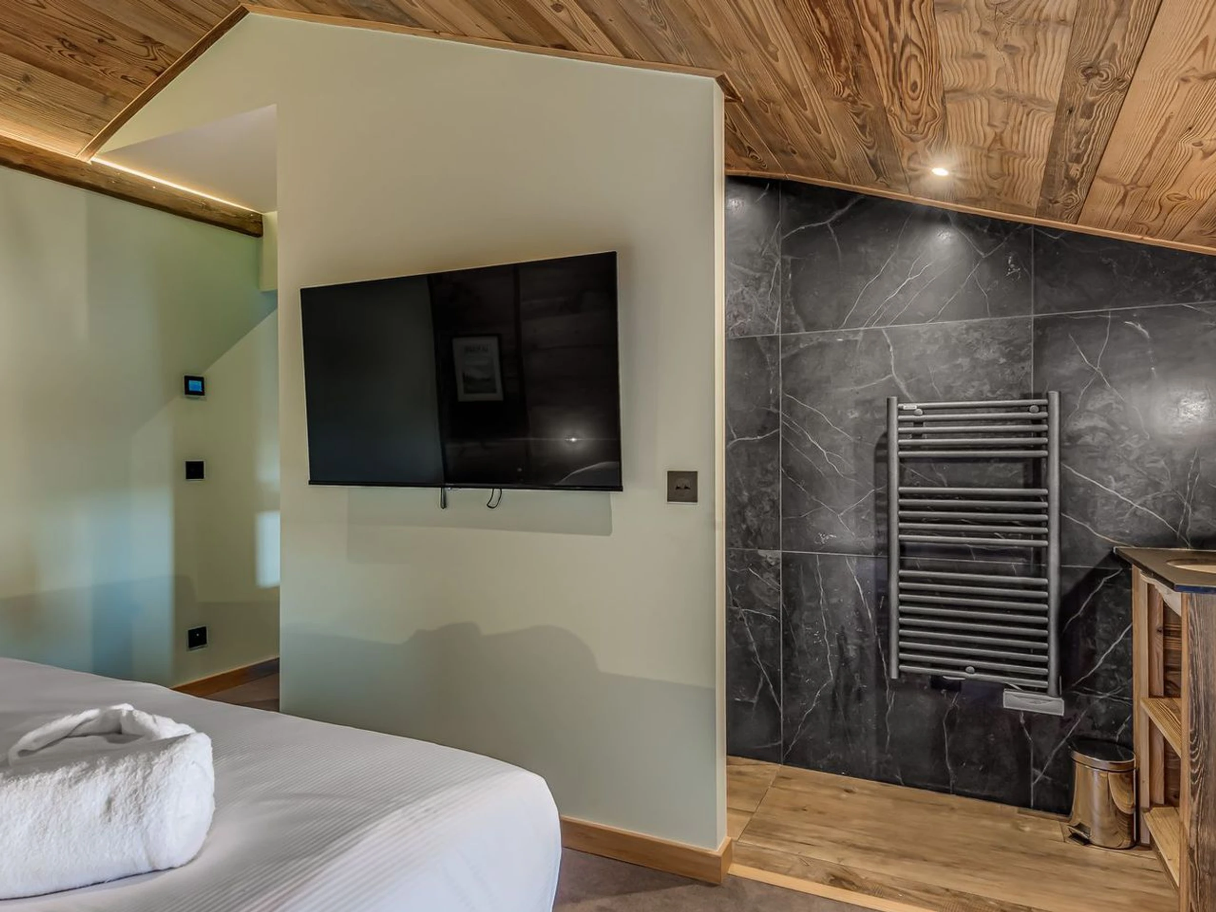 1 Doppelbett (160 x 200 cm), 50-Zoll-Q-LED-TV, Duschbad, Waschtisch, Handtuchheizkörper, WC.