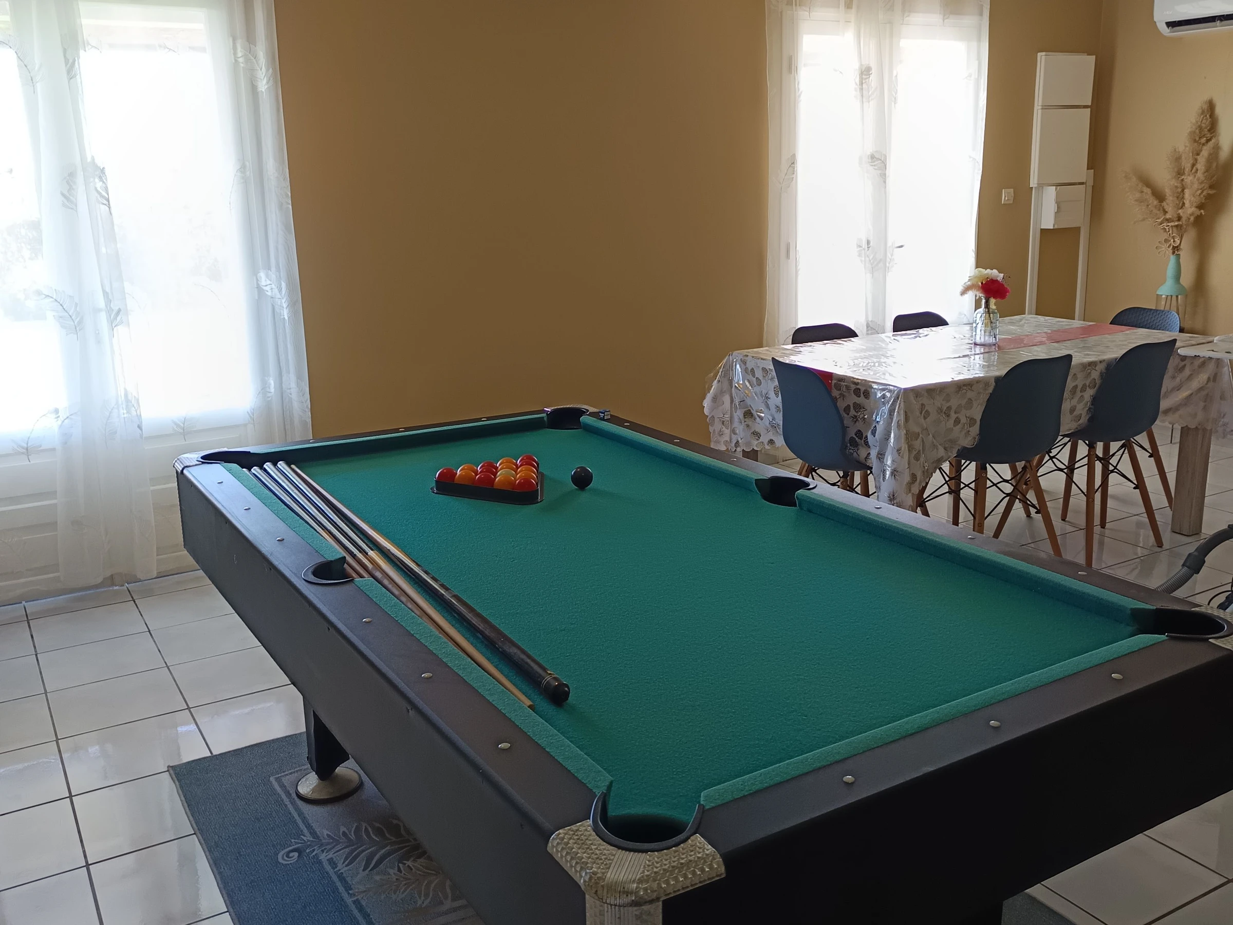 Es gibt zwei Badezimmer und zwei WCs. Ein Zimmer mit Billardtisch, eine voll ausgestattete Küche (Kühlschrank, Mikrowelle, Herd, Minibackofen etc.) und alle notwendigen Küchenutensilien. Außerdem gibt es eine zweite Küche mit zwei Topfträgern und Töpfen, einer Waschmaschine und einem Geschirrspüler.