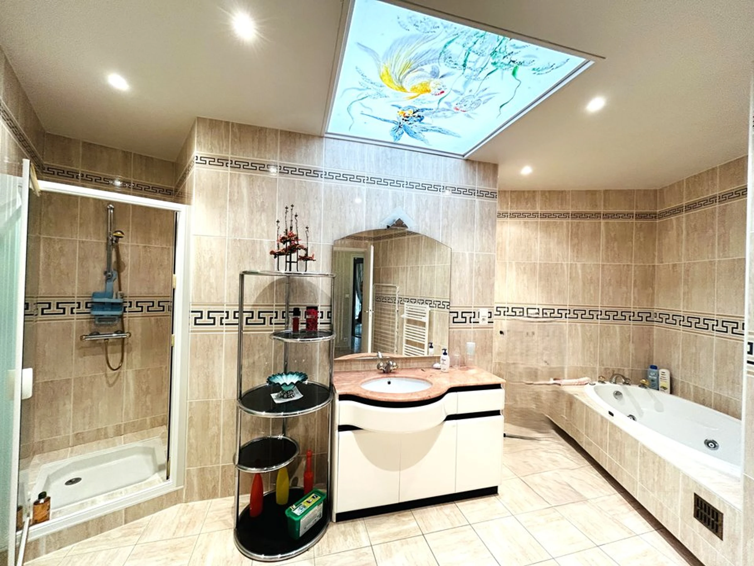- Ein großes Badezimmer mit Dusche und Whirlpool-Badewanne