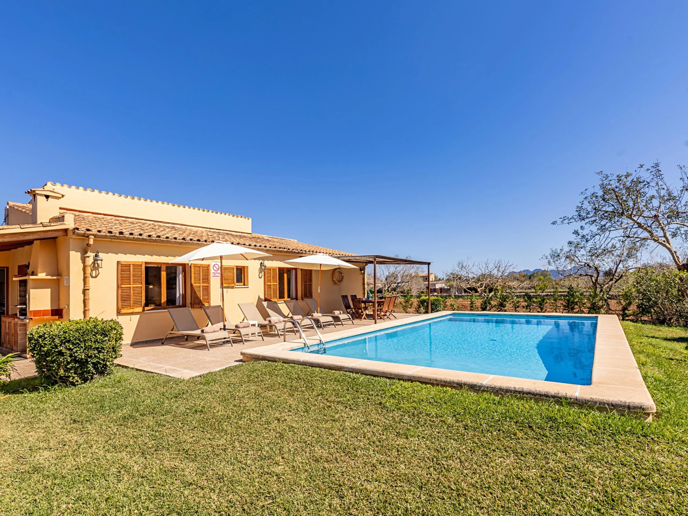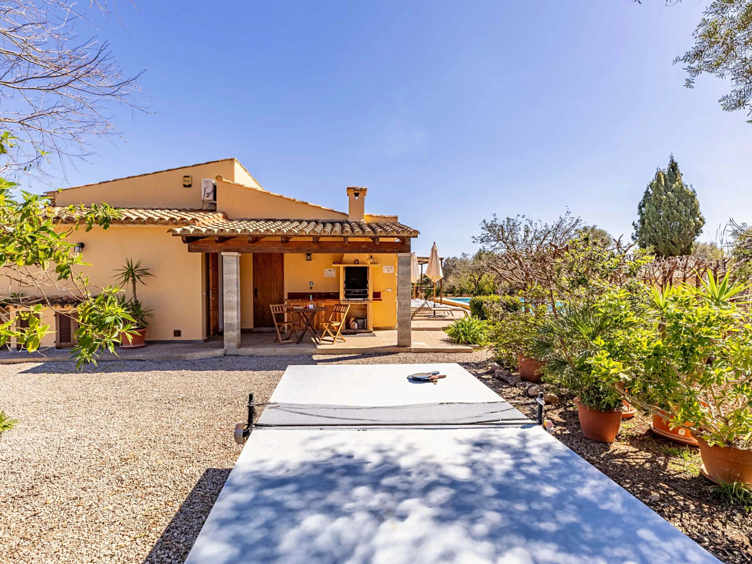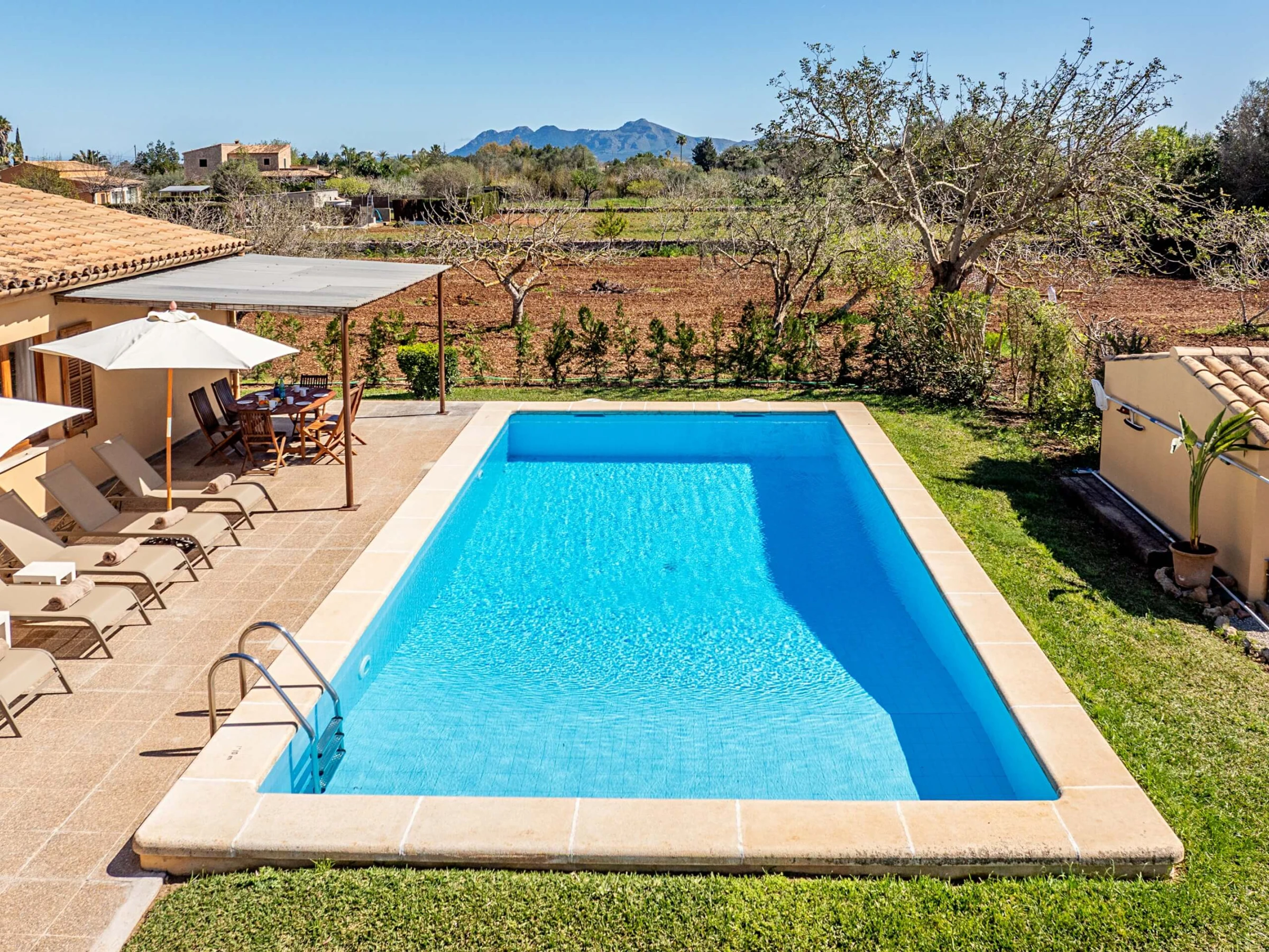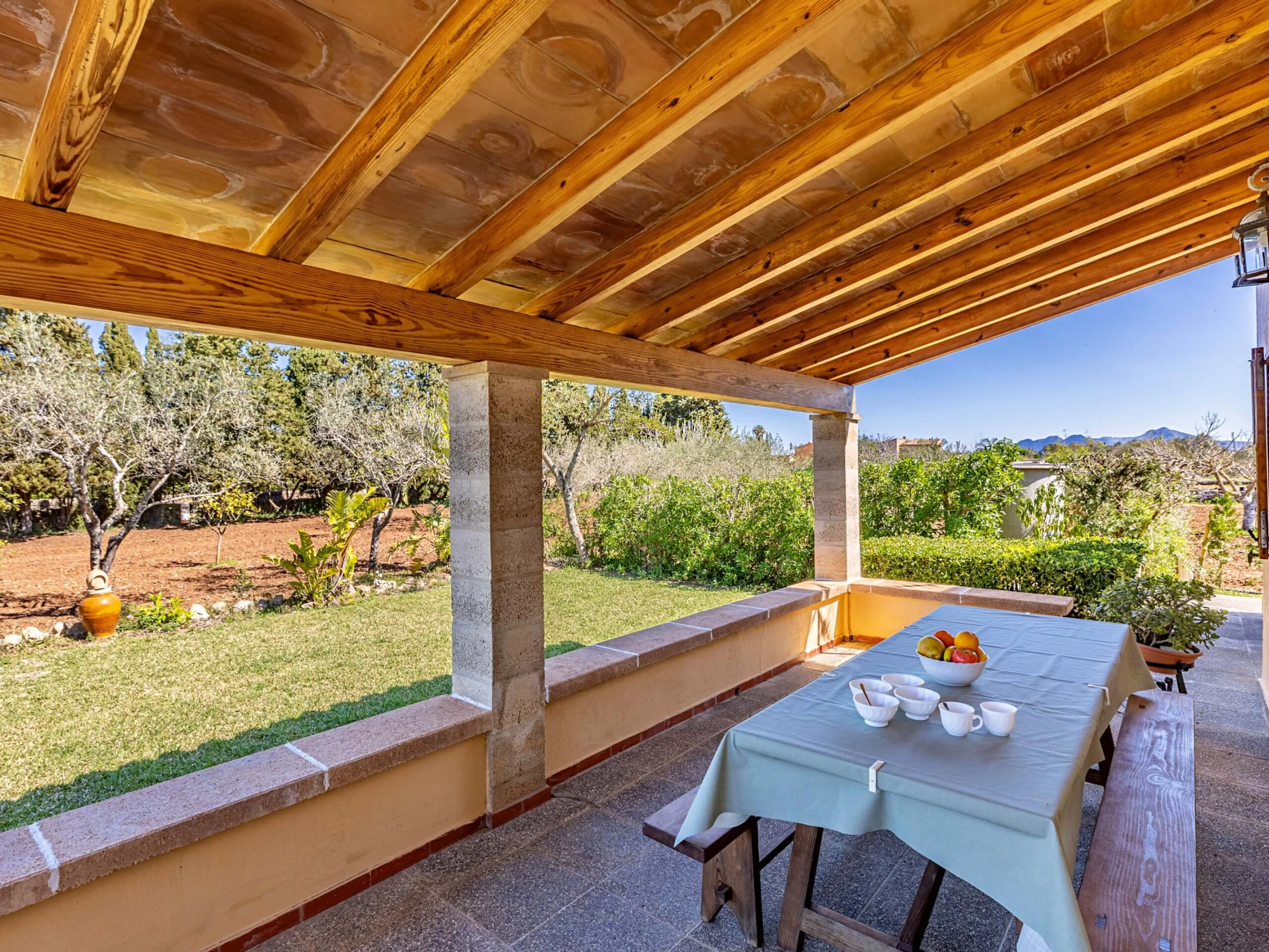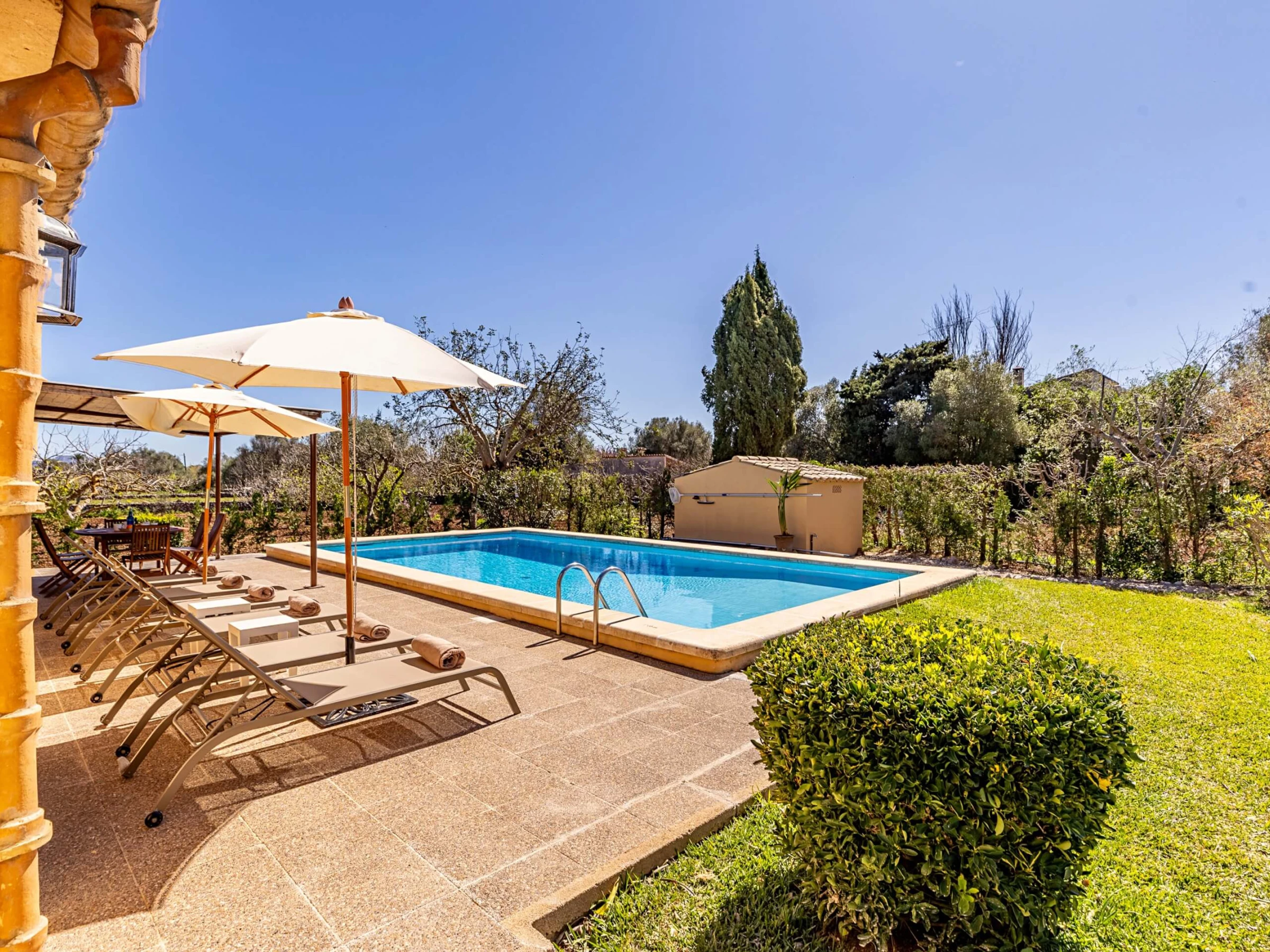 Villa Almadrava bietet eine gemütliche und ruhige Atmosphäre, ideal für diejenigen, die Privatsphäre und Erholung suchen. An der Vorderseite des Anwesens befindet sich eine geräumige, schattige Terrasse, die mit Esstischmobiliar ausgestattet ist und perfekt zum Genießen von Mahlzeiten im Freien ist. Darüber hinaus verfügt die Villa über zusätzliche überdachte Terrassen an den Seiten und auf der Rückseite, die verschiedene Bereiche vor der mallorquinischen Sonne im Laufe des Tages schützen. Der von Hecken umgebene Garten schafft eine intime und angenehme Umgebung, um sich neben dem Pool zu entspannen oder im Schatten zu ruhen.