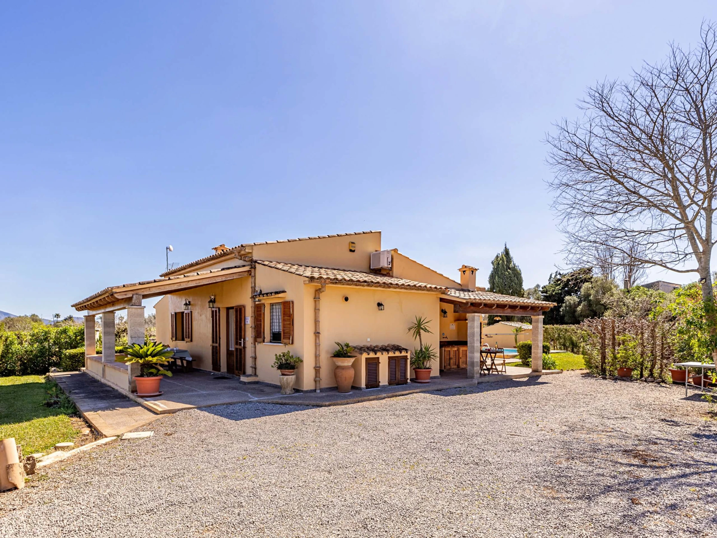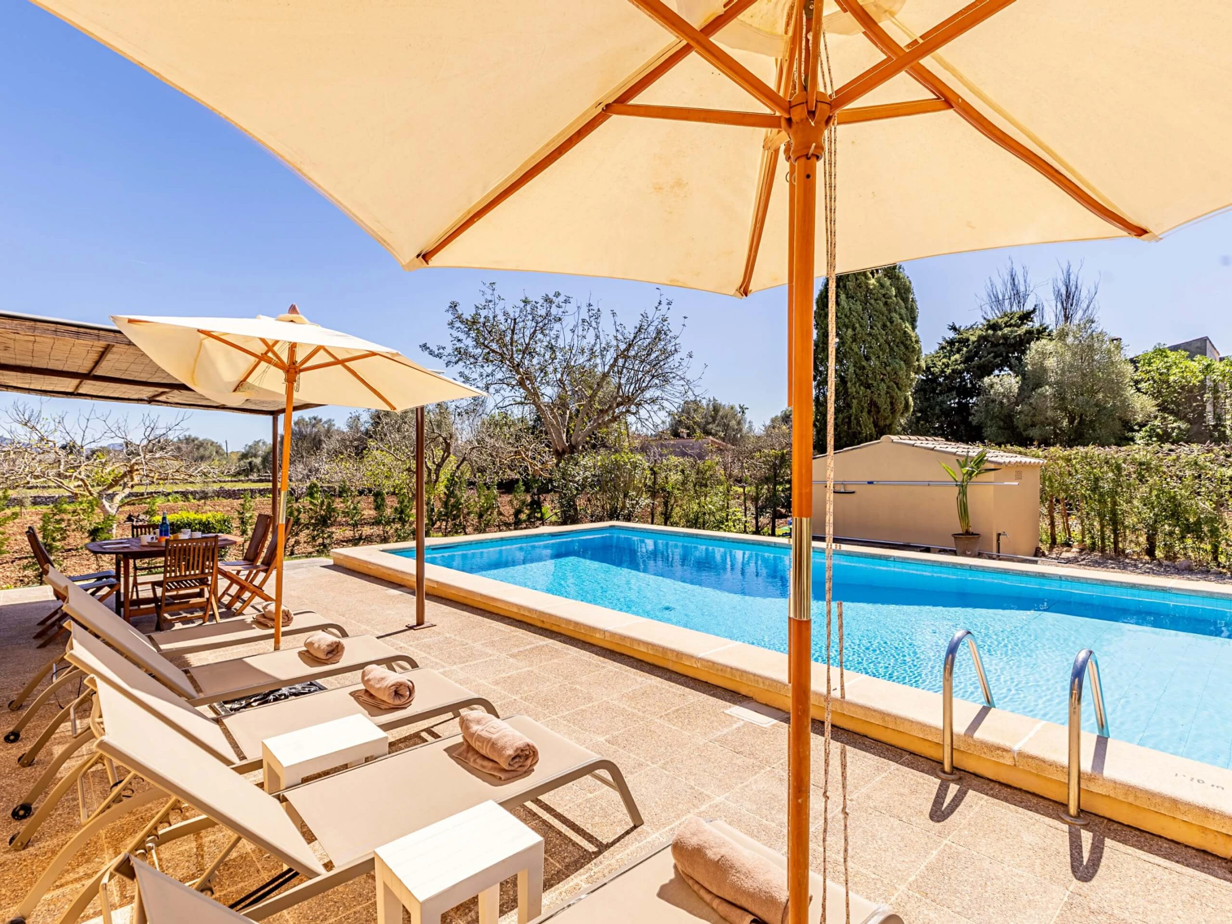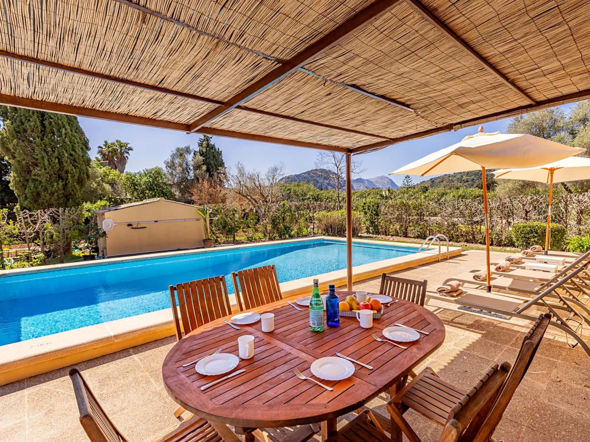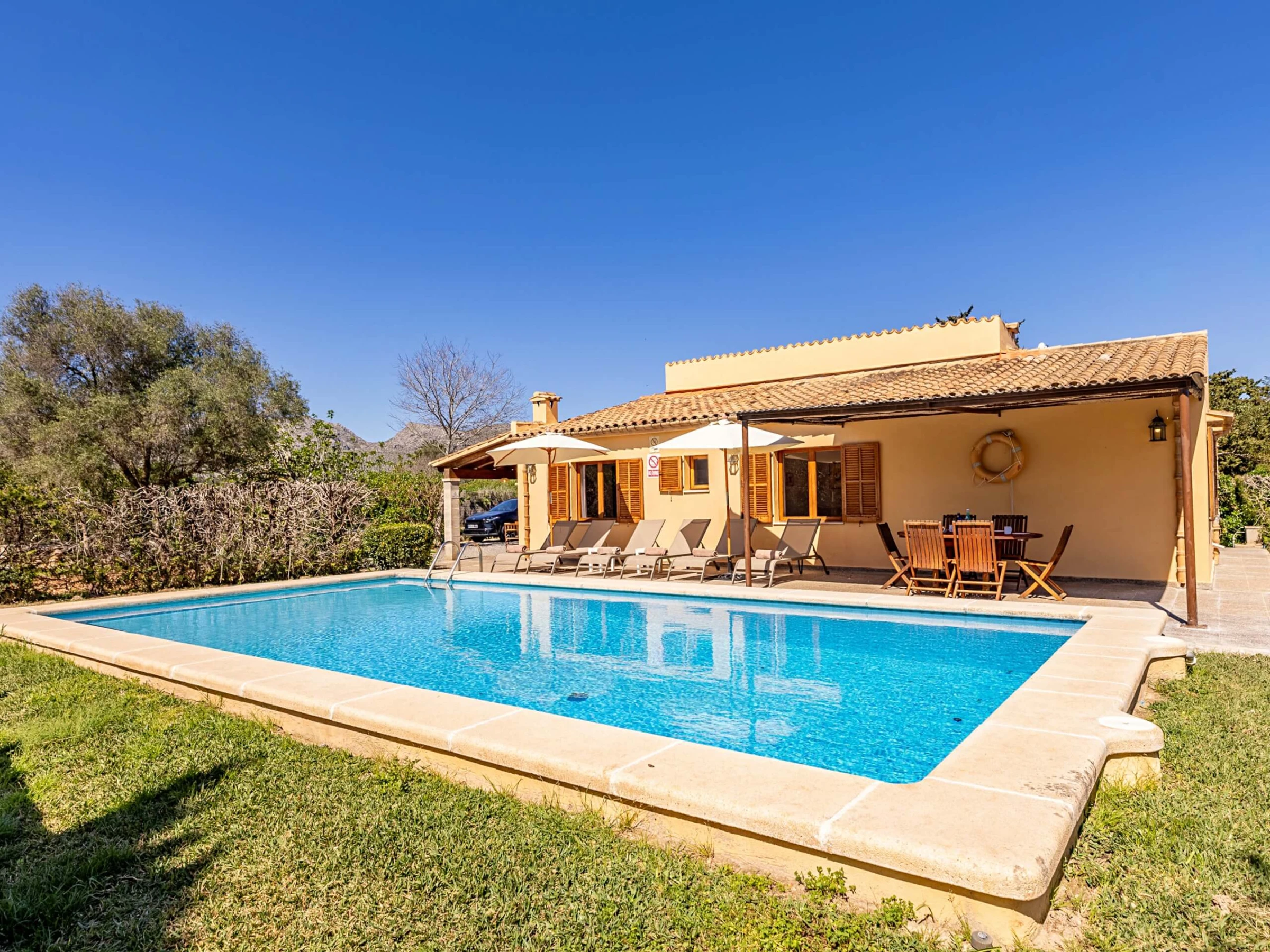 Villa Almadrava bietet eine gemütliche und ruhige Atmosphäre, ideal für diejenigen, die Privatsphäre und Erholung suchen. An der Vorderseite des Anwesens befindet sich eine geräumige, schattige Terrasse, die mit Esstischmobiliar ausgestattet ist und perfekt zum Genießen von Mahlzeiten im Freien ist. Darüber hinaus verfügt die Villa über zusätzliche überdachte Terrassen an den Seiten und auf der Rückseite, die verschiedene Bereiche vor der mallorquinischen Sonne im Laufe des Tages schützen. Der von Hecken umgebene Garten schafft eine intime und angenehme Umgebung, um sich neben dem Pool zu entspannen oder im Schatten zu ruhen.