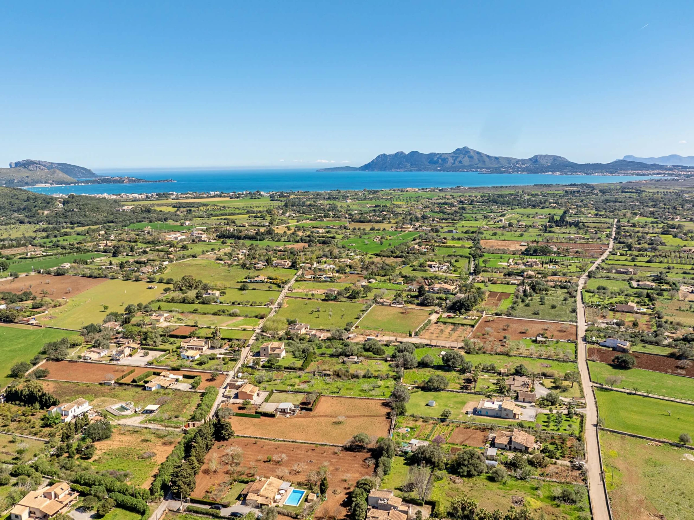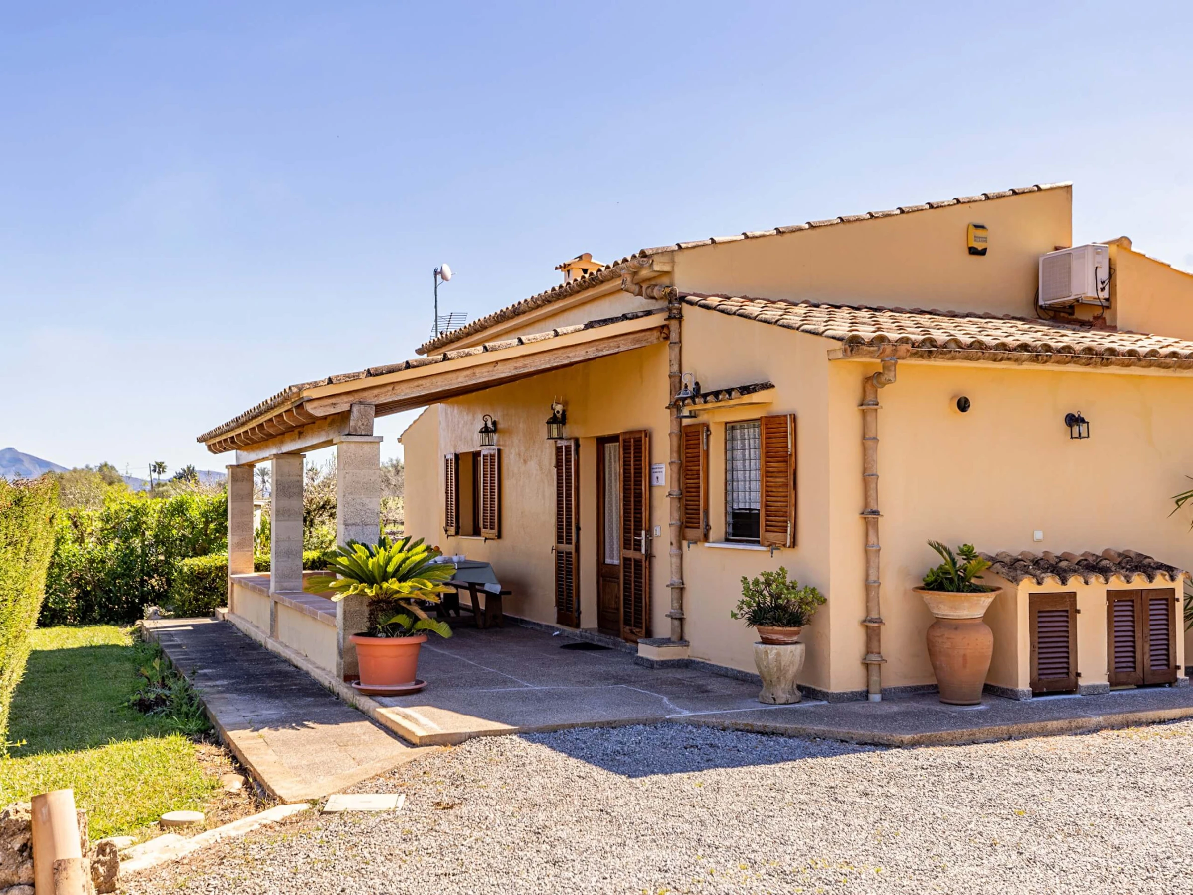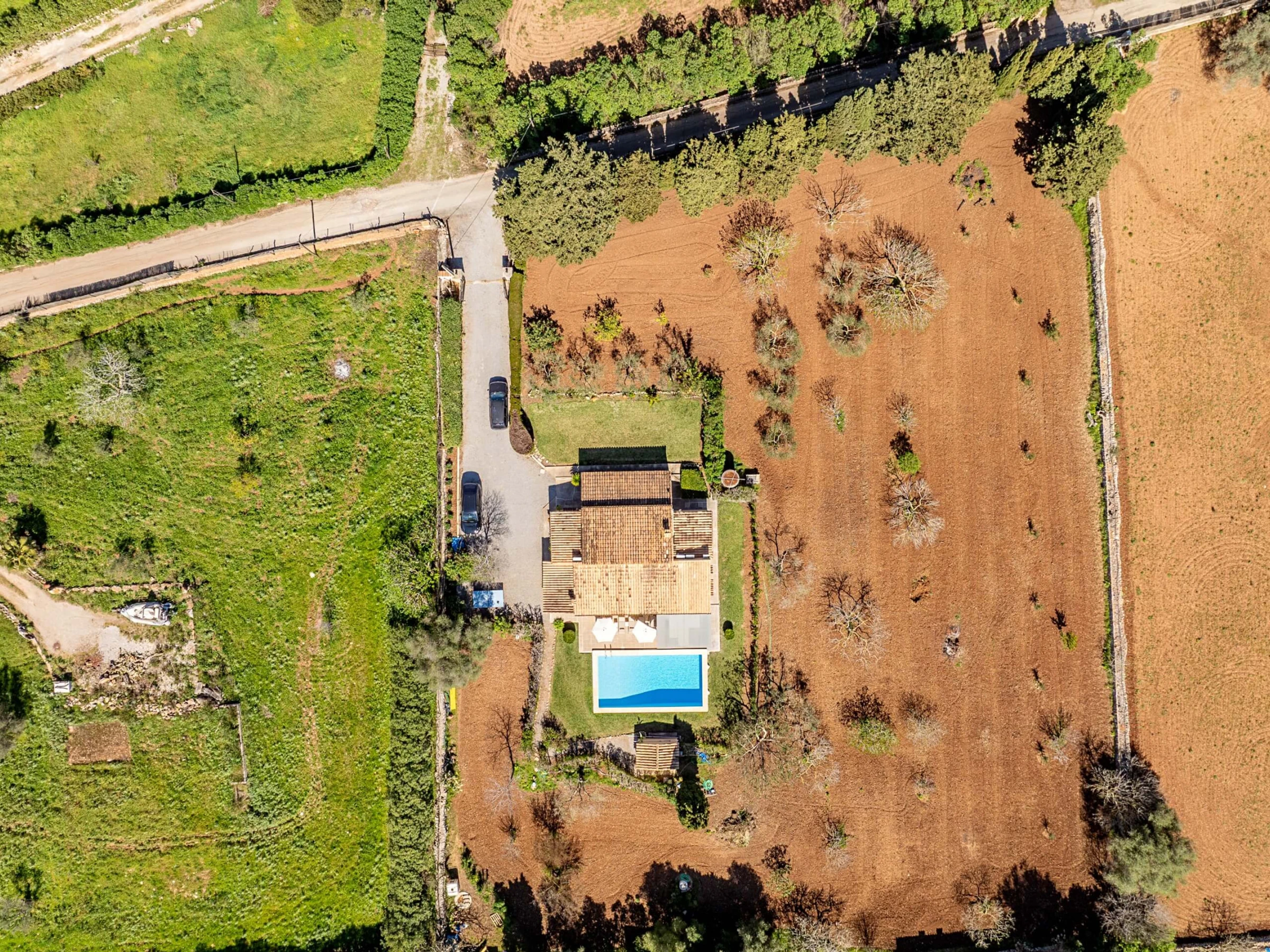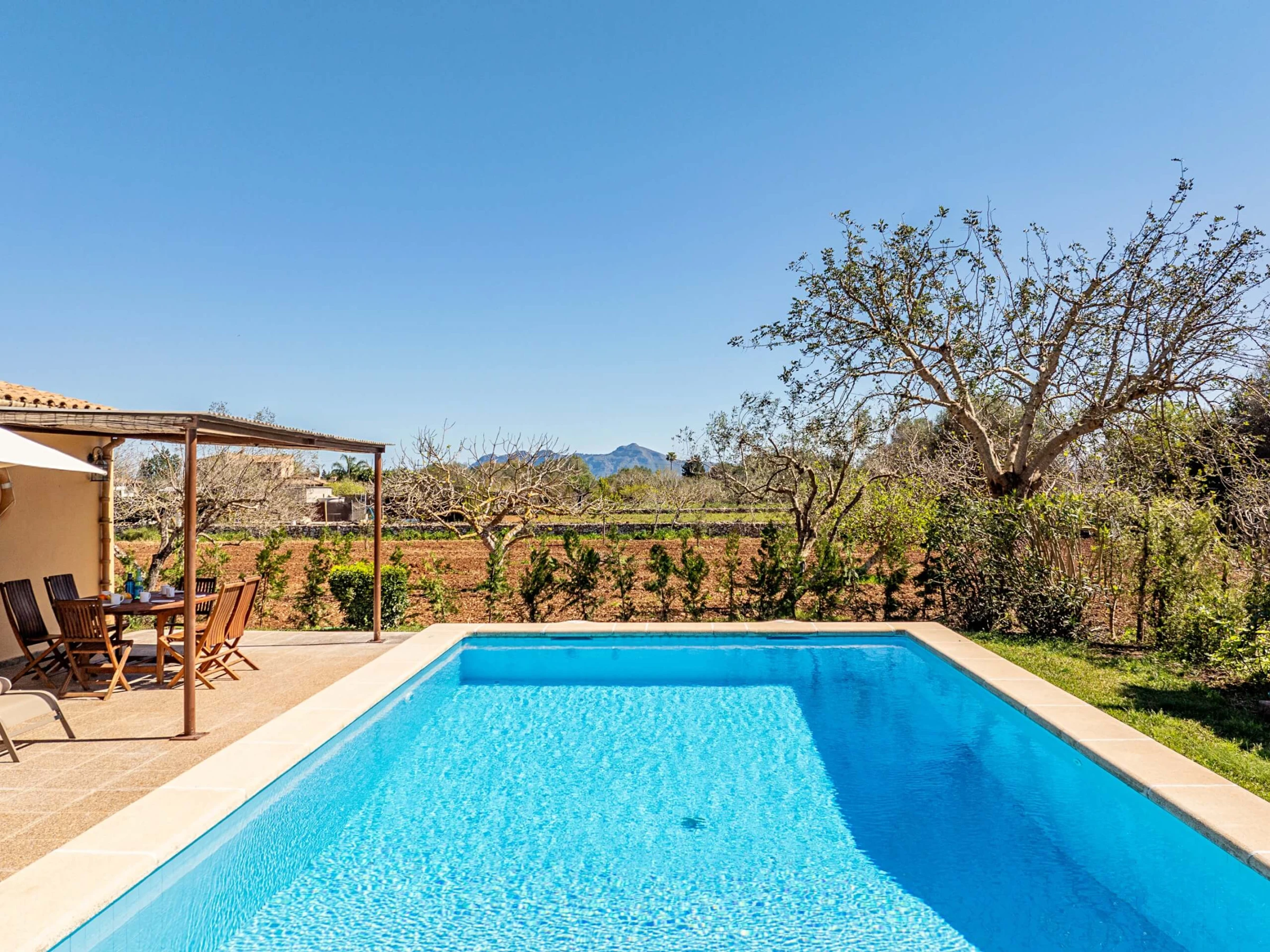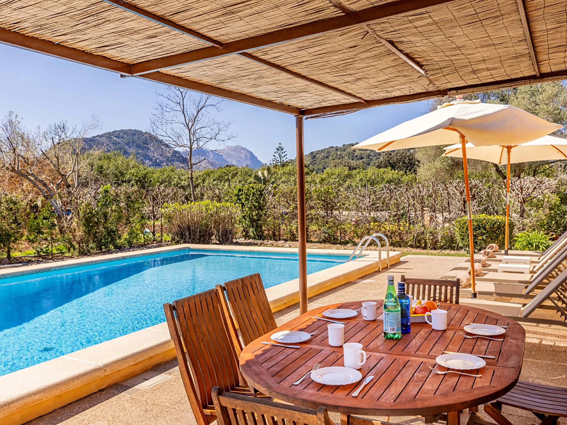 Villa Almadrava bietet eine gemütliche und ruhige Atmosphäre, ideal für diejenigen, die Privatsphäre und Erholung suchen. An der Vorderseite des Anwesens befindet sich eine geräumige, schattige Terrasse, die mit Esstischmobiliar ausgestattet ist und perfekt zum Genießen von Mahlzeiten im Freien ist. Darüber hinaus verfügt die Villa über zusätzliche überdachte Terrassen an den Seiten und auf der Rückseite, die verschiedene Bereiche vor der mallorquinischen Sonne im Laufe des Tages schützen. Der von Hecken umgebene Garten schafft eine intime und angenehme Umgebung, um sich neben dem Pool zu entspannen oder im Schatten zu ruhen.