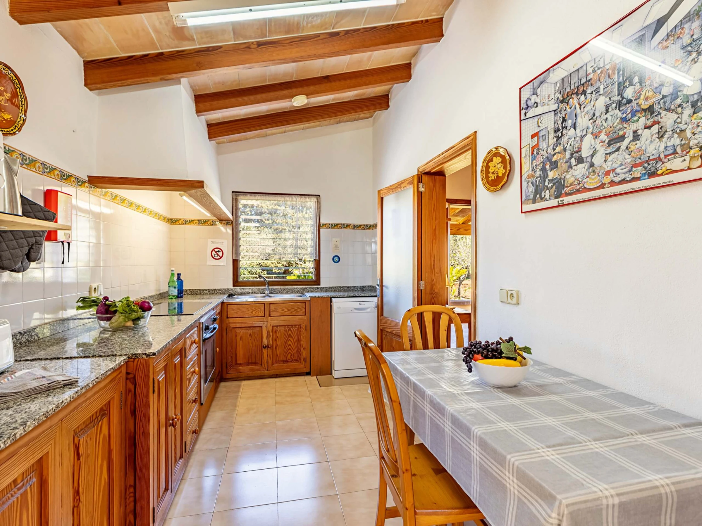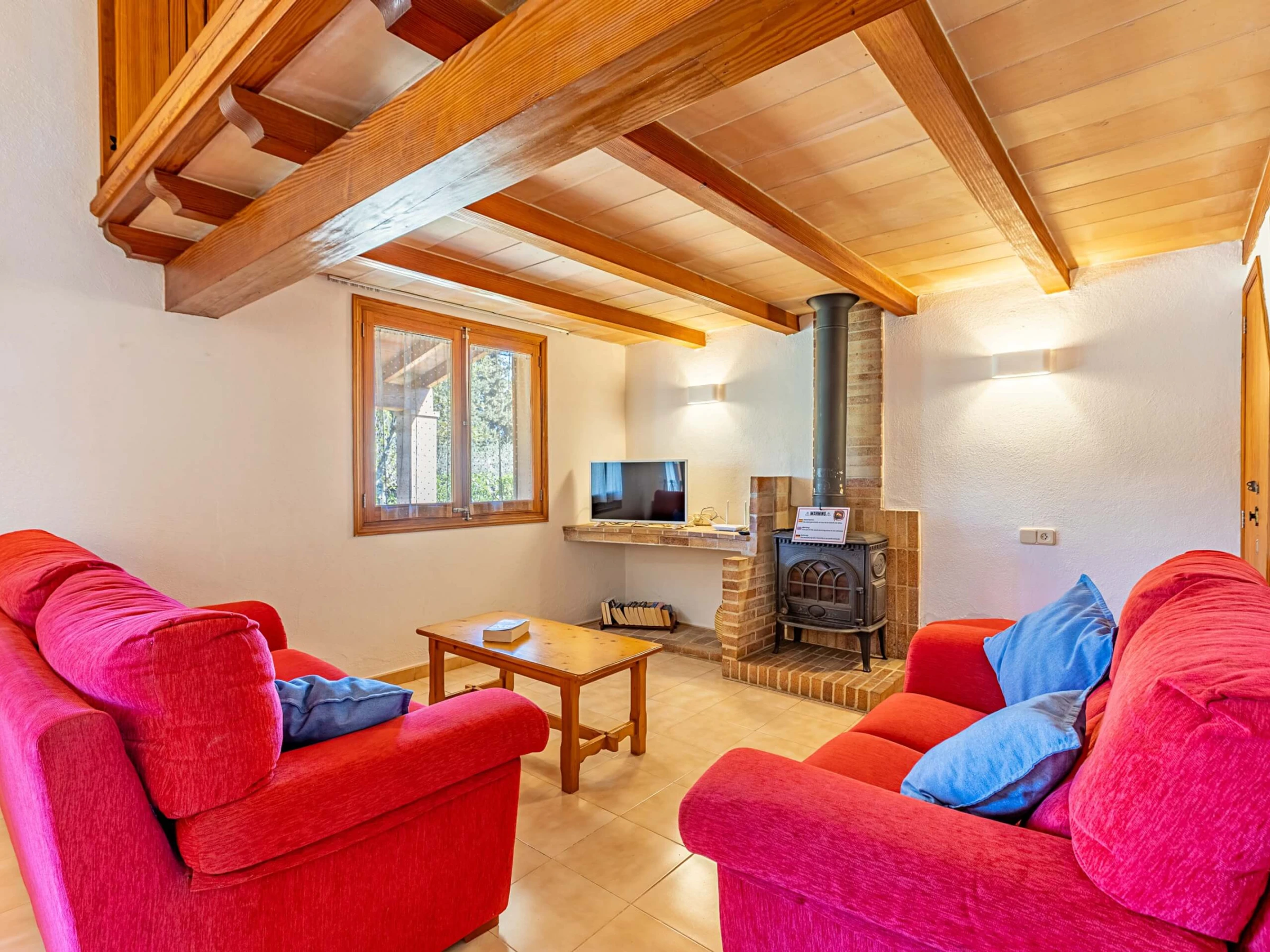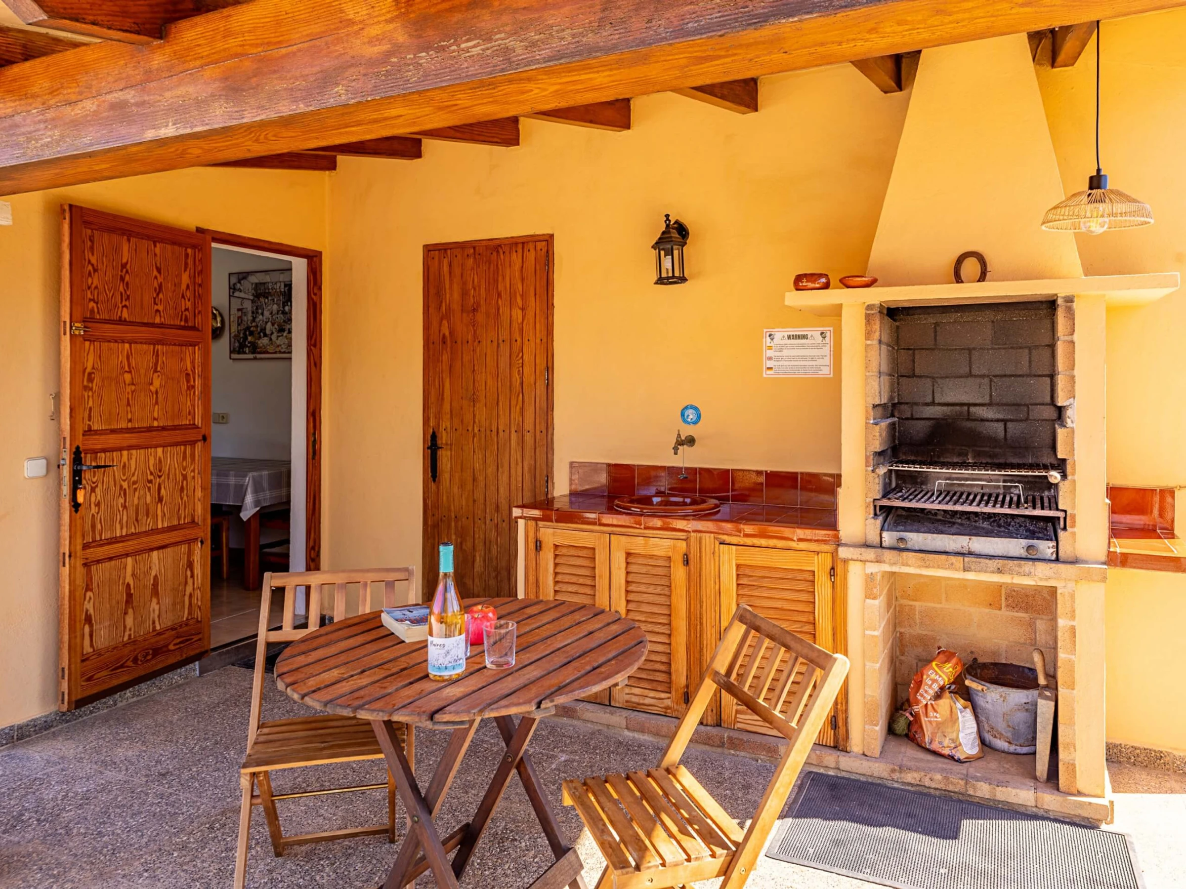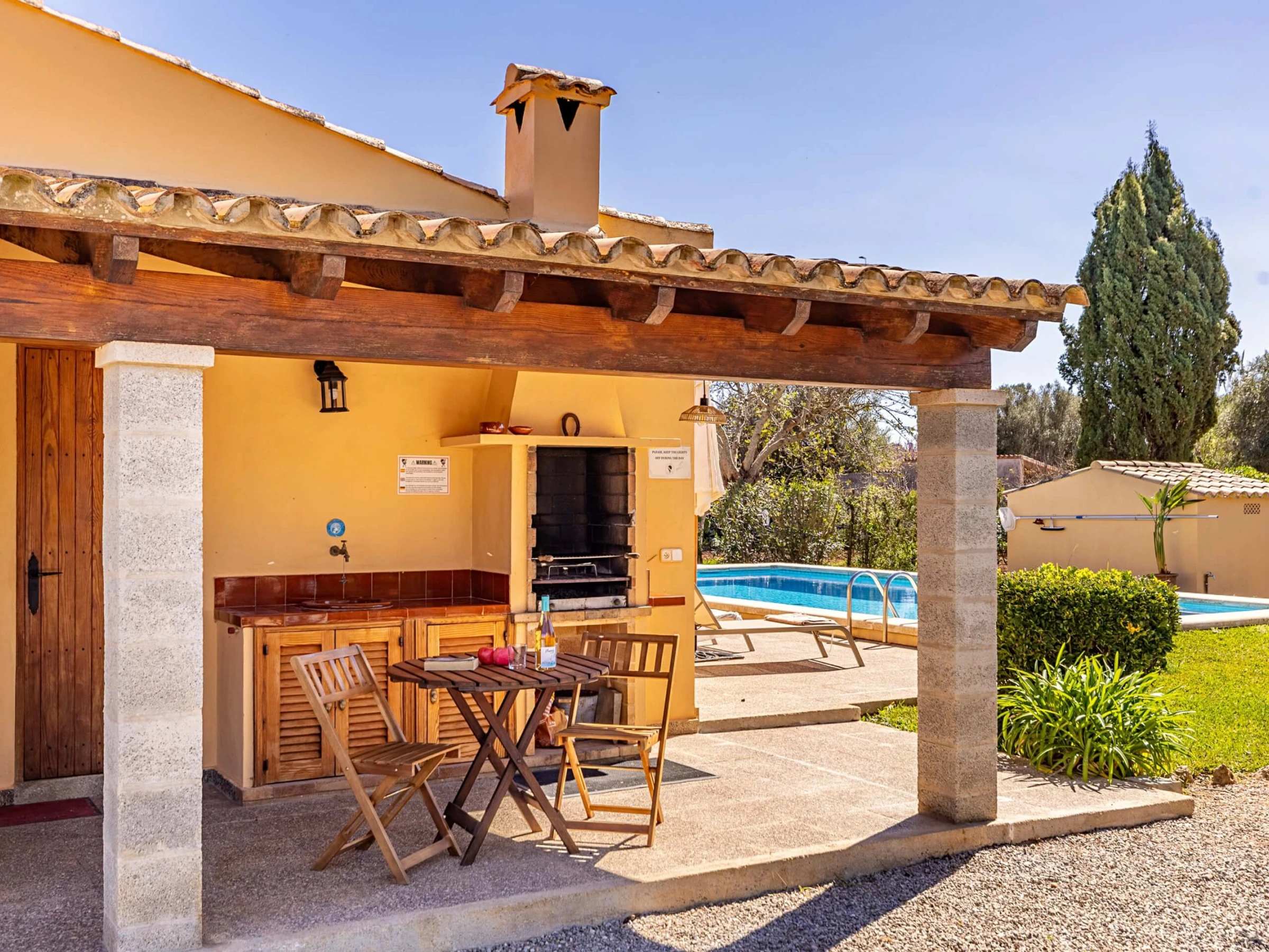 Im Inneren präsentiert die Villa einen traditionellen mallorquinischen Stil mit Kiefernmöbeln, Decken mit Holzbalken und Bodenfliesen, die ein authentisches und warmes Gefühl vermitteln. Die Klimaanlage garantiert Komfort während der heißesten Nachmittage und Nächte, mit programmiertem Betrieb von 14:00 bis 16:00 Uhr und von 20:00 bis 08:00 Uhr. Die Küche ist vollständig ausgestattet mit allem Notwendigen, um Mahlzeiten während des Aufenthalts zuzubereiten, während der gemauerte Außengrill eine hervorragende Alternative für Abendessen im Freien bietet.