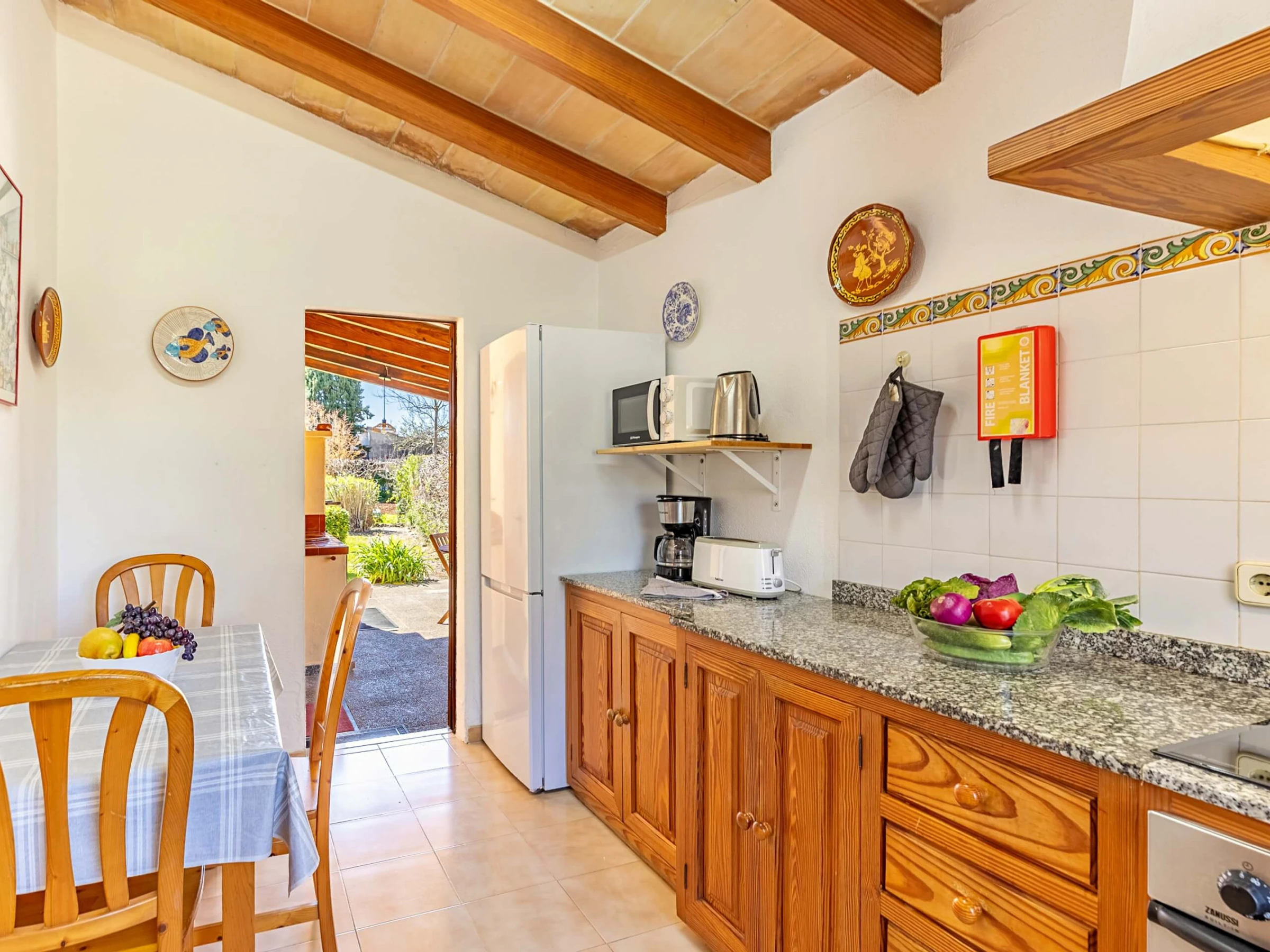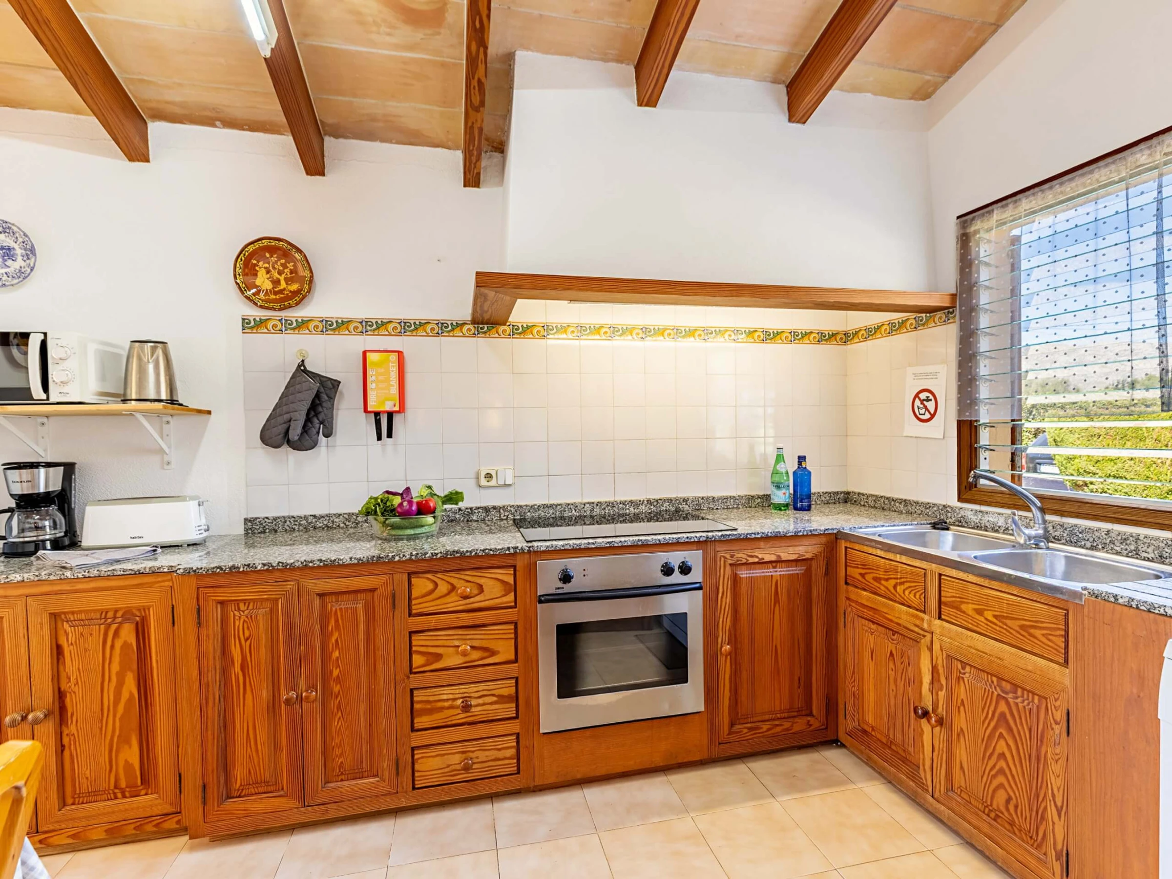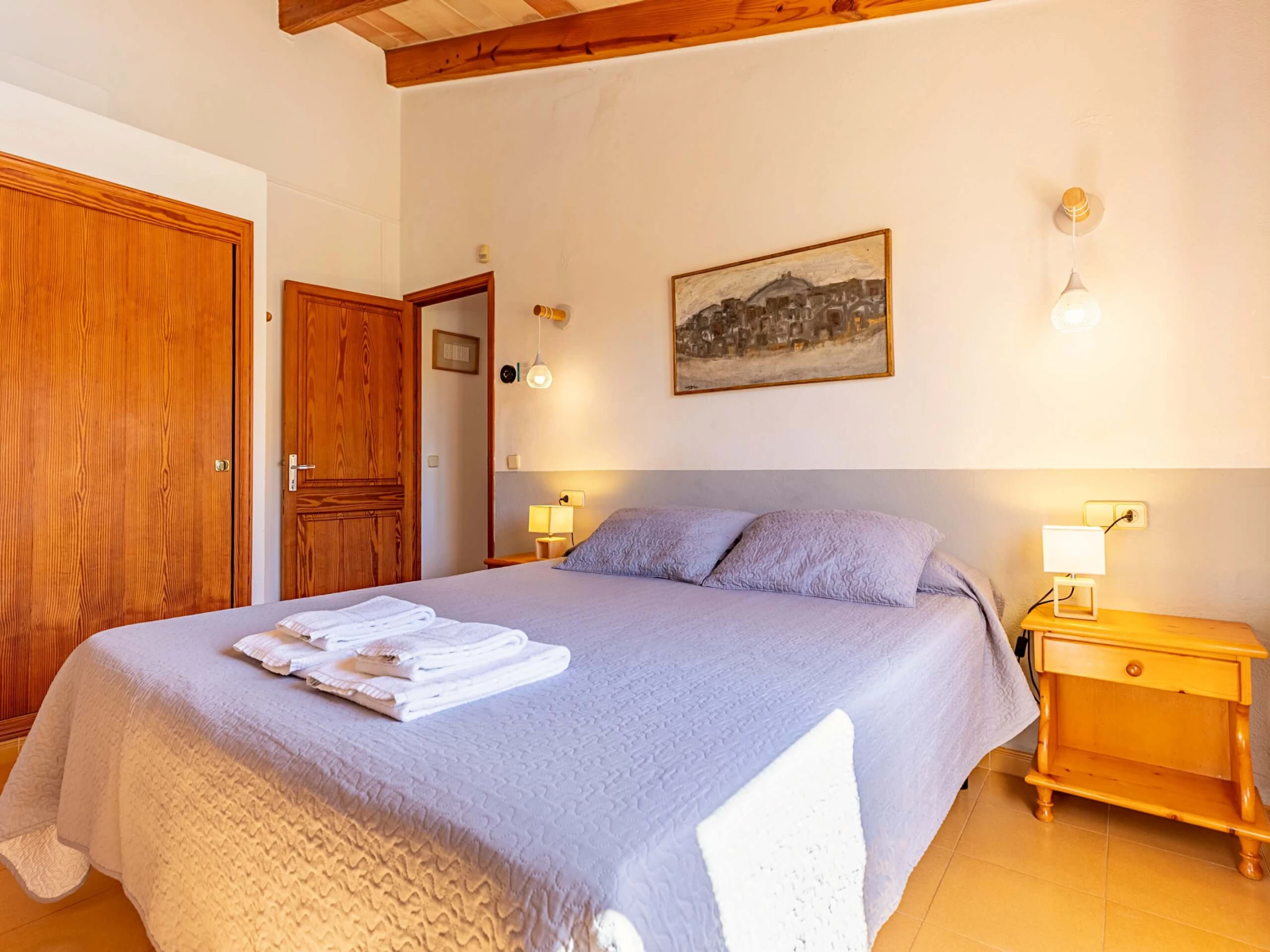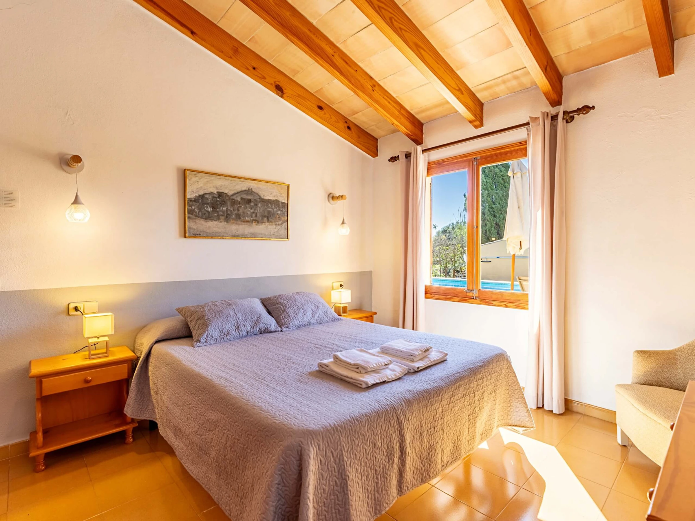 Im Inneren präsentiert die Villa einen traditionellen mallorquinischen Stil mit Kiefernmöbeln, Decken mit Holzbalken und Bodenfliesen, die ein authentisches und warmes Gefühl vermitteln. Die Klimaanlage garantiert Komfort während der heißesten Nachmittage und Nächte, mit programmiertem Betrieb von 14:00 bis 16:00 Uhr und von 20:00 bis 08:00 Uhr. Die Küche ist vollständig ausgestattet mit allem Notwendigen, um Mahlzeiten während des Aufenthalts zuzubereiten, während der gemauerte Außengrill eine hervorragende Alternative für Abendessen im Freien bietet.