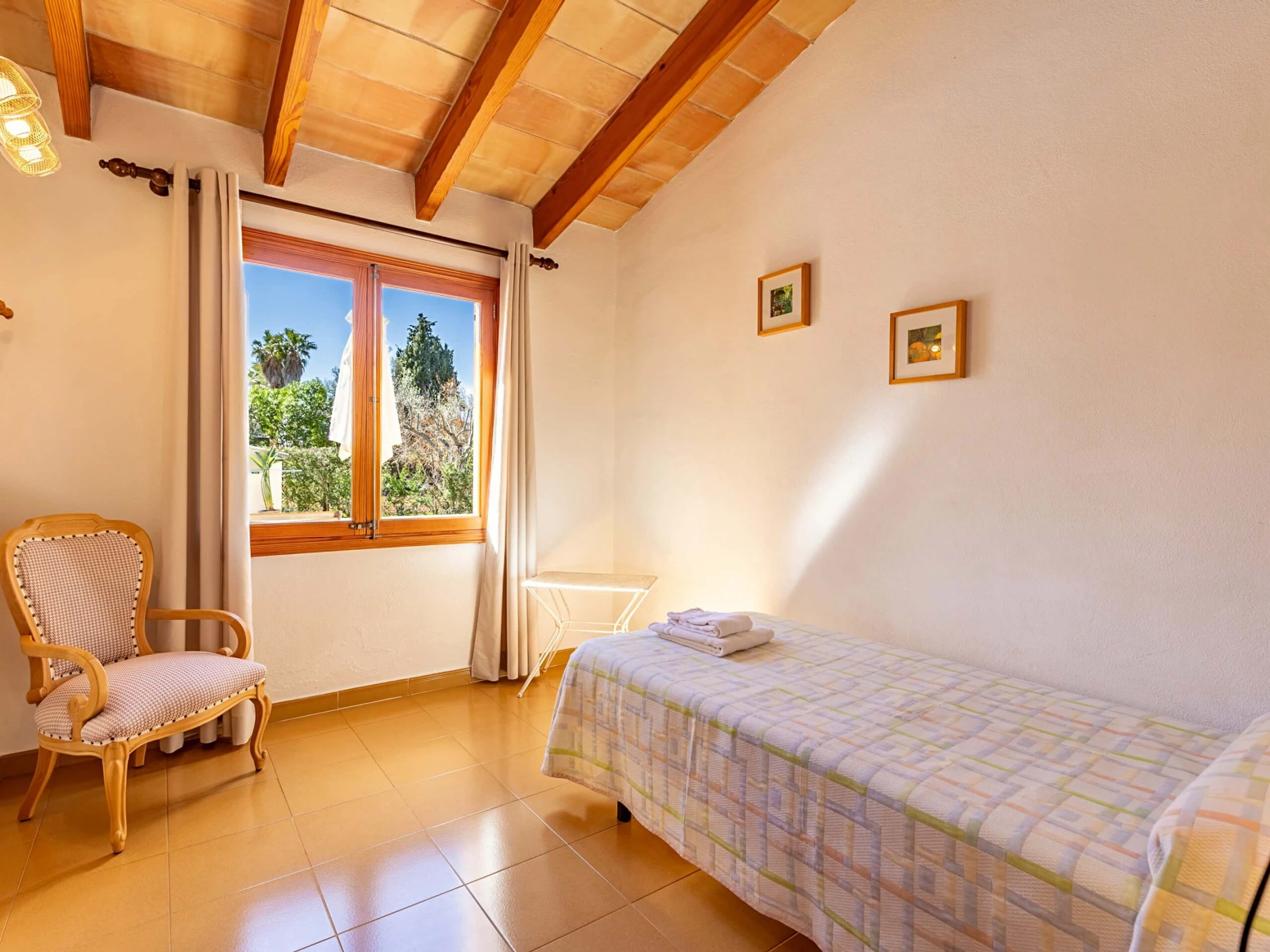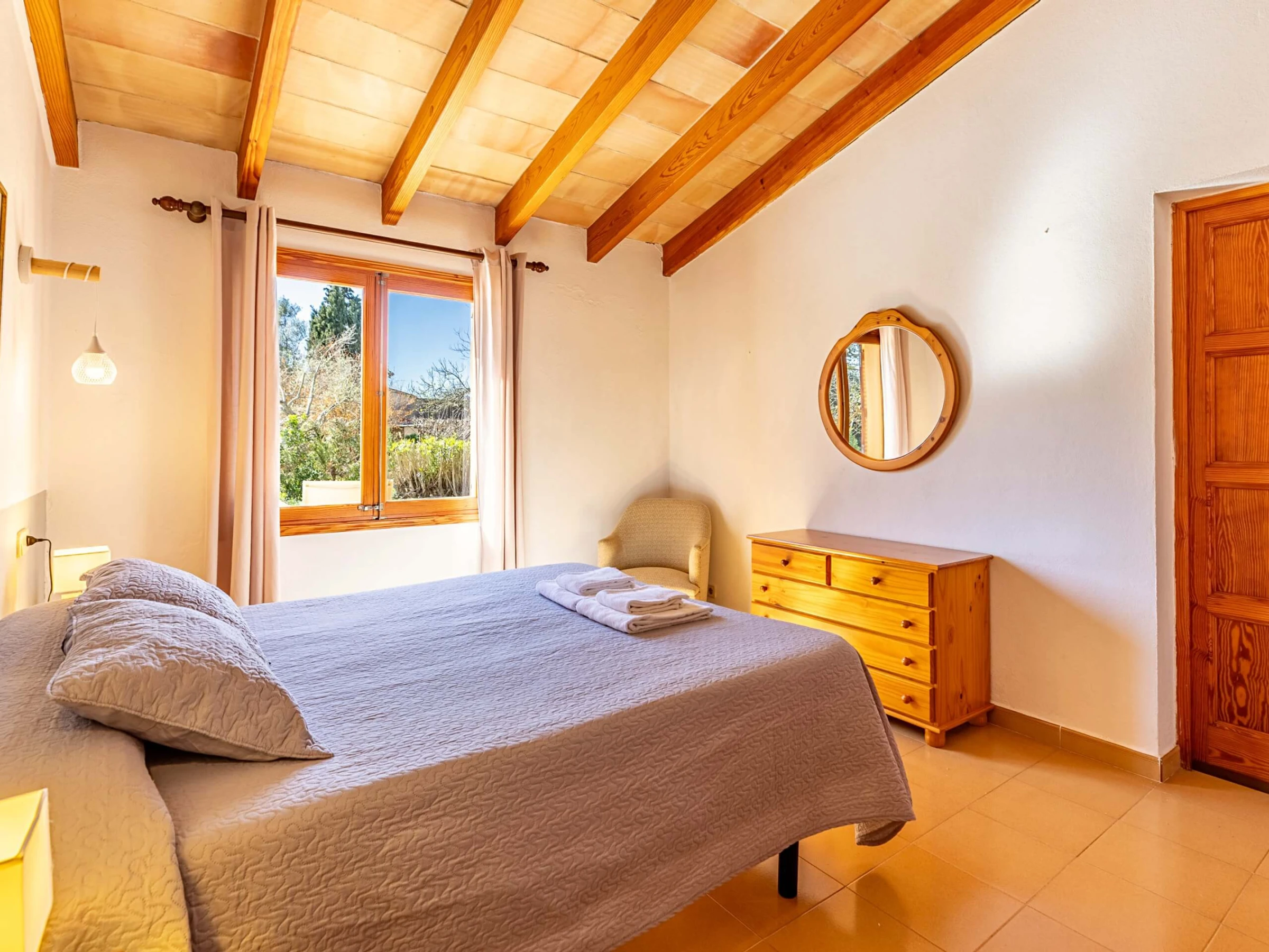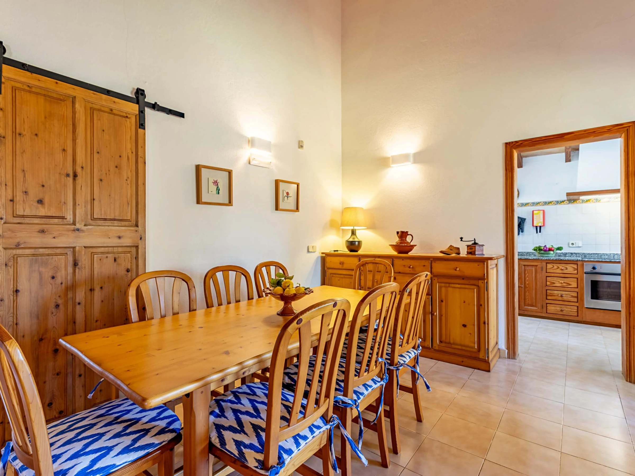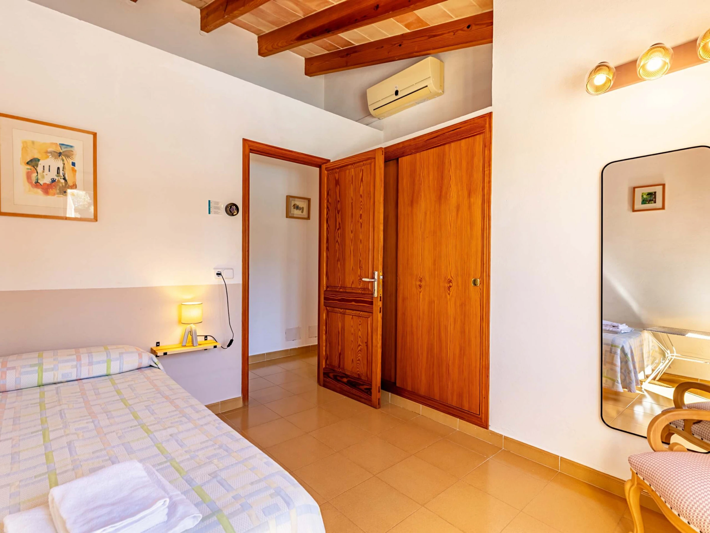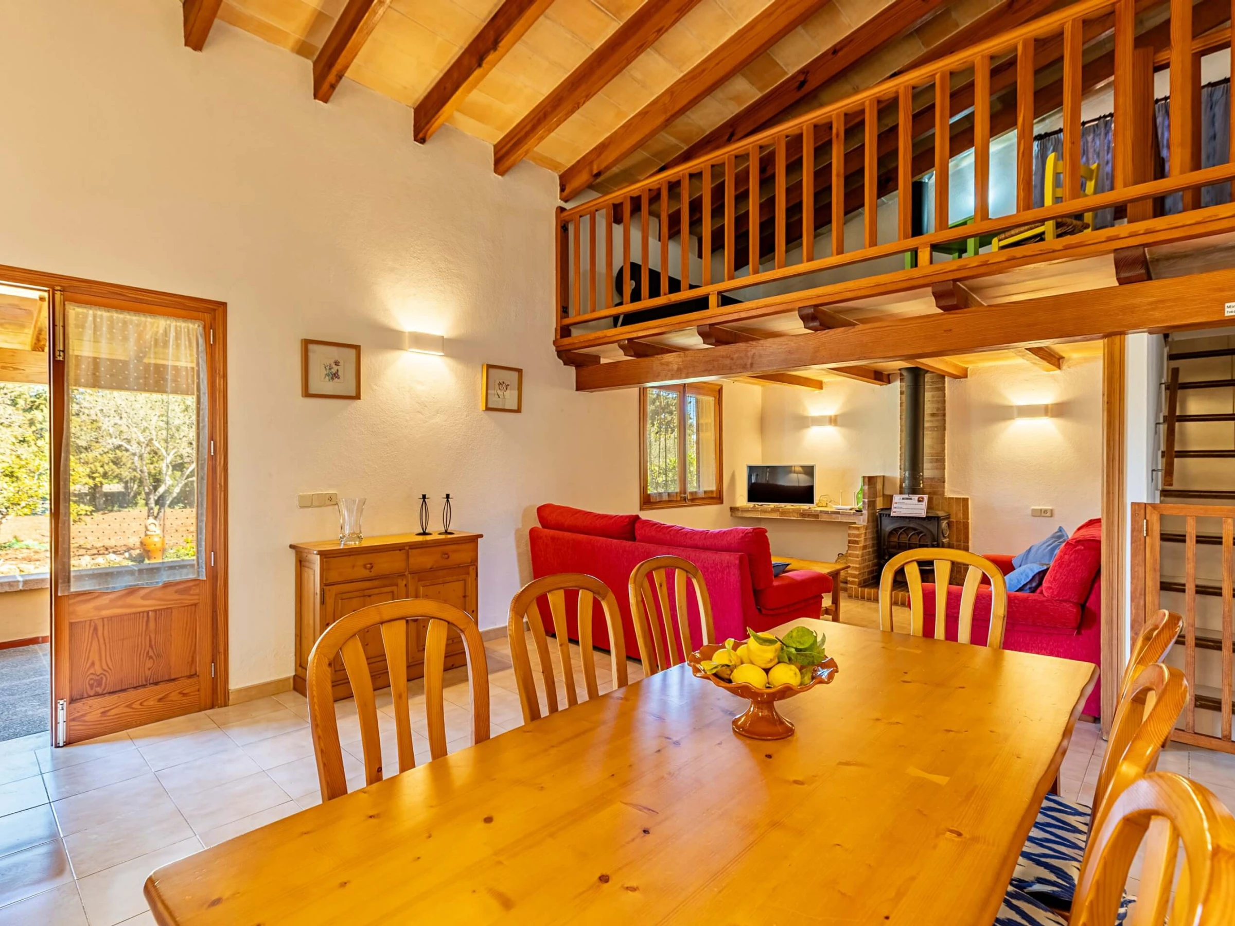 Im Inneren präsentiert die Villa einen traditionellen mallorquinischen Stil mit Kiefernmöbeln, Decken mit Holzbalken und Bodenfliesen, die ein authentisches und warmes Gefühl vermitteln. Die Klimaanlage garantiert Komfort während der heißesten Nachmittage und Nächte, mit programmiertem Betrieb von 14:00 bis 16:00 Uhr und von 20:00 bis 08:00 Uhr. Die Küche ist vollständig ausgestattet mit allem Notwendigen, um Mahlzeiten während des Aufenthalts zuzubereiten, während der gemauerte Außengrill eine hervorragende Alternative für Abendessen im Freien bietet.
