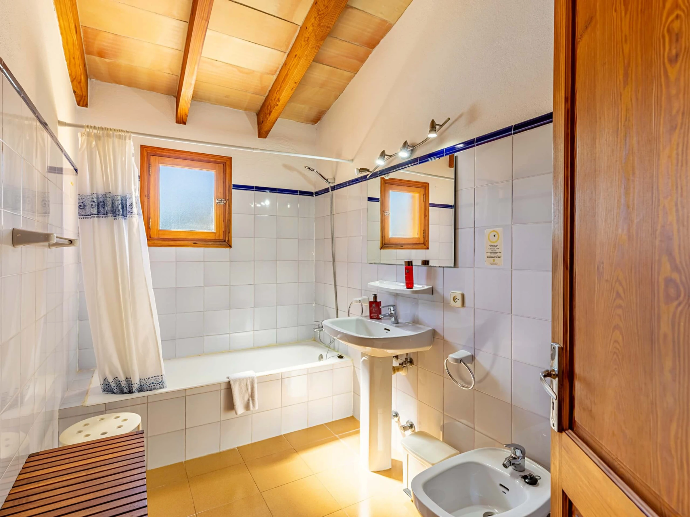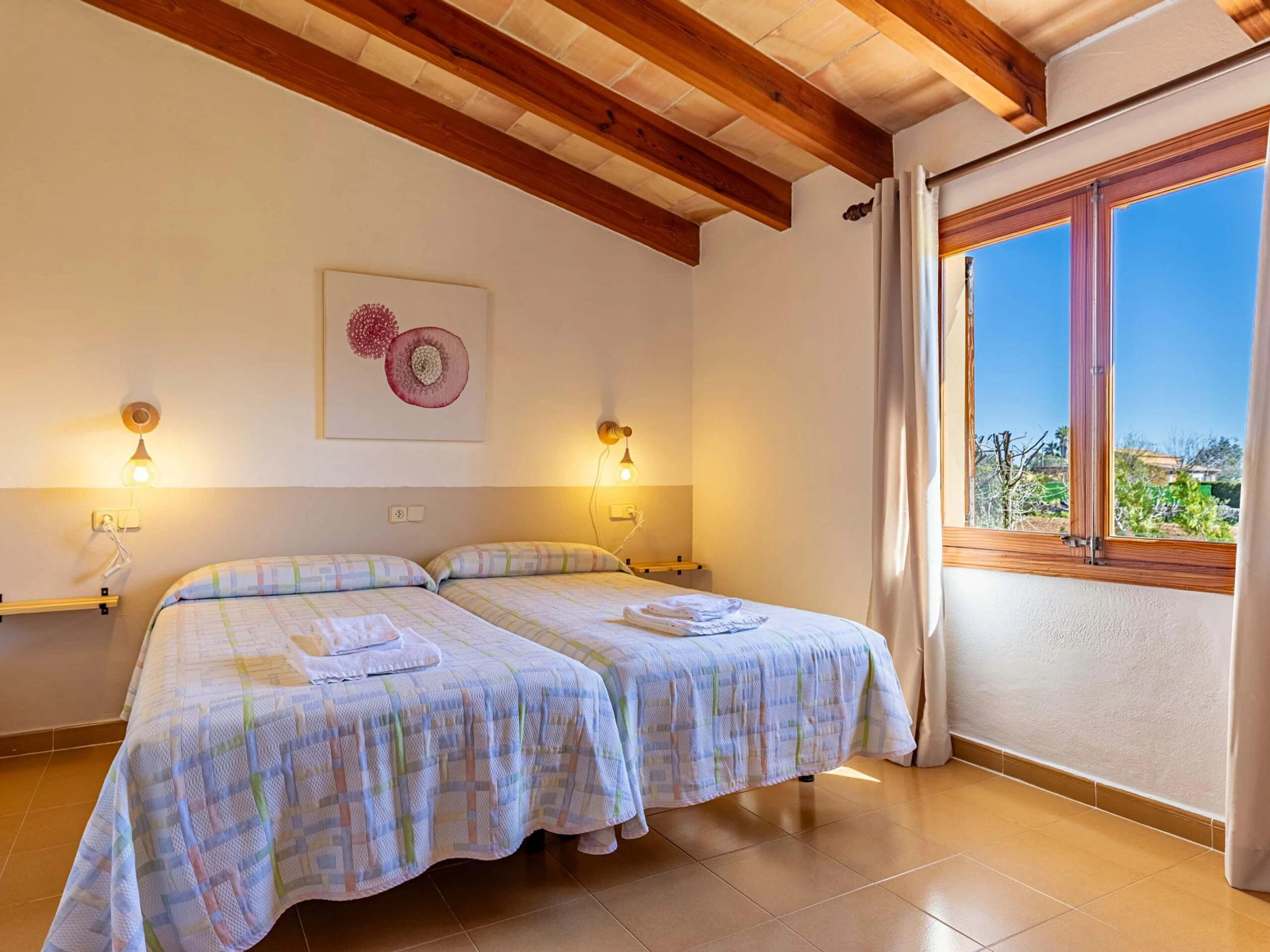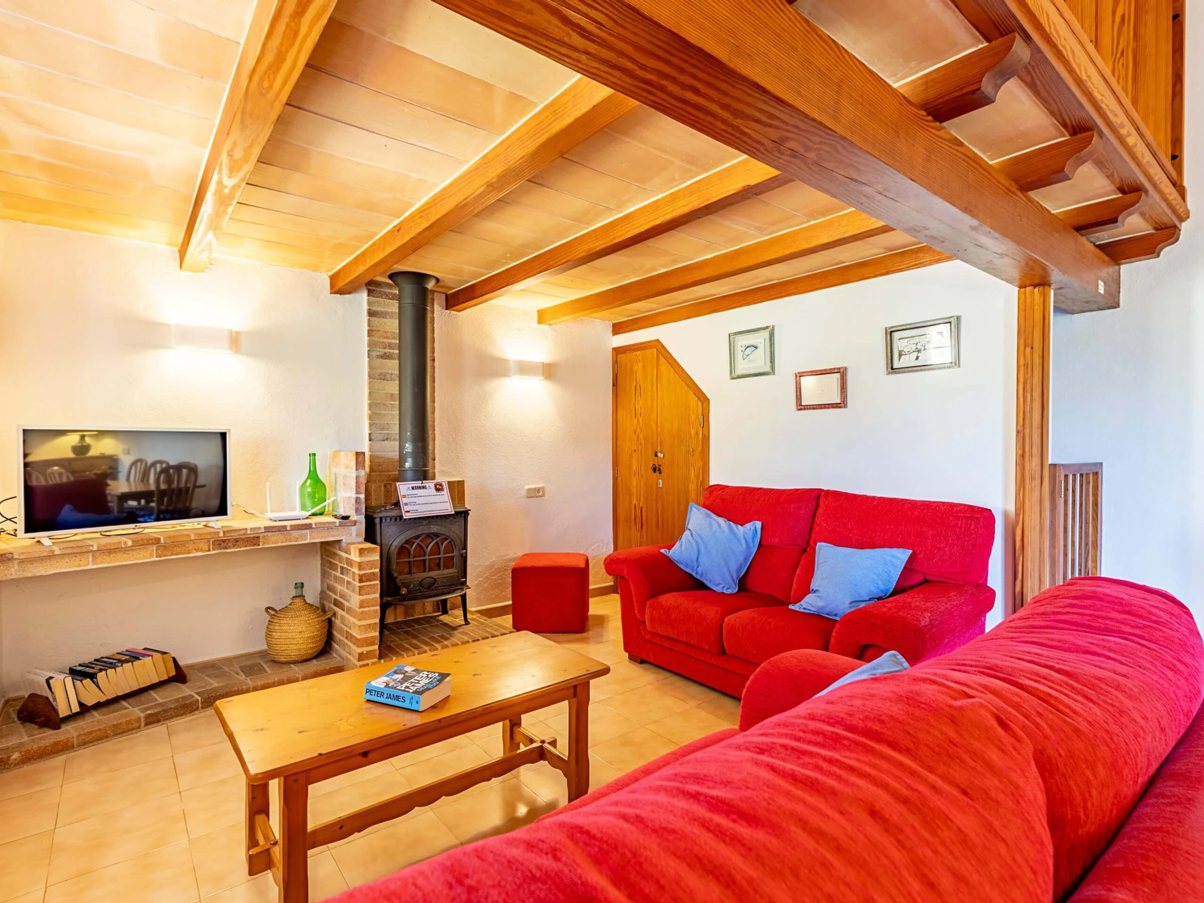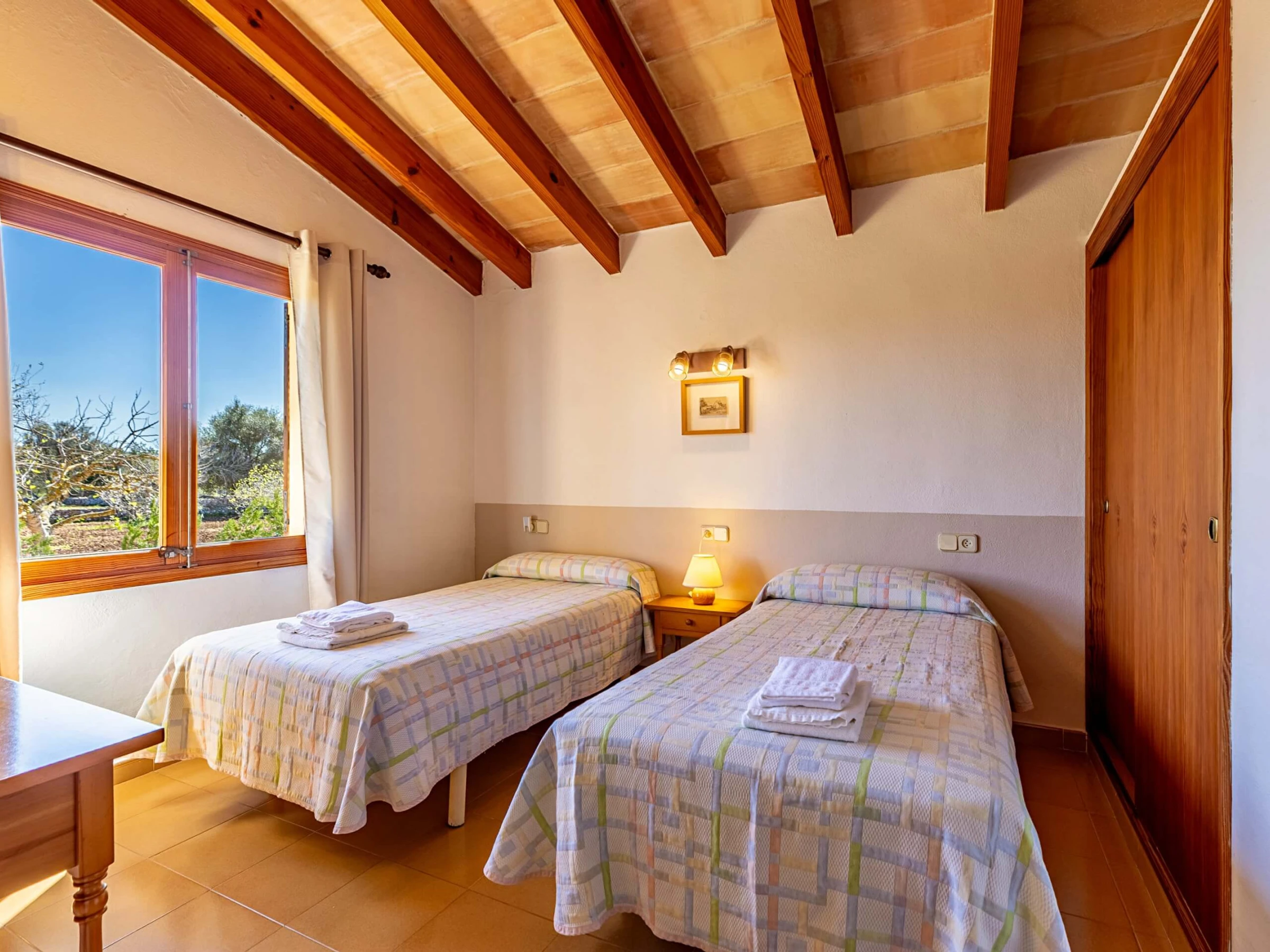 Im Inneren präsentiert die Villa einen traditionellen mallorquinischen Stil mit Kiefernmöbeln, Decken mit Holzbalken und Bodenfliesen, die ein authentisches und warmes Gefühl vermitteln. Die Klimaanlage garantiert Komfort während der heißesten Nachmittage und Nächte, mit programmiertem Betrieb von 14:00 bis 16:00 Uhr und von 20:00 bis 08:00 Uhr. Die Küche ist vollständig ausgestattet mit allem Notwendigen, um Mahlzeiten während des Aufenthalts zuzubereiten, während der gemauerte Außengrill eine hervorragende Alternative für Abendessen im Freien bietet.