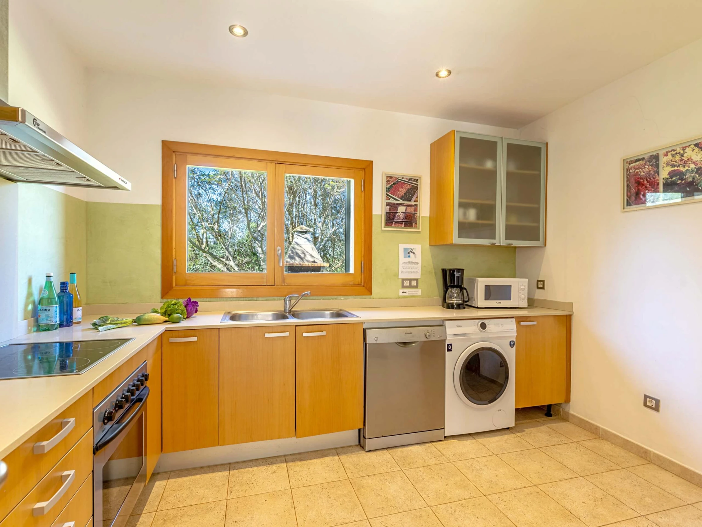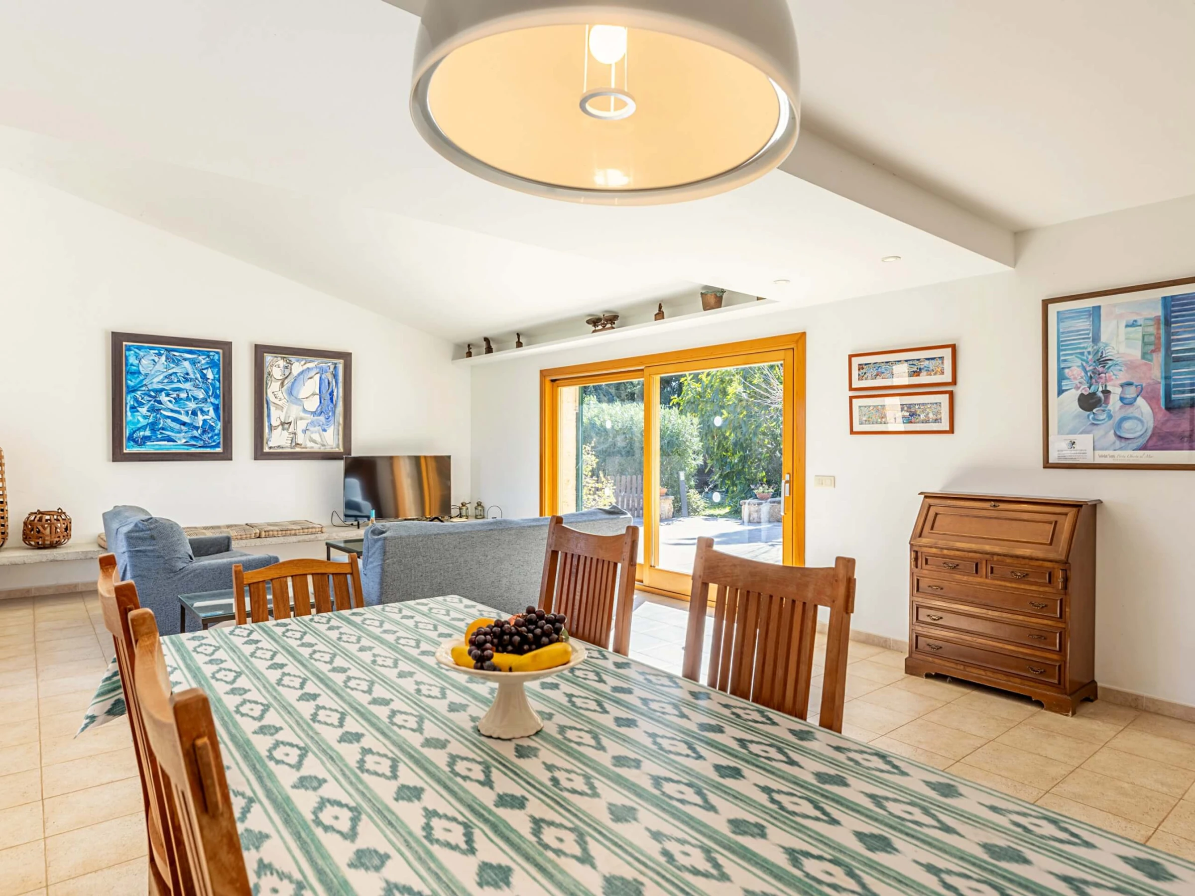 Im Inneren befindet sich ein geräumiges Wohn-Esszimmer mit großen Schiebetüren, die einen Panoramablick auf die umliegende Landschaft bieten. Das Wohnzimmer ist mit zwei bequemen Sofas und Kissen ausgestattet, und der Teakholz-Esstisch ist perfekt, um gemeinsam zu speisen. Neben dem Wohnzimmer befindet sich eine voll ausgestattete Küche mit Zugang zu einer überdachten Terrasse, die mit einem Teakholztisch und -stühlen ausgestattet ist, ideal zum Draußenessen, neben einem separaten Grill.