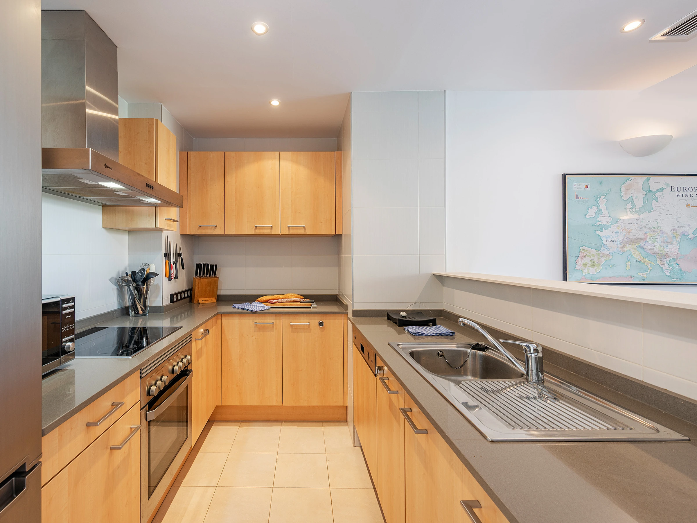 Dieses offene küche, mit ceranfeld, ist ausgestattet in kühlschrank, mikrowelle, backofen, gefrierschrank, spülmaschine, geschirr/besteck, kochutensilien, kaffeemaschine, toaster, wasserkocher und saftpresse.