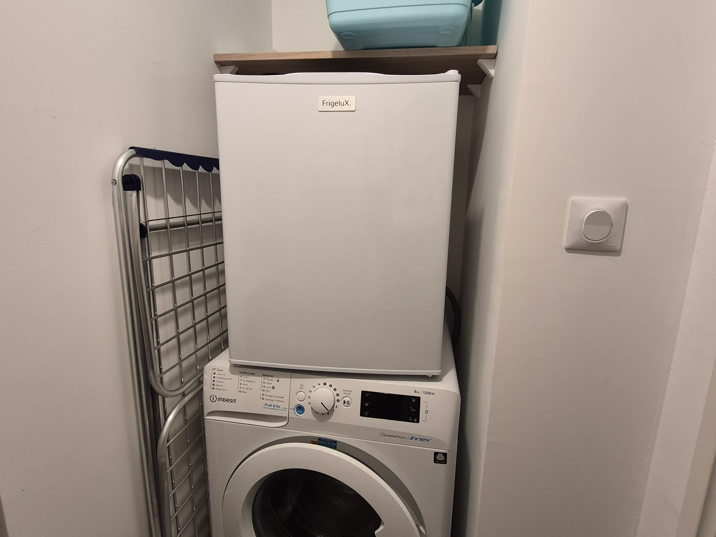 Modernes Bad mit Dusche, Haartrockner und Waschmaschine.