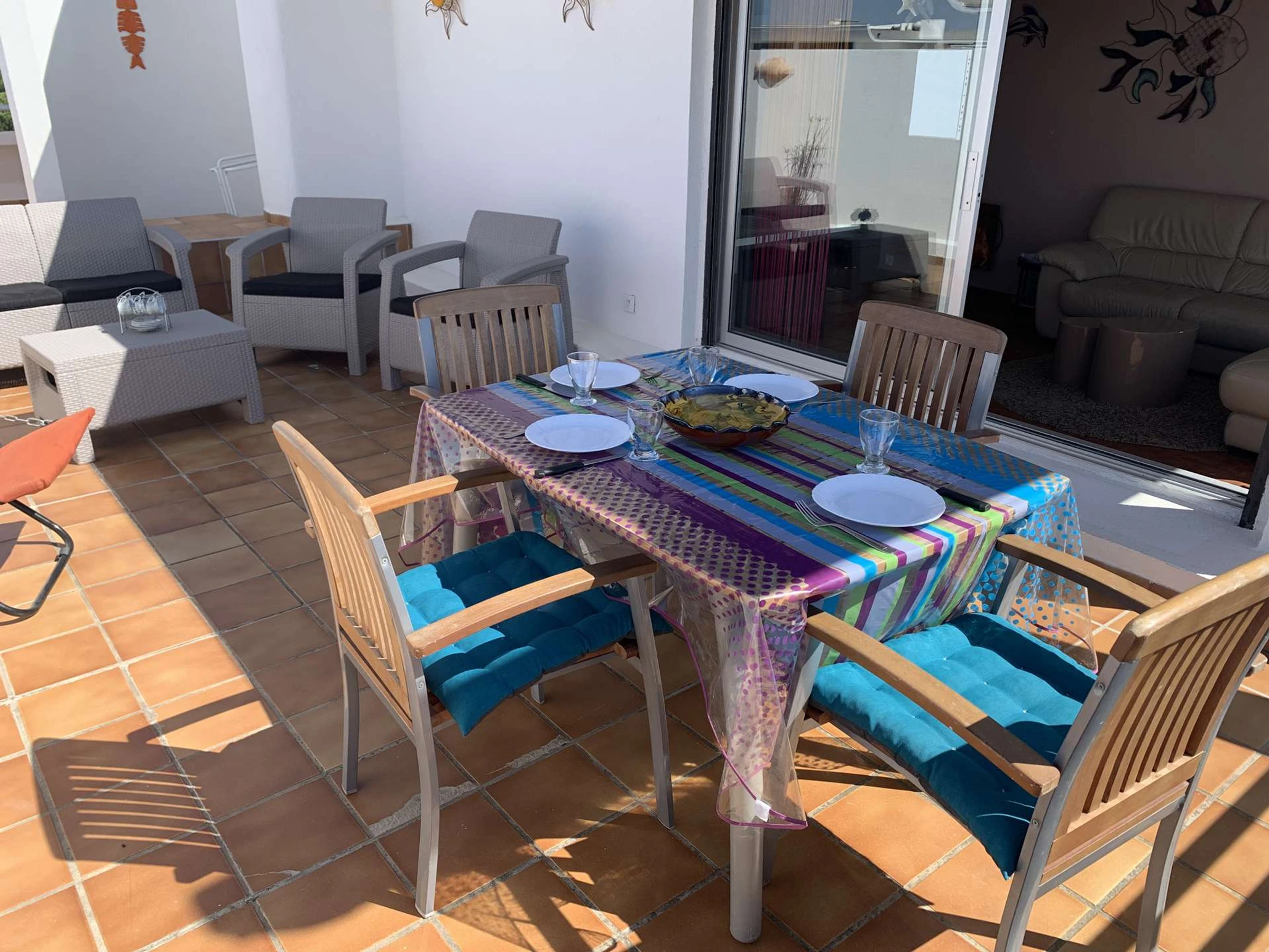 eine große, 45 m² große Terrasse mit Markise und Gartenmöbeln mit Meerblick; Klimaanlage; einen sicheren Privatparkplatz (Zufahrt über ein elektrisches Tor). Das Apartment bietet Platz für 4 bis 6 Personen und ist ideal gelegen, nur wenige Schritte vom Hafen und den Geschäften entfernt.