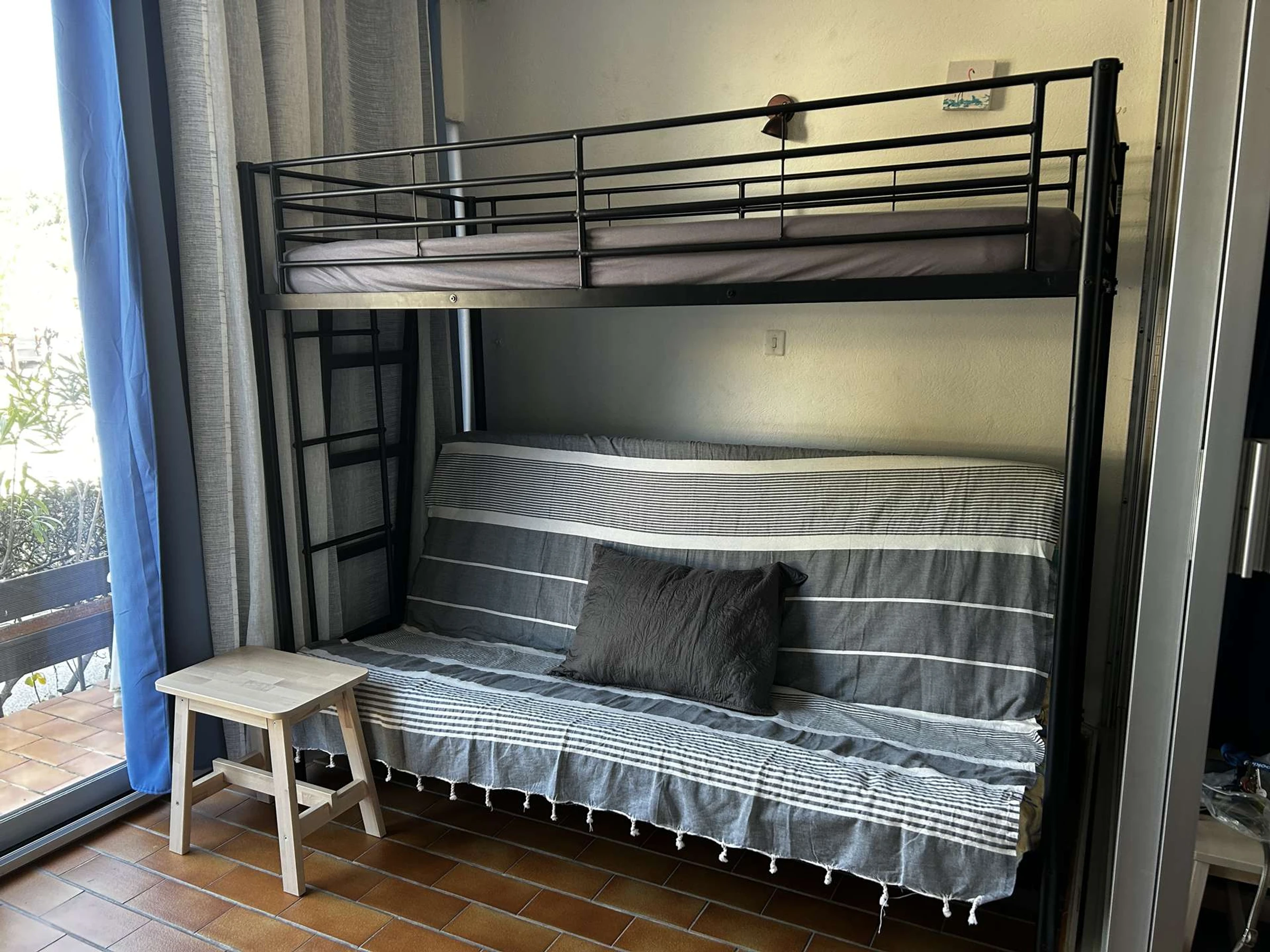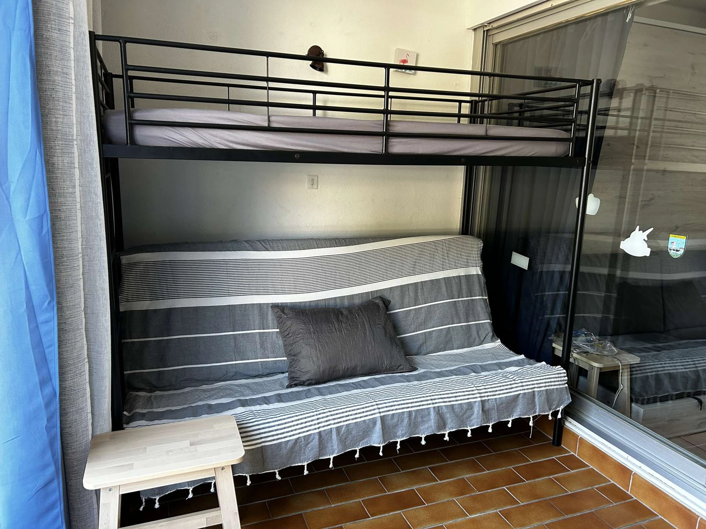 Eine überdachte Loggia bietet einen Esstisch und zwei weitere Schlafplätze (Etagenbetten). Draußen befindet sich eine kleine Terrasse mit Blick auf den sicheren Parkplatz.