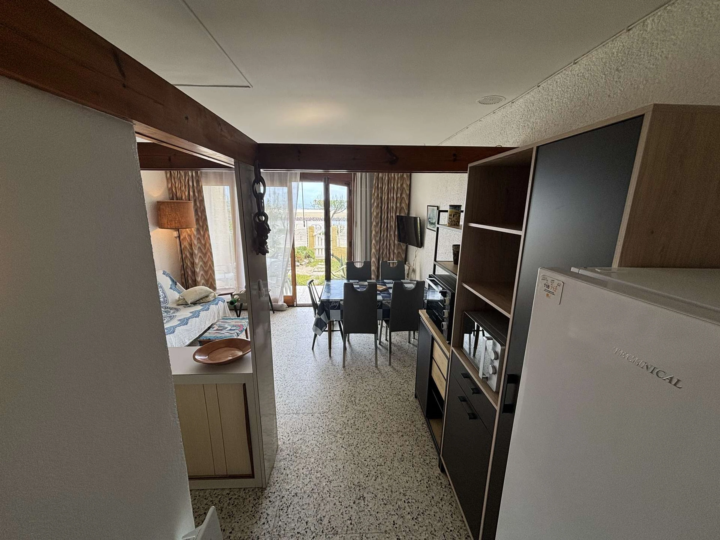 Diese am Meer gelegene Mietunterkunft besteht aus einem Wohnzimmer mit einem 2-Sitzer-Schlafsofa und einem Fernseher, einem ausgestatteten Küchenbereich und einem Schlafzimmer mit einem Doppelbett und einem Einzelbett. Ein Badezimmer mit WC.