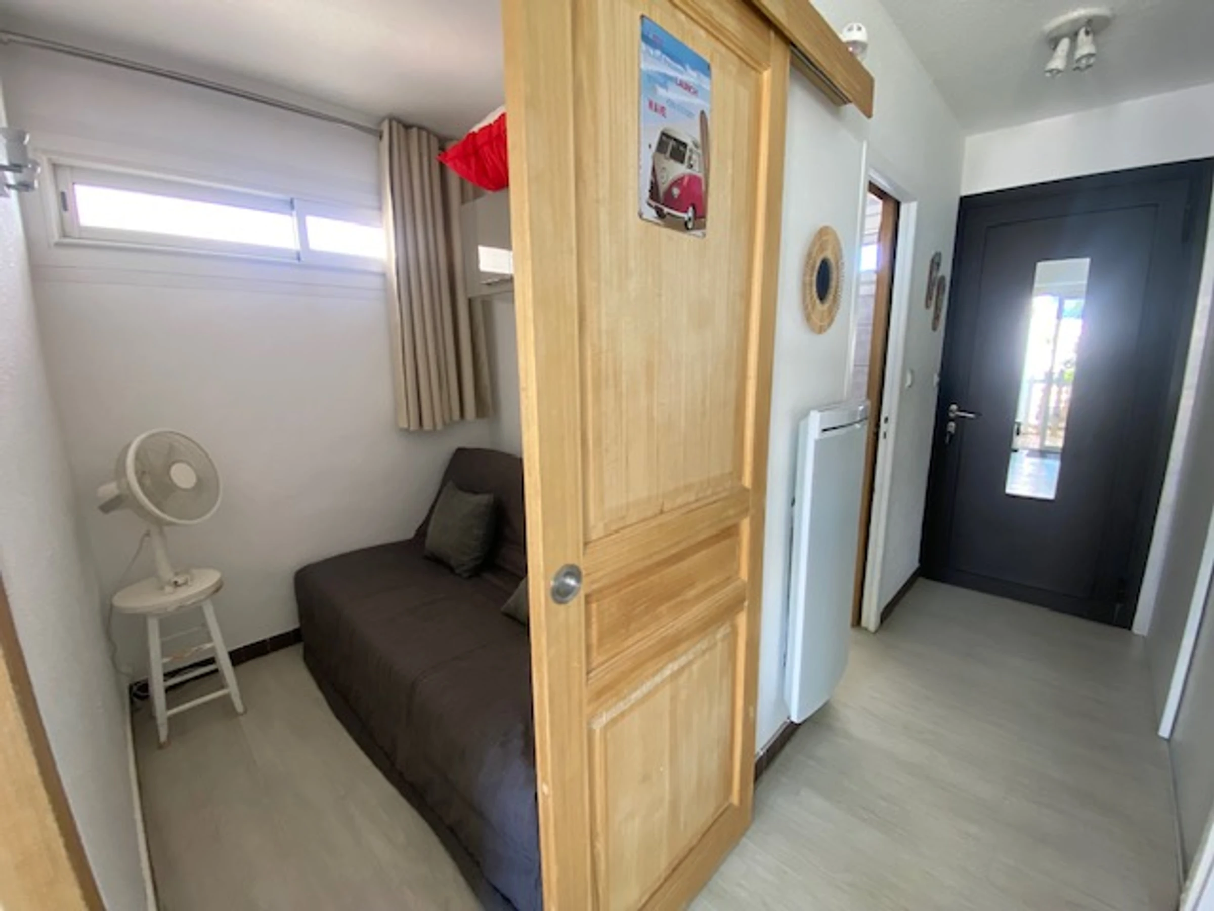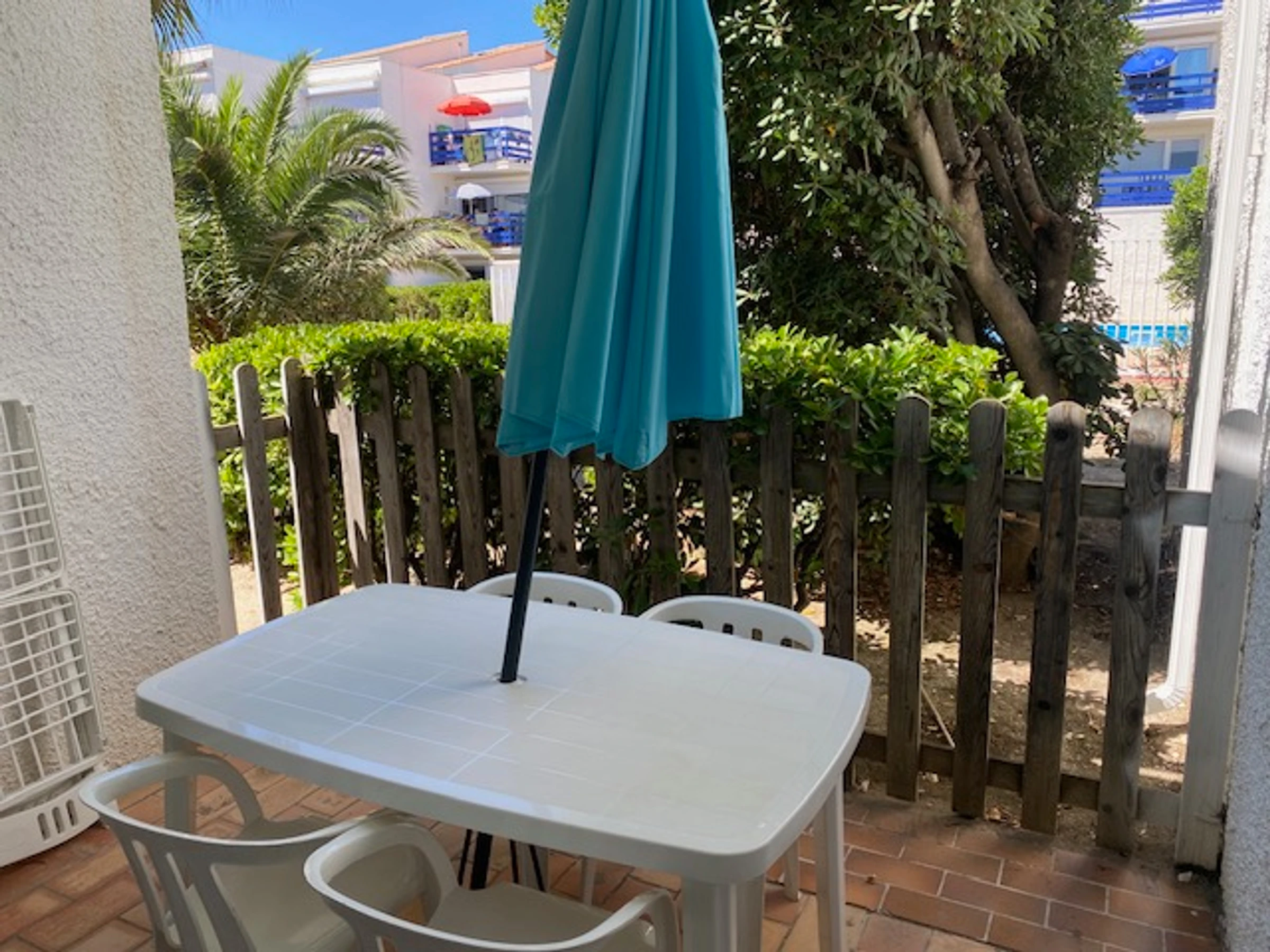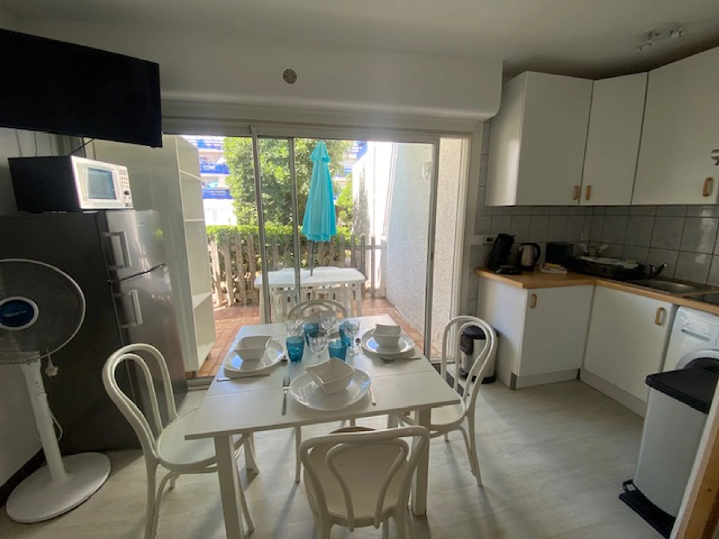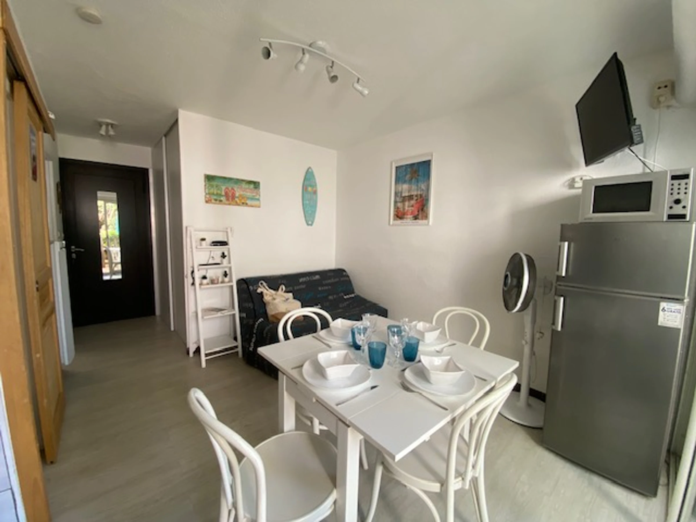 Residenz Etoile du Sud. Für 4 Personen. Komfortables, 20 m² großes Studio-Apartment im Erdgeschoss. Gemeinschaftspool in der Residenz (geöffnet im Juli). Schöne überdachte Terrasse. Wohnzimmer (BZ), ausgestattete Küchenzeile, Schlafbereich in der Kabine (Schlafsofa), Badezimmer mit WC. 150 m vom Strand entfernt.