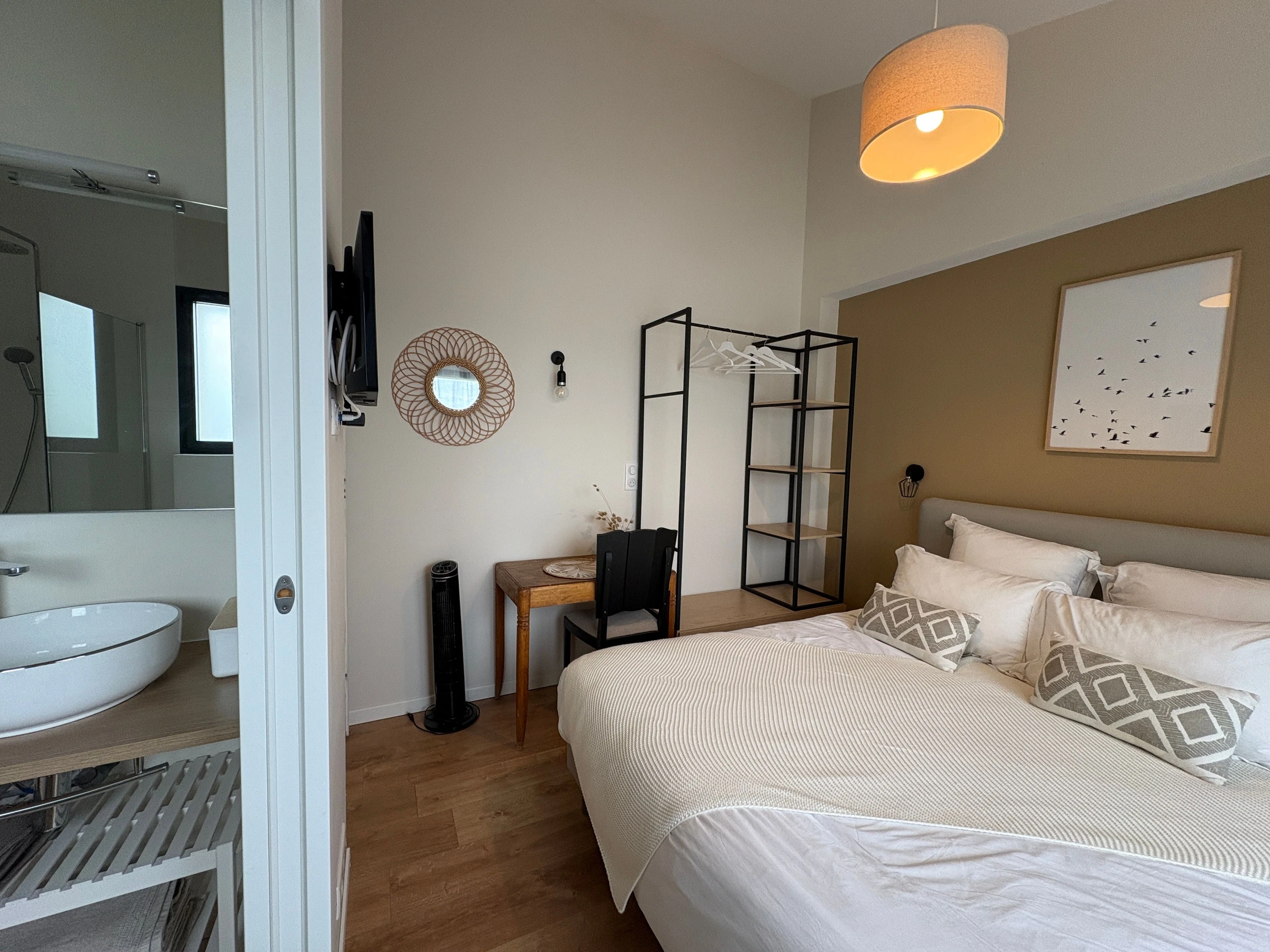 Ebenerdige Gîte: offene Küche zum Wohnzimmer (hochwertiges 160 x 200 cm großes Schlafsofa), Duschbad, separates WC, 1 Schlafzimmer (160 x 200 cm großes Bett) mit angrenzendem Bad/WC.