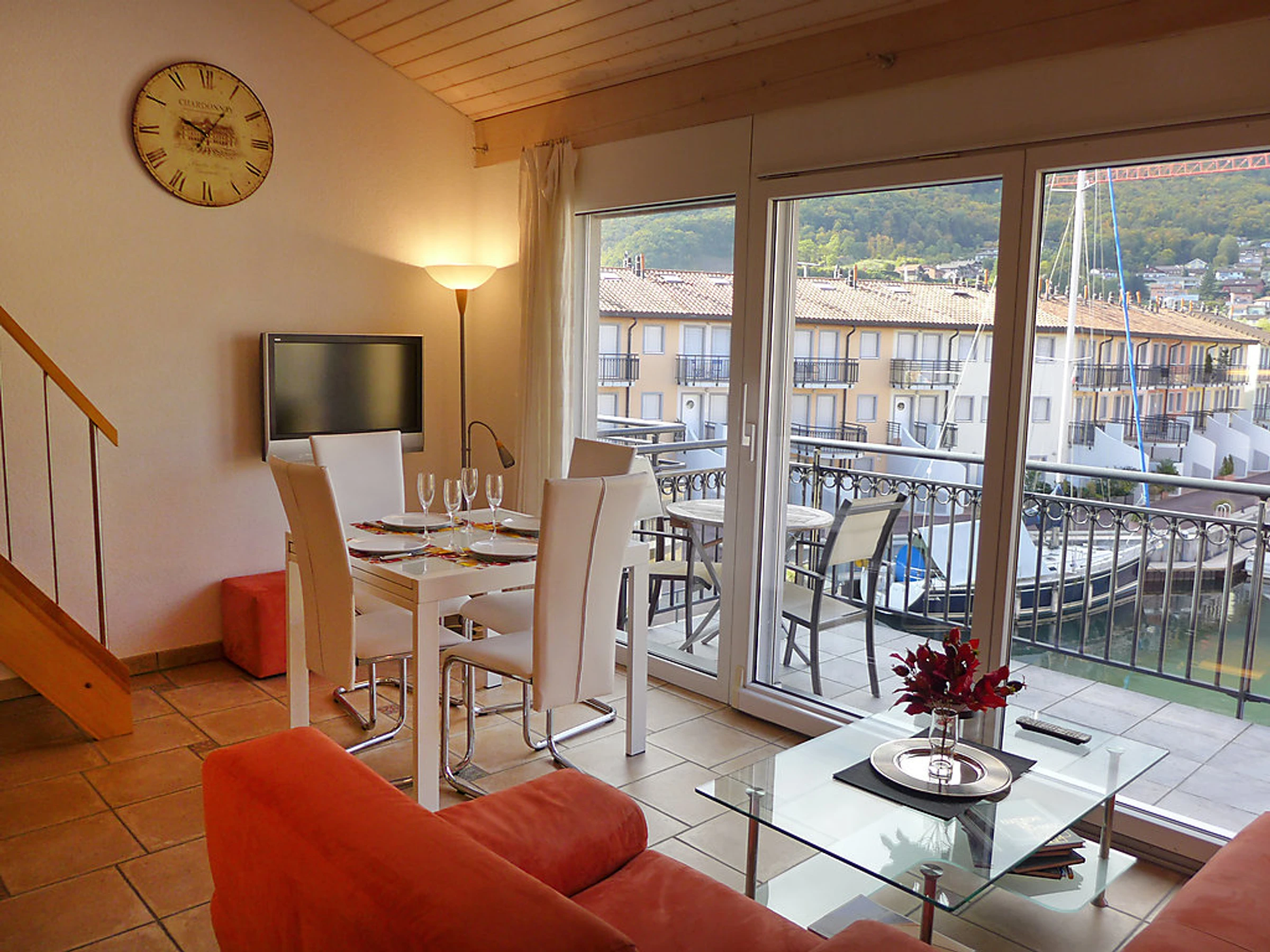 Komfortable Ferienanlage. Am Ortsrand, 300 m vom Zentrum von Le Bouveret, ruhige, sonnige Lage, 300 m vom Waldrand, 200 m vom See, 50 m vom Kanal. Zur Mitbenutzung: Kinderspielplatz (Rutschbahn). Wäschewechsel (zusätzlich extra). Getränkeservice. Einkaufsgeschäft, Lebensmittelgeschäft 800 m, Restaurant, Bäckerei 500 m, Fahrradverleih 100 m, Bahnstation "Le Bouveret" 300 m, Kieselstrand 200 m, Freibad, Hallenbad 300 m, Thermalbad 30 km, Strandbad 300 m, Badesee "Léman" 300 m. Sporthafen 200 m, Golfplatz (18 Loch) 15 km, Tennis 200 m, Minigolf 12 km, Reitstall 11 km, Wanderwege ab Haus 300 m, Bergbahn 15 km, Skipisten 18 km, Skischule 18 km, Kinderskischule 35 km, Schlittelbahn 29 km, Langlaufloipe 35 km, Eisfeld 18 km. Nahe gelegene Sehenswürdigkeiten: Parc Aventure. Bekannte Skigebiete sind gut erreichbar: Les Portes du Soleil 18 km, Villars 35 km, Leysin 31 km. Bekannte Seen in der Umgebung sind gut erreichbar: Lac Léman. Bitte beachten: private Bootsanlegestelle (extra) auf Anfrage. Aquapark 300 m, Swiss Vapeur Parc 100 m, Leman Forest 12 km, Parc Aventure 17 km. Im -Büro in La Marina sind Eintrittskarten für den Swiss Vapeur Parc mit 25% Ermässigung und den Aquapark mit 30% Ermässigung erhältlich. Alle Wohnungen mit Bodenheizung. Die Residenz "Cook" verfügt über einen Aufzug.