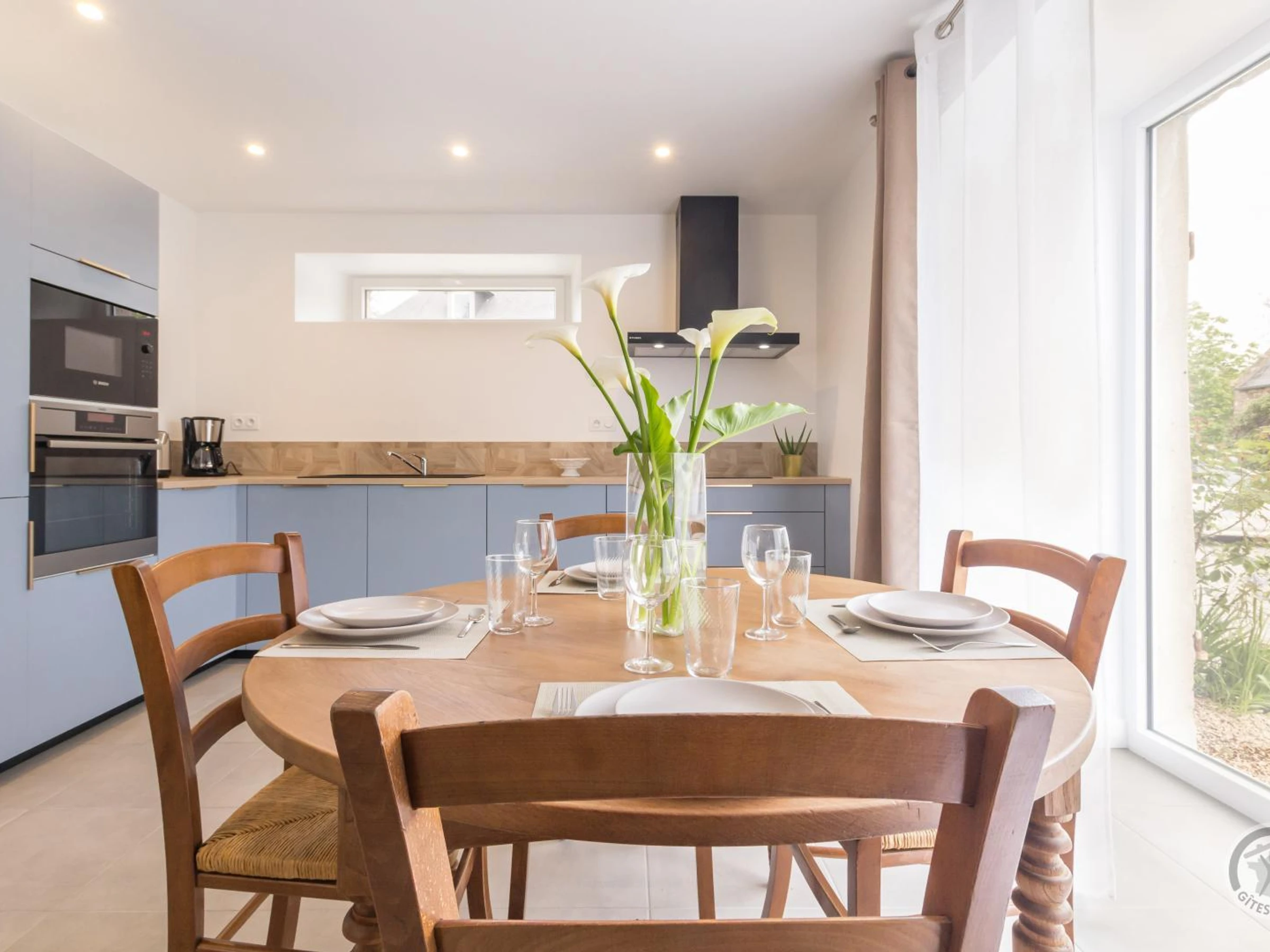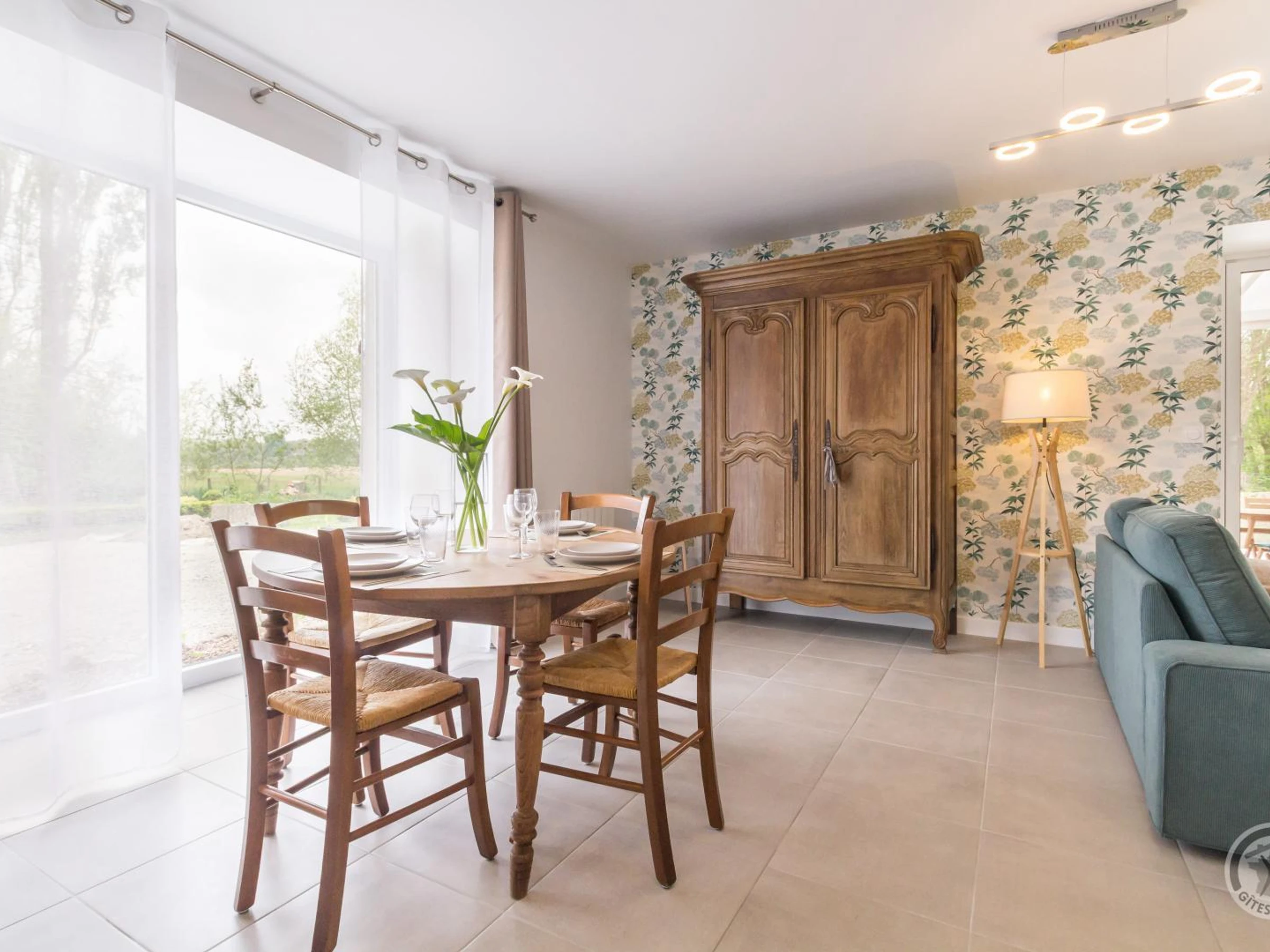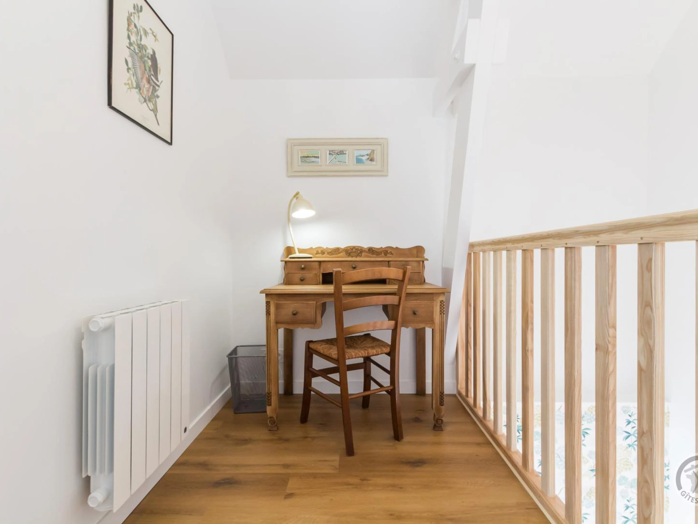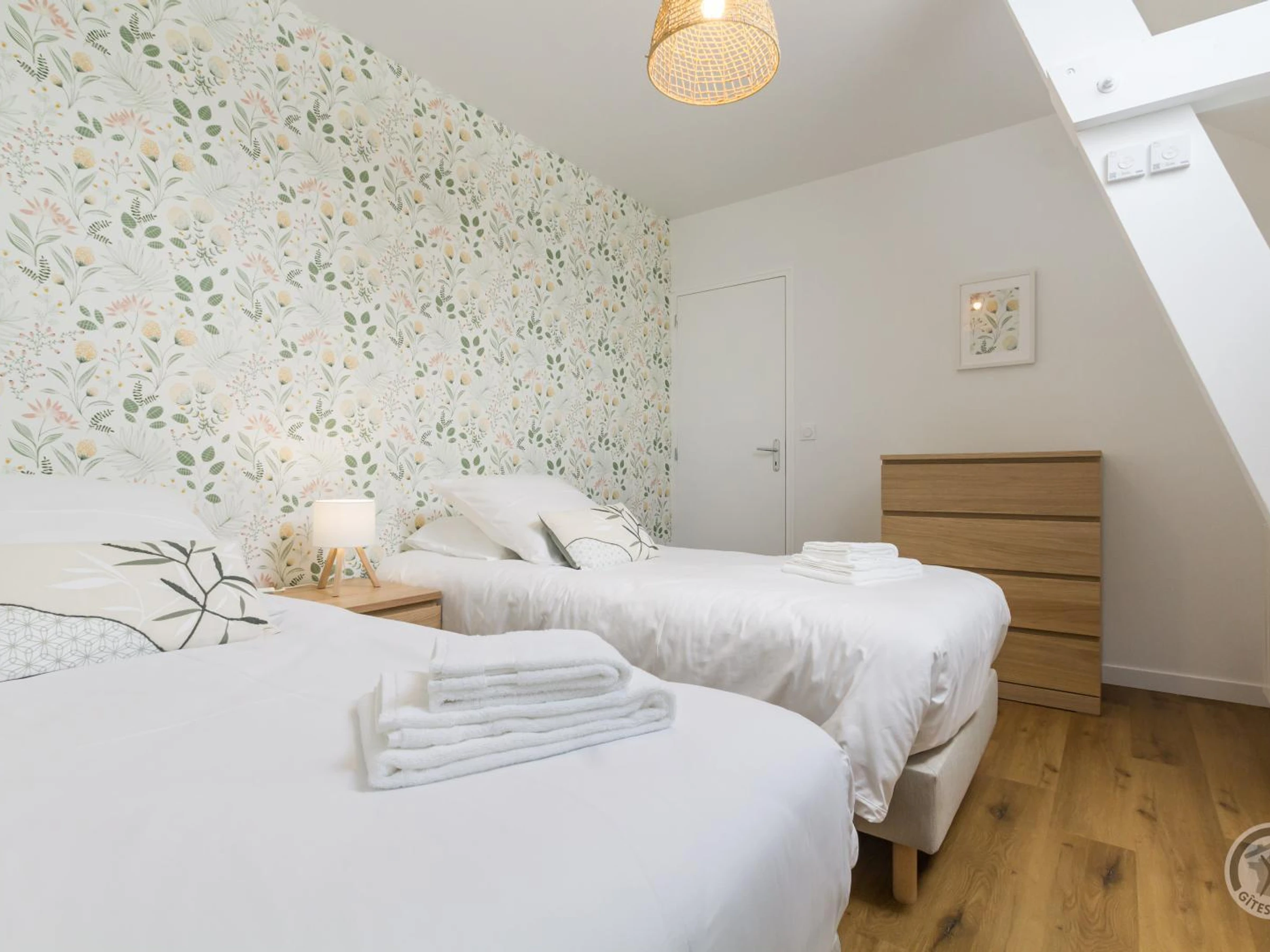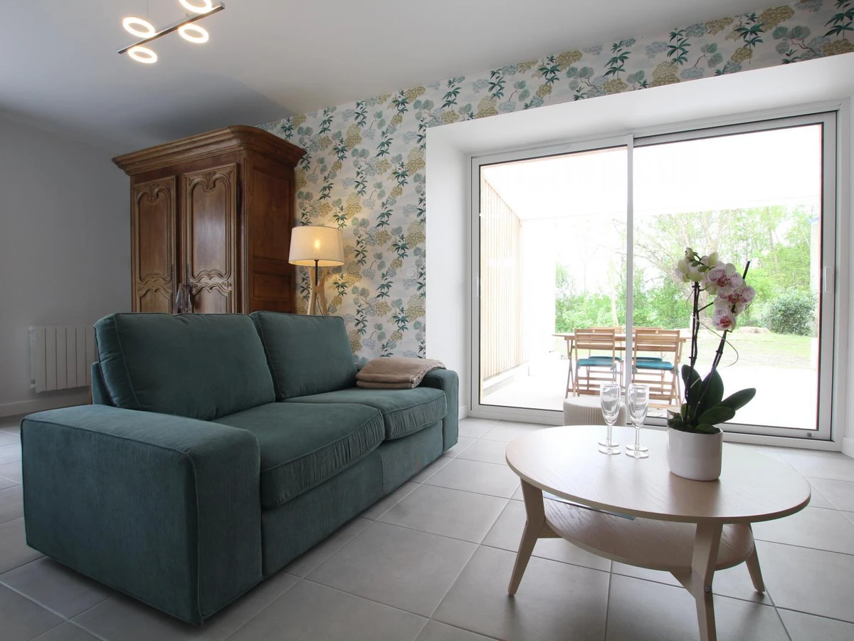 Doppelhaushälfte. Im Erdgeschoss: Eingangshalle (Waschmaschine). Wohnzimmer (Smart-TV, ADSL-Internet). Offene Küche (Induktionskochfeld, Dunstabzugshaube, Espressomaschine, Geschirrspüler, Elektroherd, Mikrowelle, Kühl-/Gefrierkombination). WC. Obergeschoss: Treppenabsatz mit Bürobereich. Schlafzimmer 1 (Bett 160x200). Schlafzimmer 2 (2 Einzelbetten 90x200). Duschraum mit WC (Waschbecken, begehbare Dusche, Handtuchwärmer, Föhn). Außenbereich: Gemeinsamer, nicht eingezäunter Garten. Gemeinsamer Hof mit Parkplatz. Private, überdachte Terrasse. Gartenmöbel. Liegestühle. Plancha. Teich vor Ort. Überdachter Unterstand (Fahrräder und Motorräder). Elektroheizung inklusive. Bettwäsche und Handtücher werden gestellt (Betten bei Ankunft gemacht). Bei längeren Aufenthalten wöchentlicher kompletter Wäschewechsel. Optionaler Reinigungsservice gegen Aufpreis. Babyausstattung auf Anfrage. Ein Haustier mit Zustimmung des Eigentümers erlaubt. Das Domaine les Sources in Portbail-sur-Mer an der Westküste der Halbinsel Cotentin bietet eine authentische Umgebung und Ruhe. Mit einem 8.000 m² großen Park und einem Teich können Sie durch die schattigen Gärten schlendern oder am Wasser entspannen. Carole, die Eigentümerin, die auch die Gästezimmer im Haupthaus verwaltet, hat kürzlich die alten Stallungen restauriert und bietet zwei weitere Ferienhäuser für vier Personen an: Paul und Justine. Sie freut sich darauf, Sie willkommen zu heißen und Ihnen diese Oase der Ruhe zu zeigen! Ein Bonus: Der Wanderweg GR223 und der Greenway befinden sich direkt neben dem Anwesen für Wanderfreunde. Genießen Sie eine Meeresfrüchteplatte (Reservierung erforderlich).