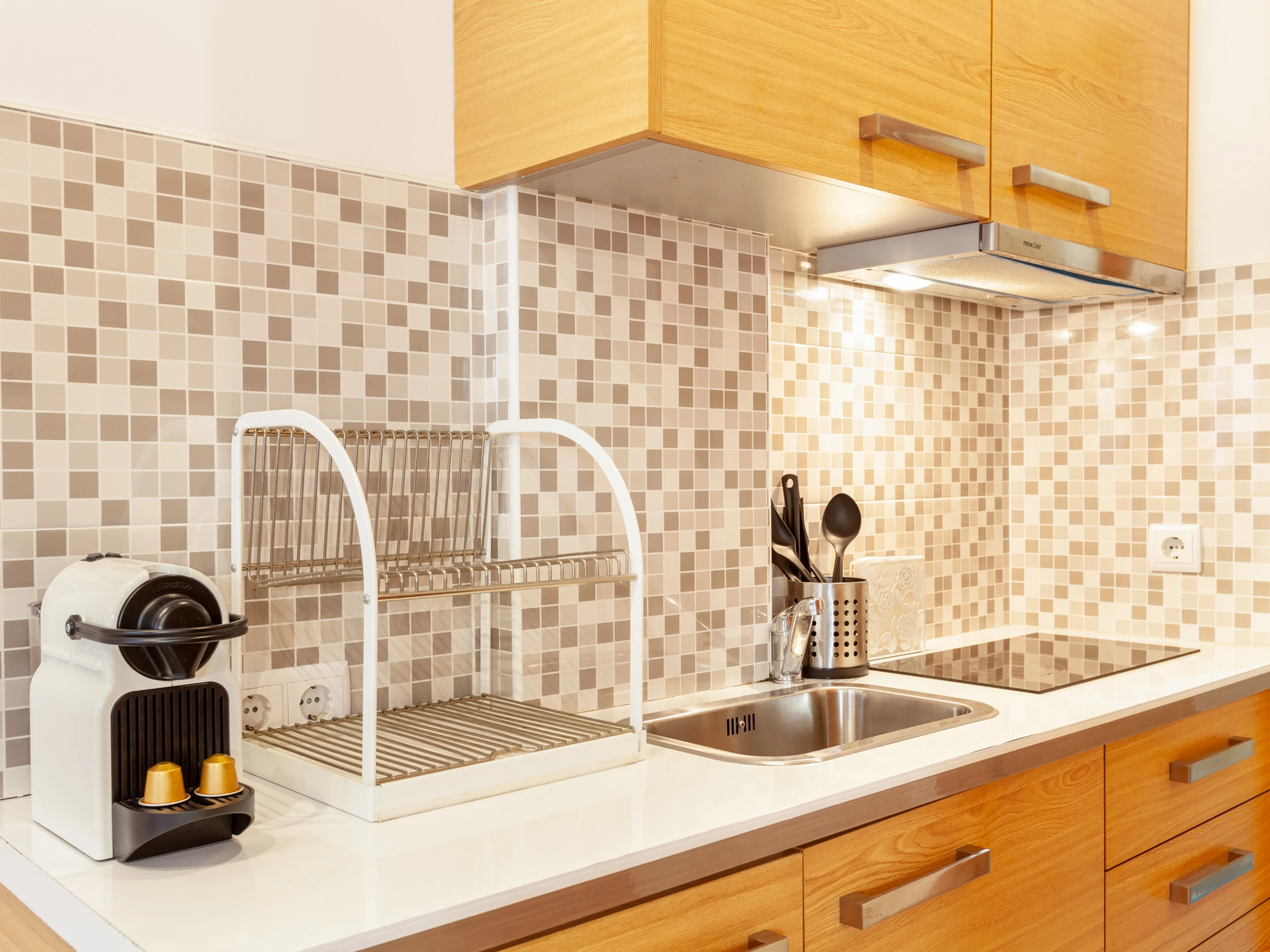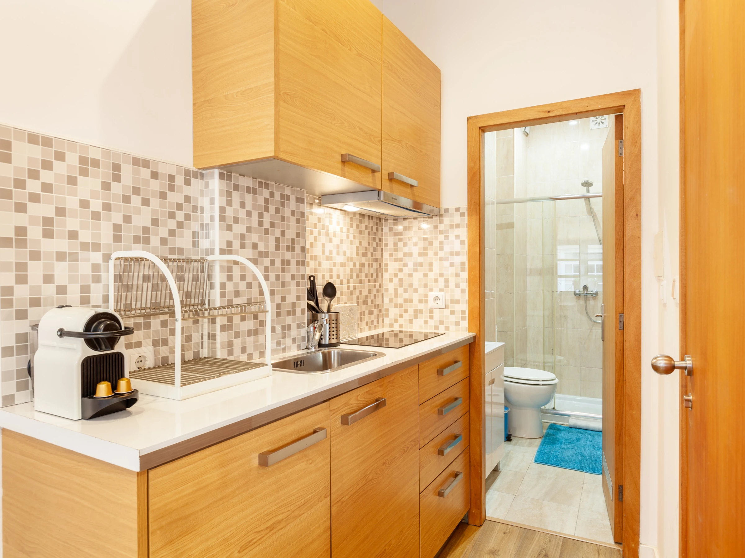 Dieses küche, mit ceranfeld, ist ausgestattet in kühlschrank, mikrowelle, geschirr/besteck, kochutensilien, kaffeemaschine, toaster, wasserkocher und küchengeschirr.