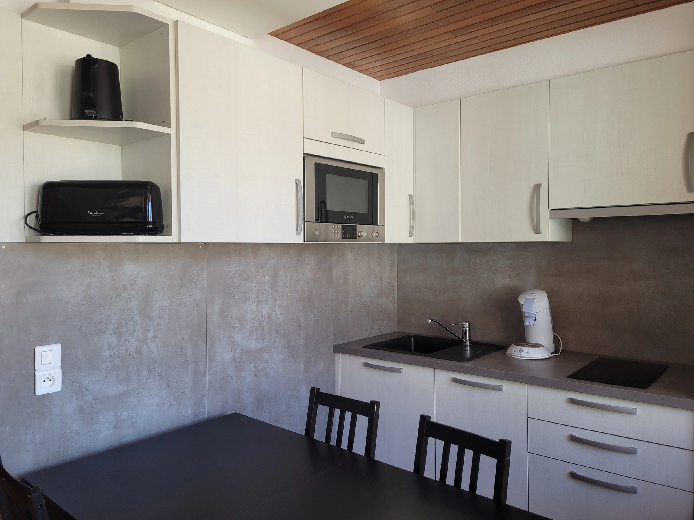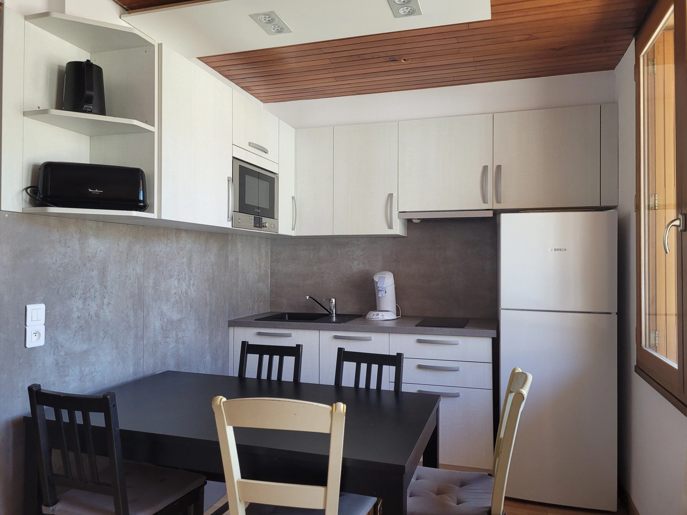 * Offene Küche mit Essbereich: Kühlschrank mit Gefrierfach, Induktionskochfeld, Geschirrspüler, Mikrowelle, Wasserkocher, Toaster, Senseo-Kaffeemaschine, Raclette;
