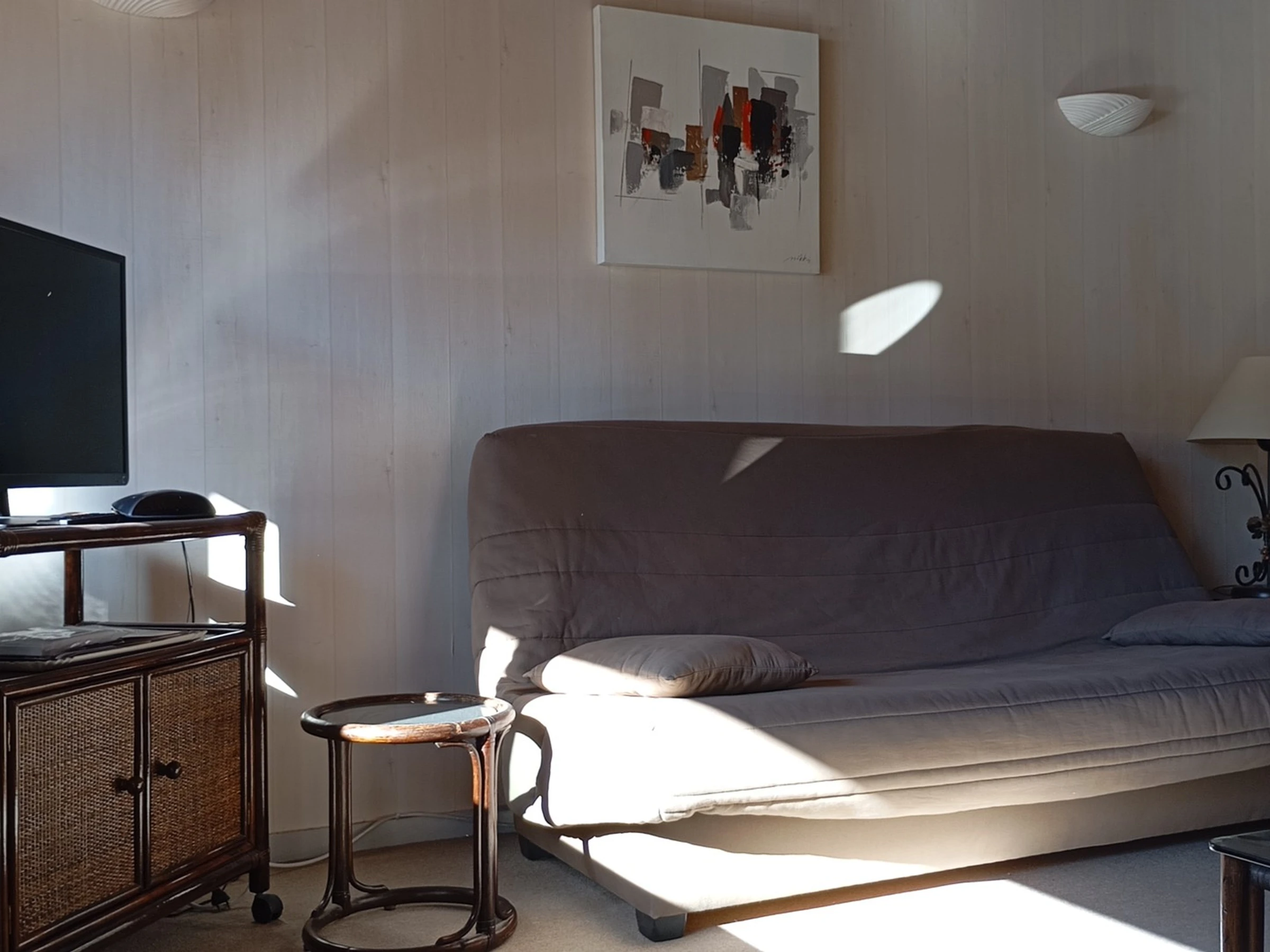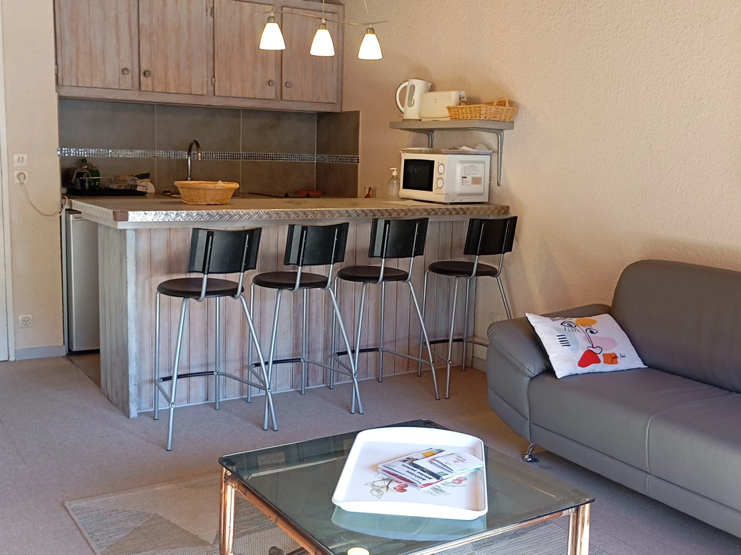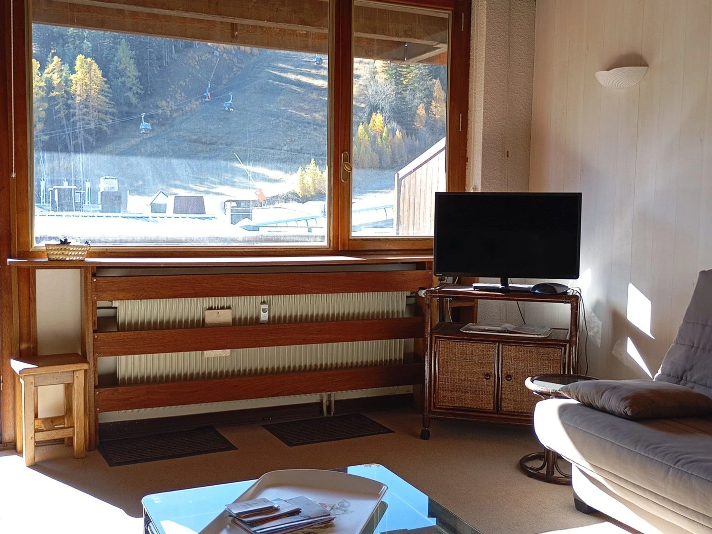 Studio für 4 Personen, ca. 31 m². Im 4. Stock mit Aufzug. Südlage mit Balkon und Blick auf die Pisten und den Berg „Pain de Sucre“.