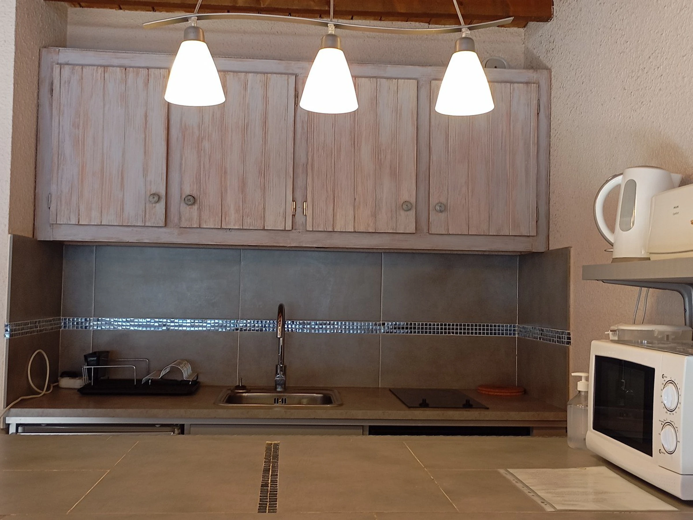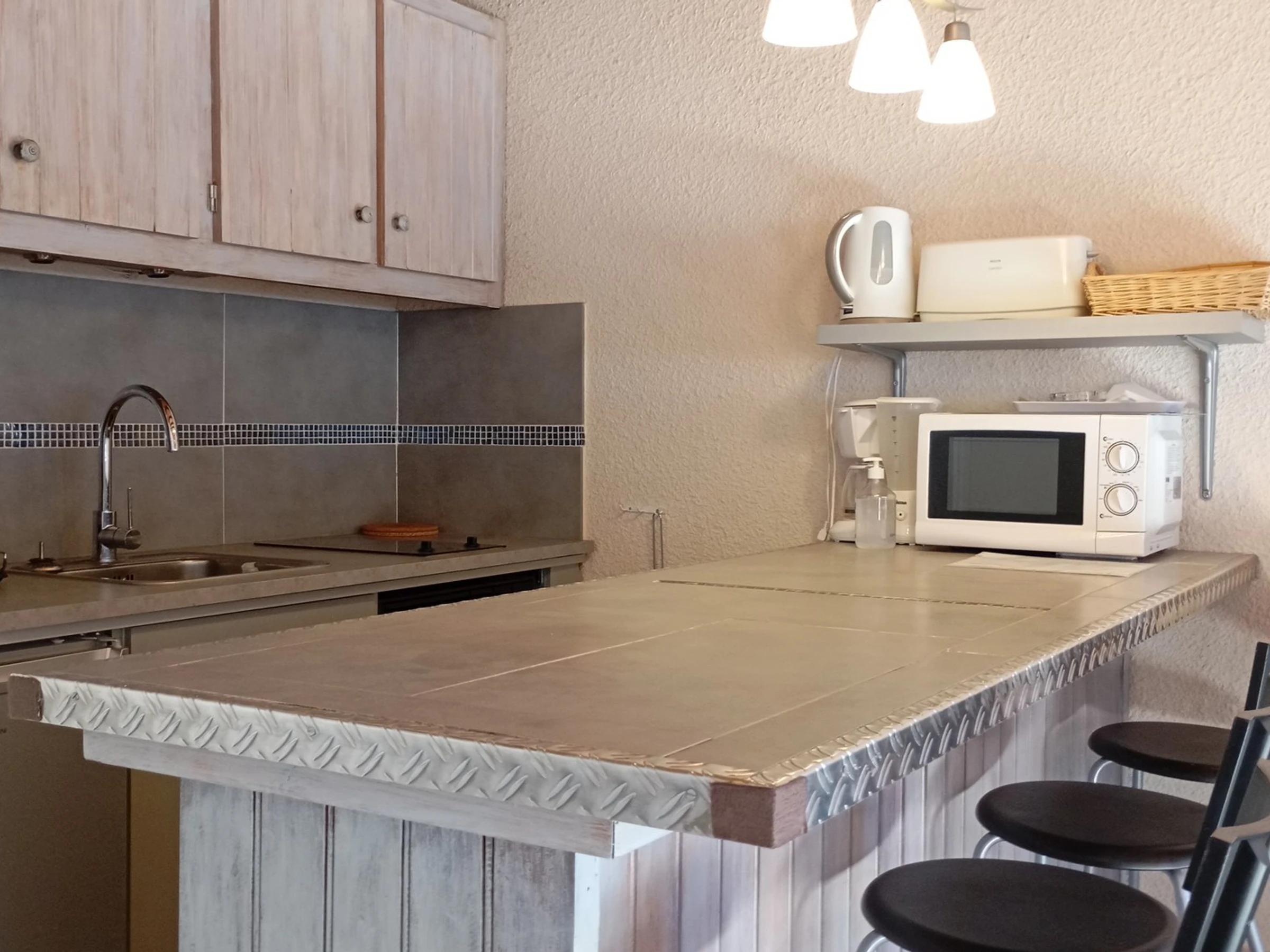 * Offene Küche: Mikrowelle, Backofen, kleiner Kühlschrank, Kaffeemaschine, Toaster, Wasserkocher, Raclette-Gerät, 2 Glaskeramik-Kochfelder, Schränke;