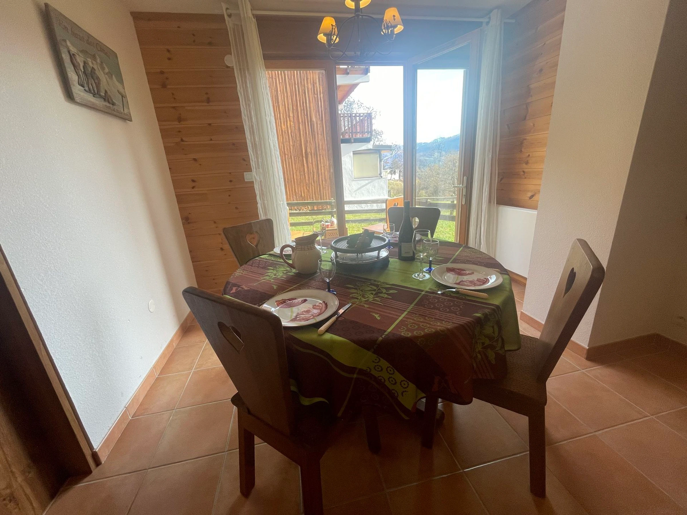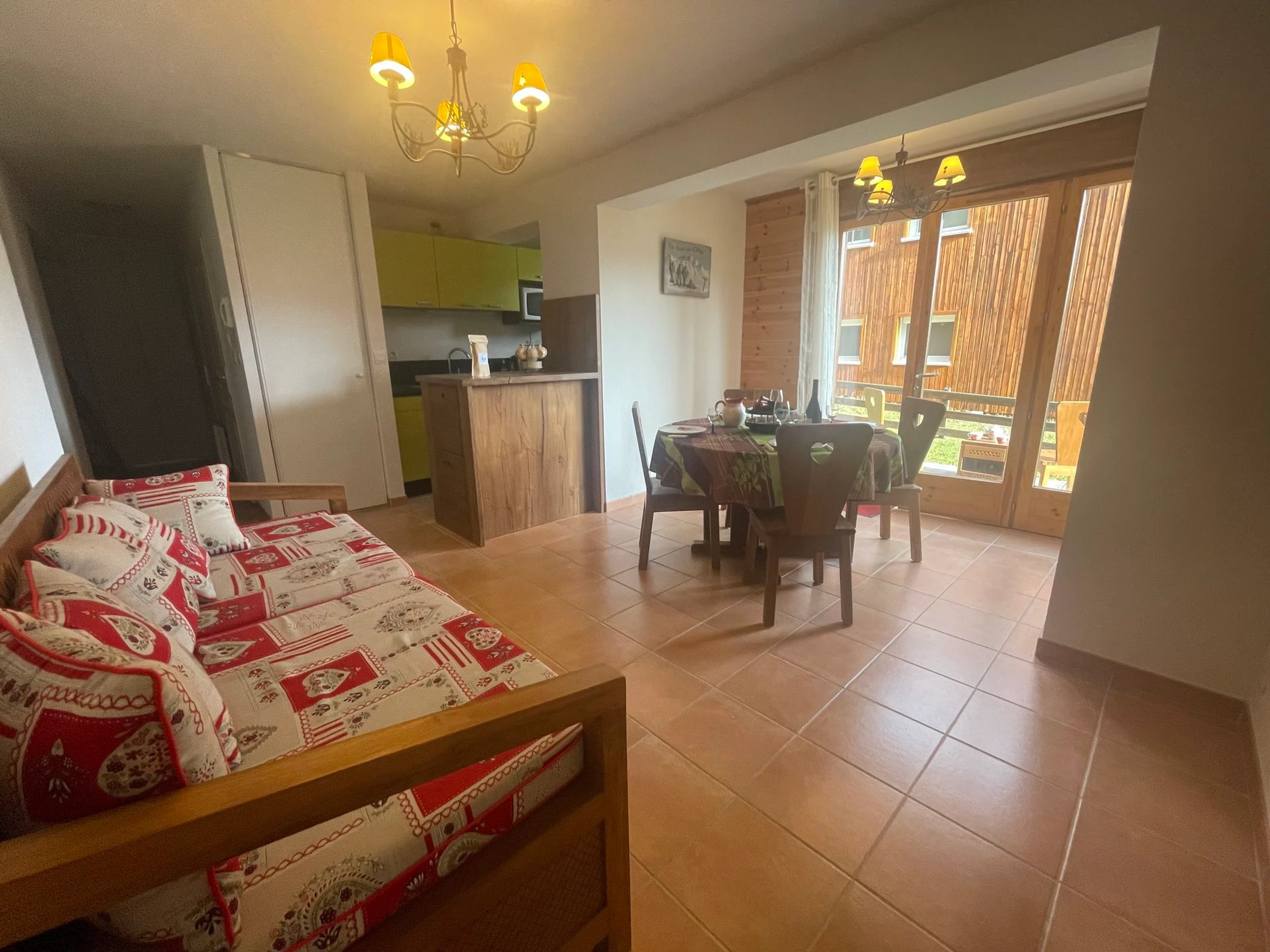 Ein helles Wohnzimmer mit Zugang zu einer großen Terrasse und einem privaten Garten – perfekt zum Entspannen nach einem Tag auf der Piste oder einer Wanderung.
